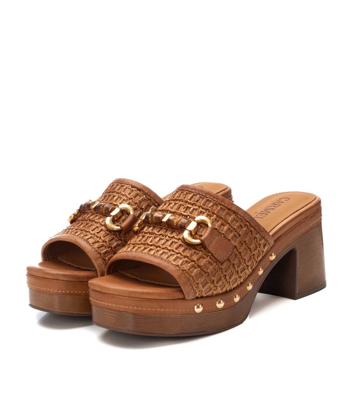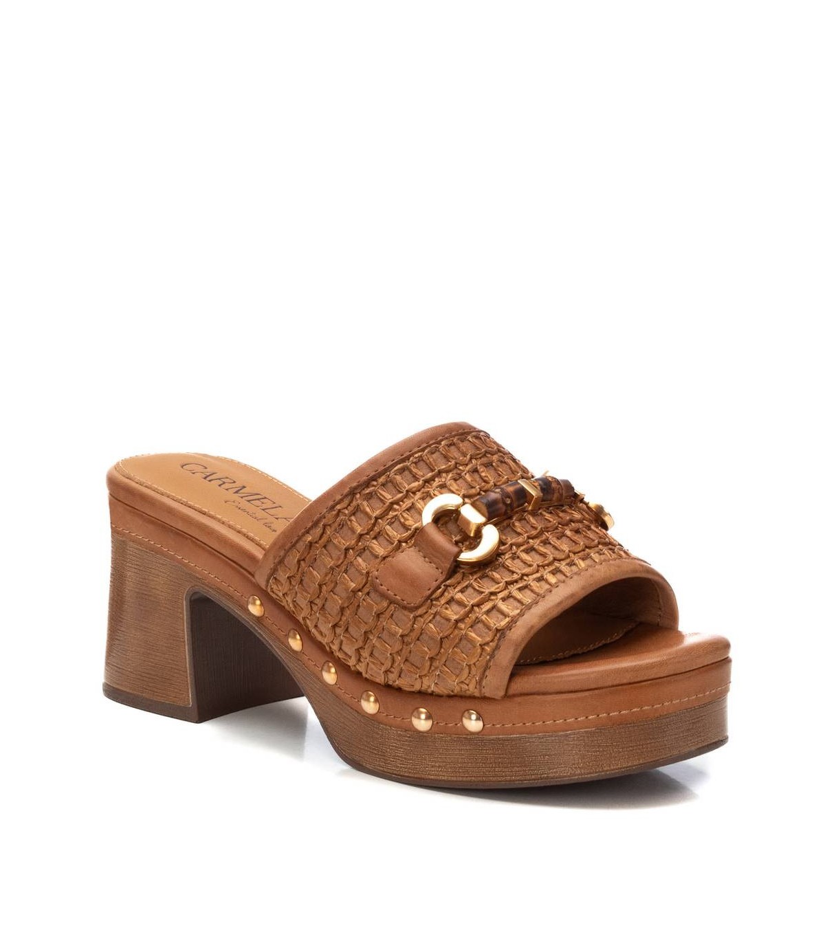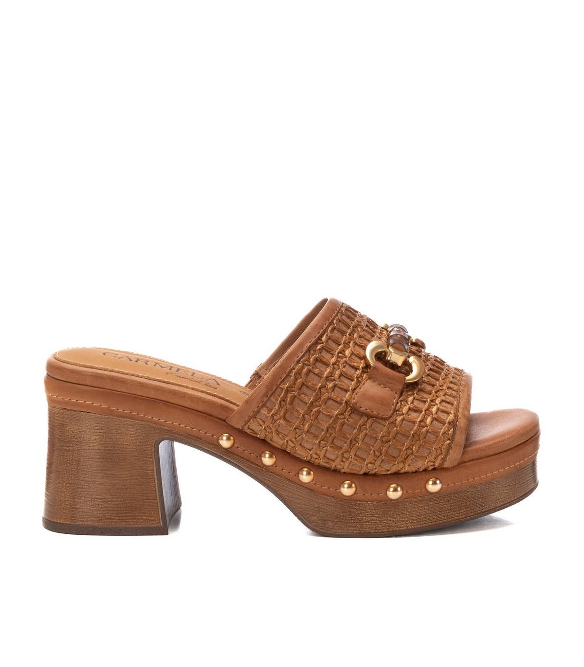 Sandalia de mujer, de la marca Carmela. Modelo estilo zueco ideal para esta temporada. Piso con acabado madera y suela antideslizante.