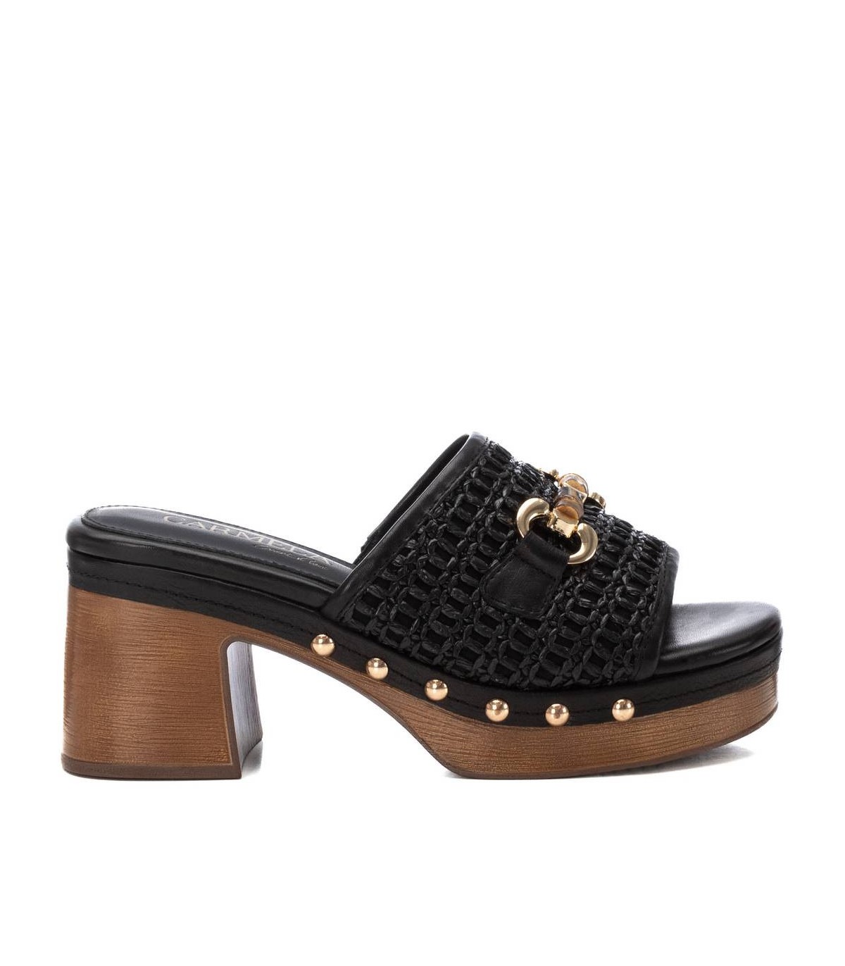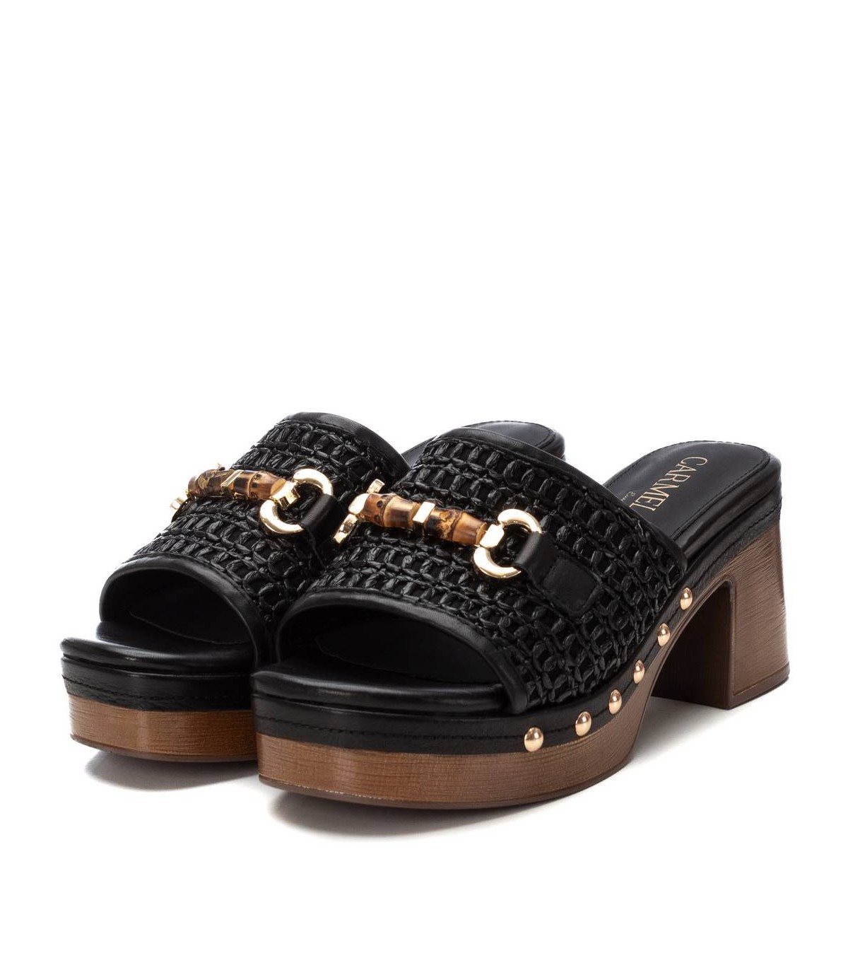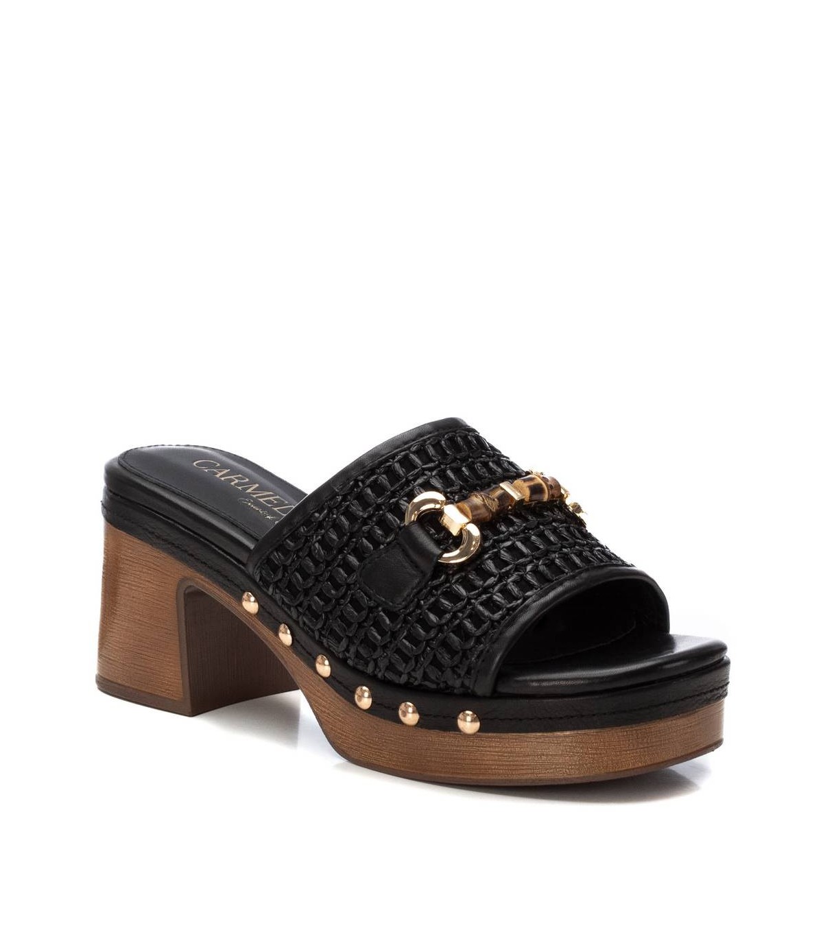 Sandalia de mujer, de la marca Carmela. Modelo estilo zueco ideal para esta temporada. Piso con acabado madera y suela antideslizante.