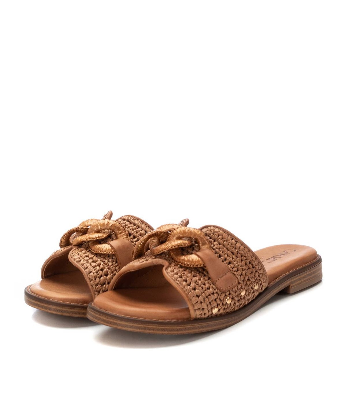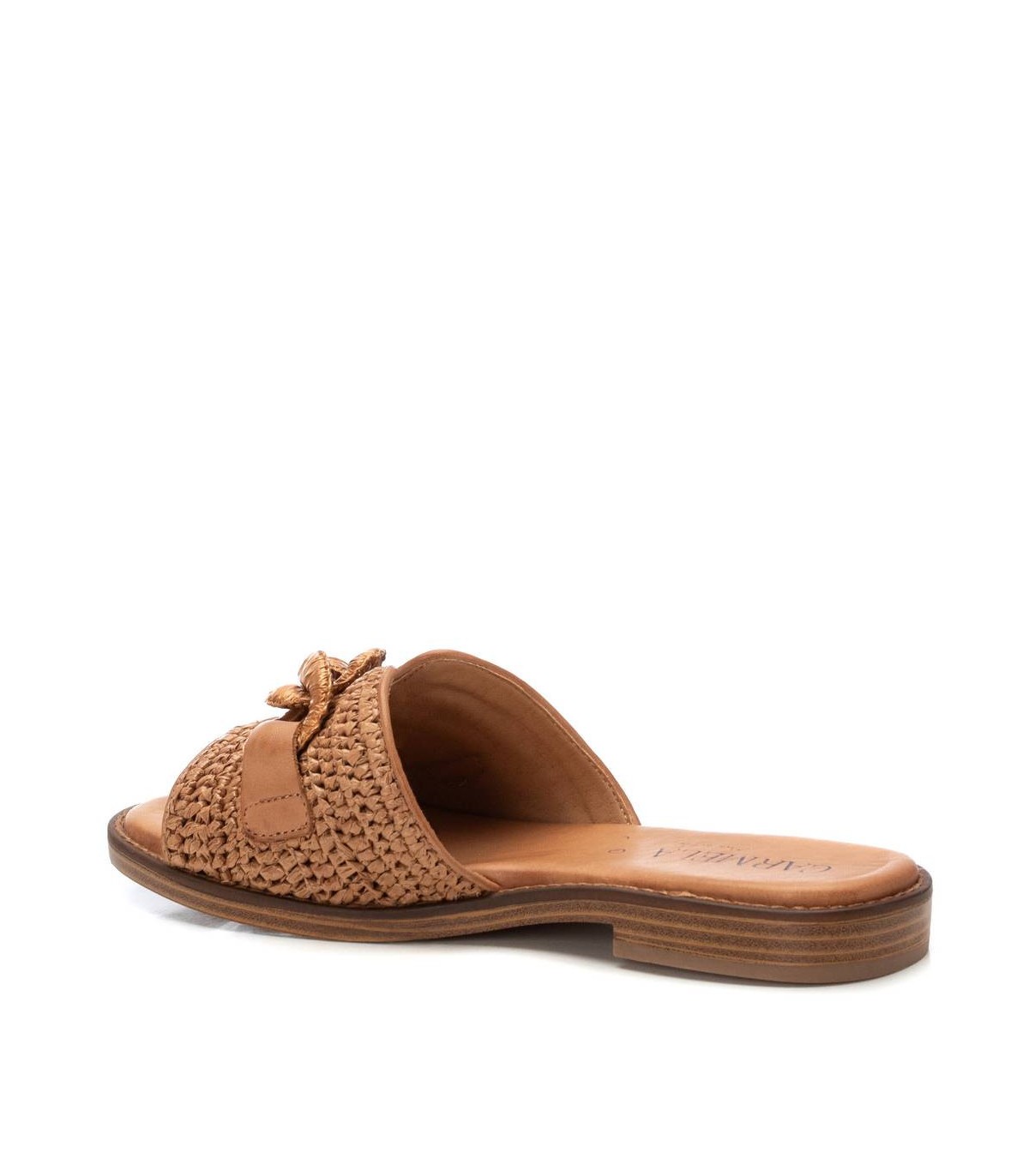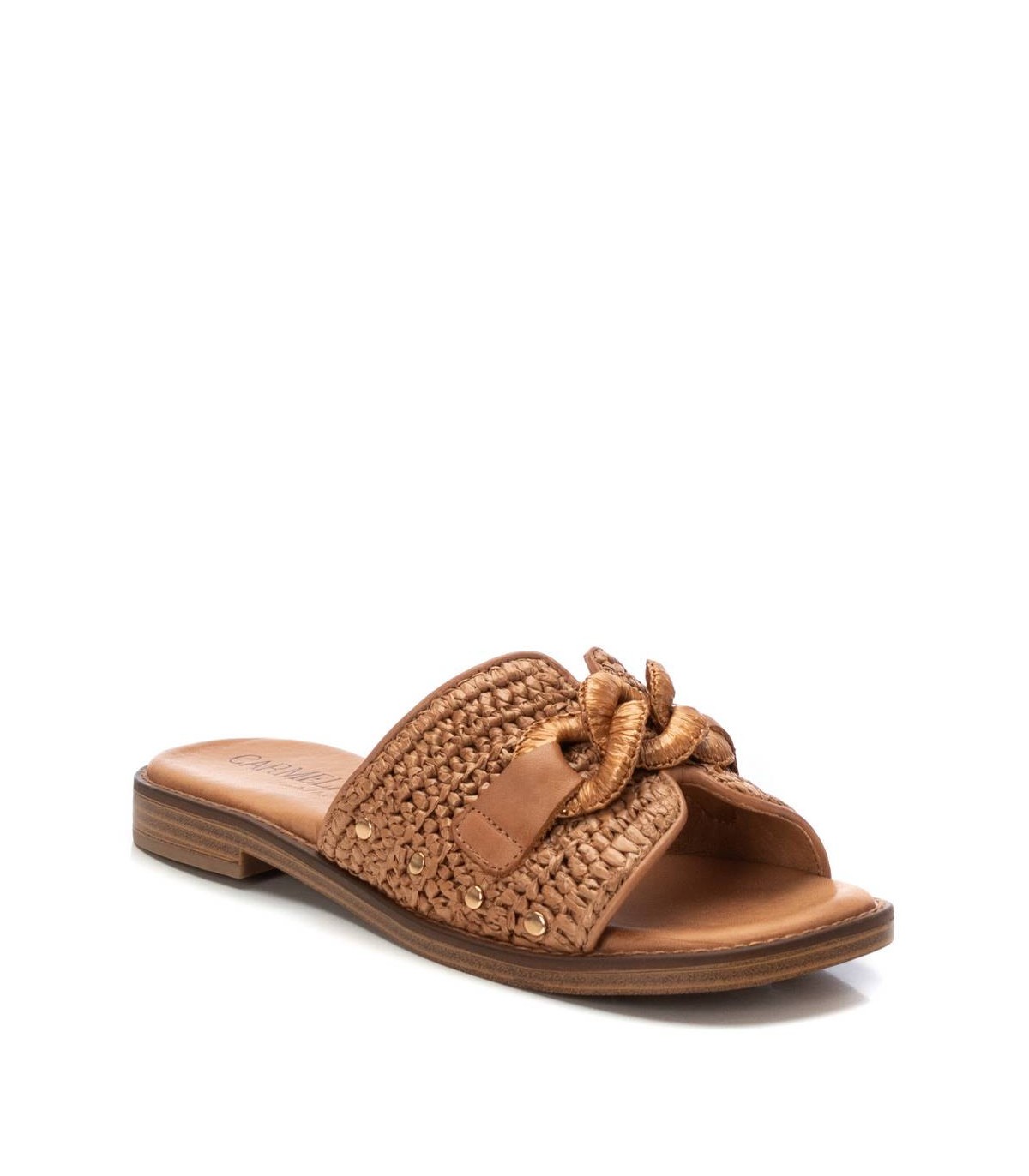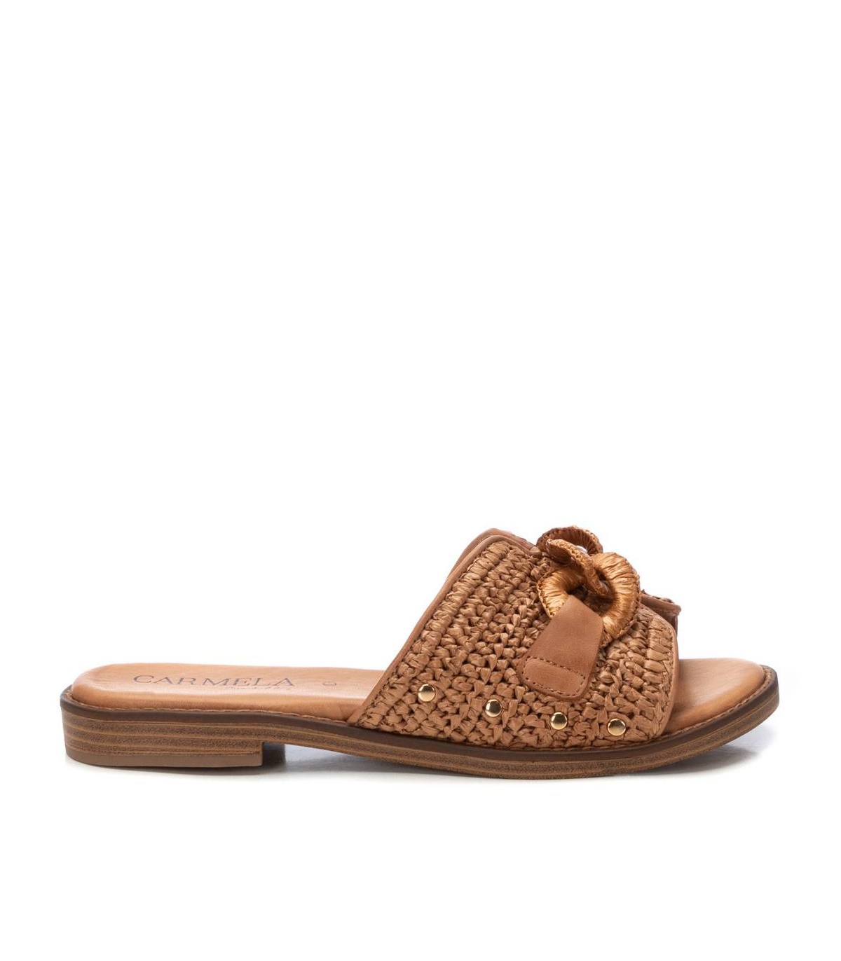 Sandalia de mujer, marca Carmela. Fabricada en rafia de alta calidad. Diseño de pala con adorno al tono decorativo al frente. Cómoda planta y suela antideslizante. Para vestir cómoda y elegante esta temporada.