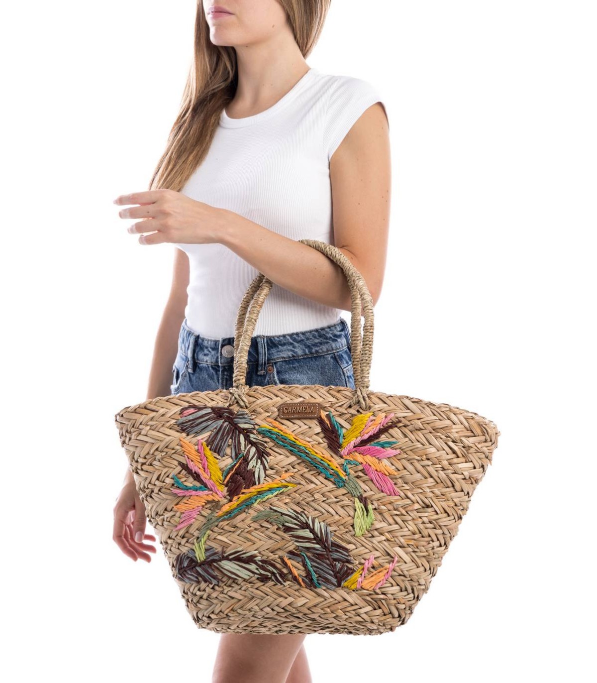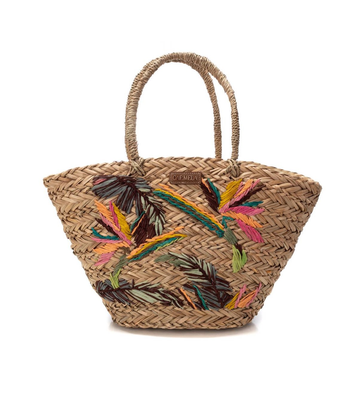 Bolso grande, marca Carmela. Cierre mediante cremallera. Fabricado en rafia y diseño veraniego con distintos tonos. Doble asa de mano. Bolso perfecto para las más exigentes. Medidas 30x39x10cm. Este modelo ha obtenido el certificado vegano por la organización mundial PETA (Organización de los derechos de los animales).