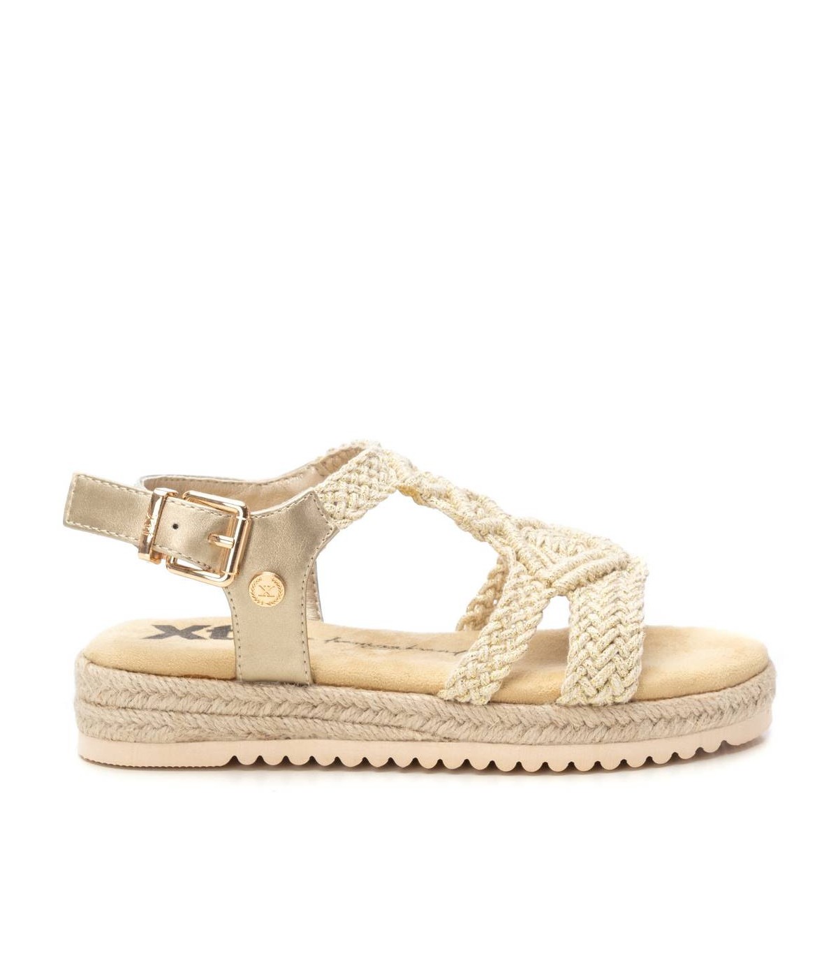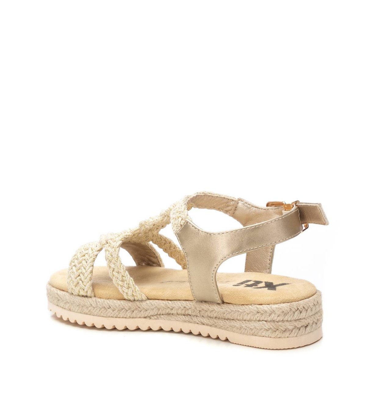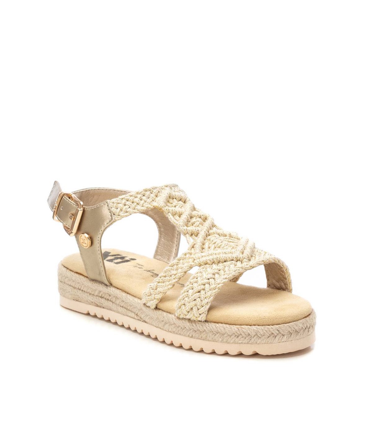Sandalia de niña, de la marca Xti Kids. Fabricada en material textil, tipo crochet. Pulsera con material que imita la piel con hebilla metálica al tobillo para mayor sujeción. Cuña de yute con suela de goma antideslizante. Ideal para los looks más veraniegos. Este modelo ha obtenido el certificado vegano por la organización mundial PETA (Organización de los derechos de los animales).