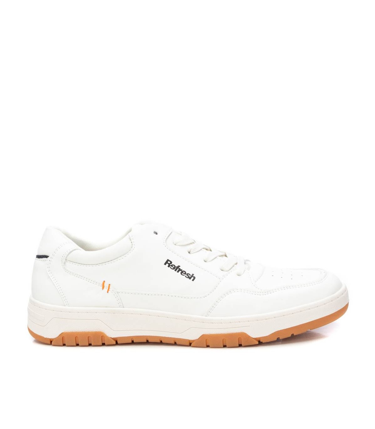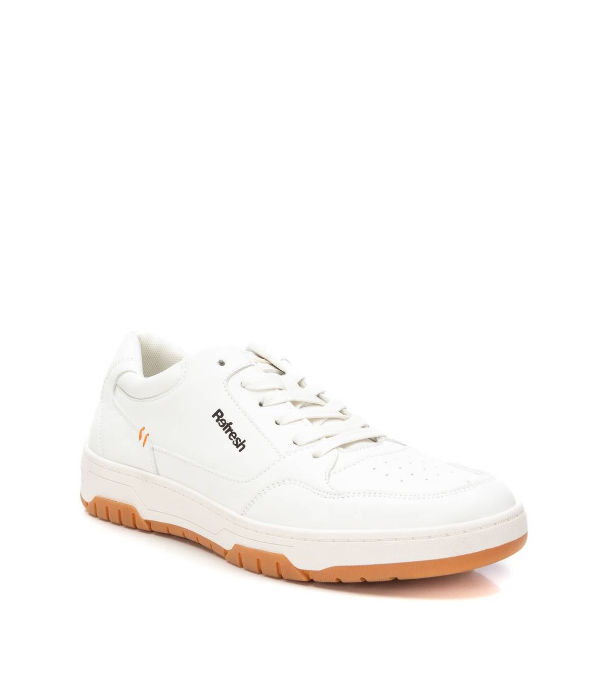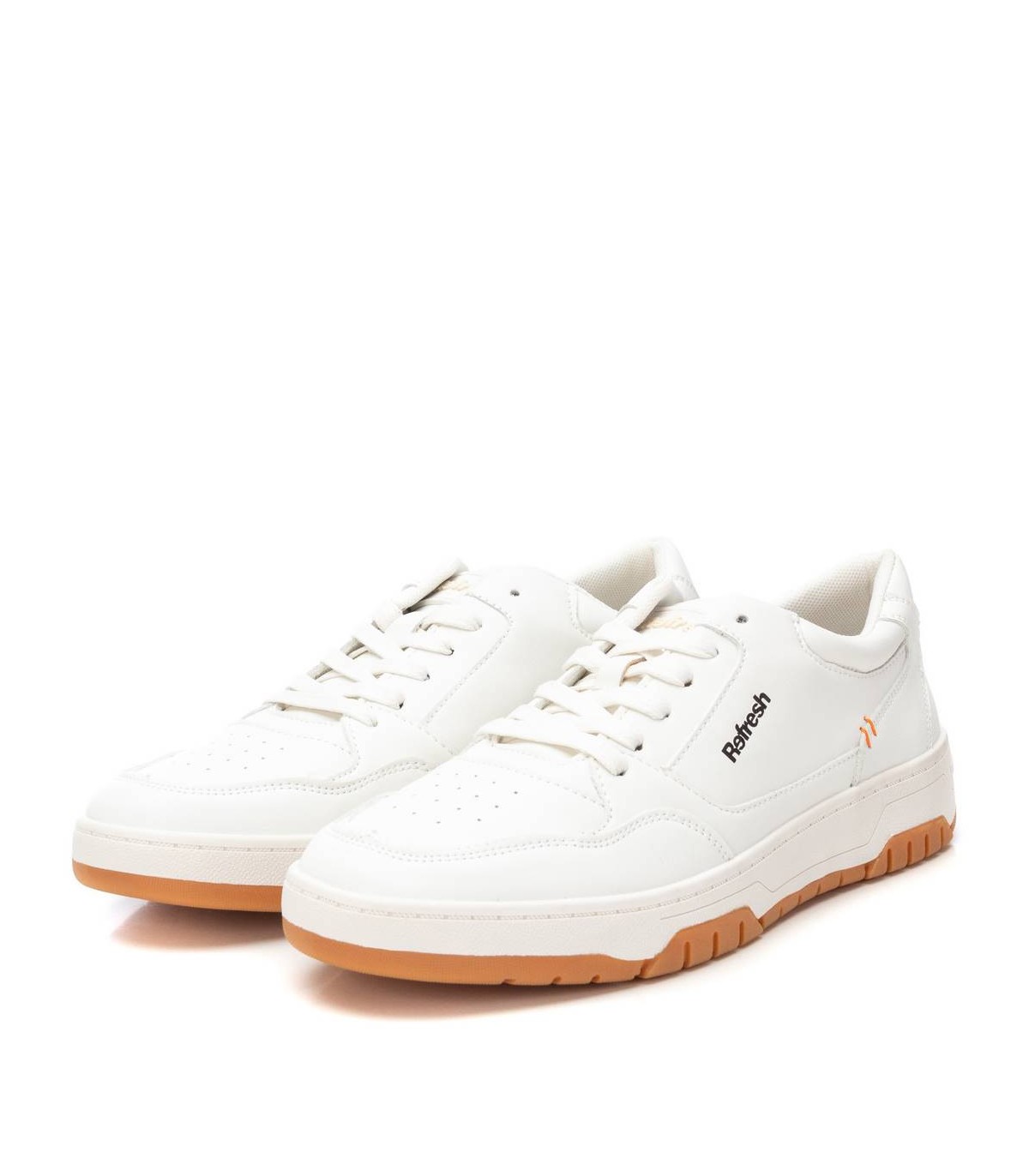 Zapatilla de hombre, de la marca Refresh. Fabricado en material que imita a la piel. Pasados naranjas, ya característicos de la marca. Cierre mediante cordones regulables. Suela a contraste de goma antideslizante. Este modelo ha obtenido el certificado vegano por la organización mundial PETA (Organización de los derechos de los animales).