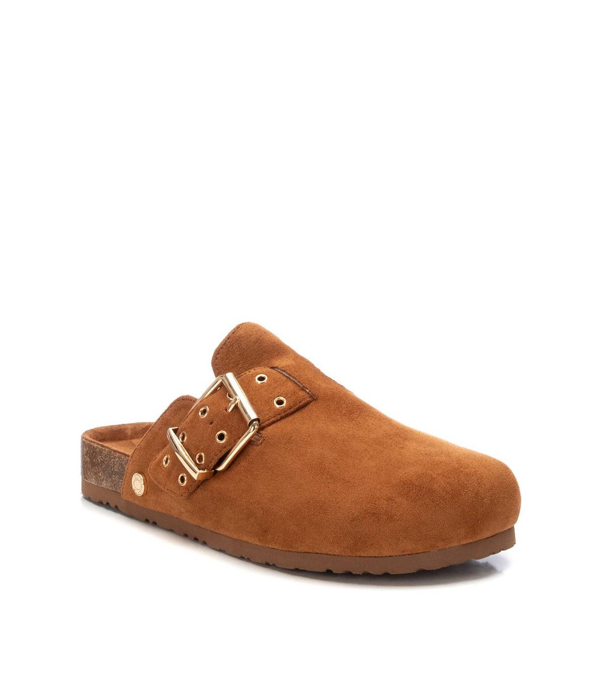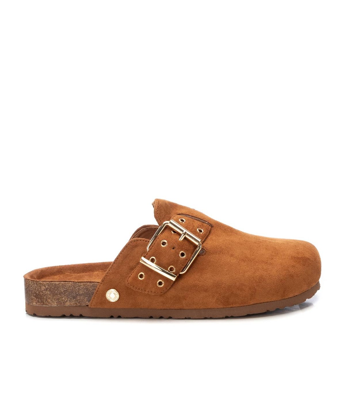 Zueco destalonado, de la marca Refresh. Fabricado en suave antelina. Correa ajustable con hebilla en oro. Cómoda planta de bios con suela de goma antideslizante. Este modelo ha obtenido el certificado vegano por la organización mundial PETA (Organización de los derechos de los animales).