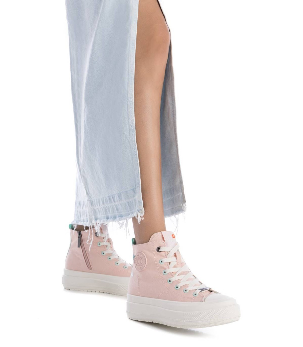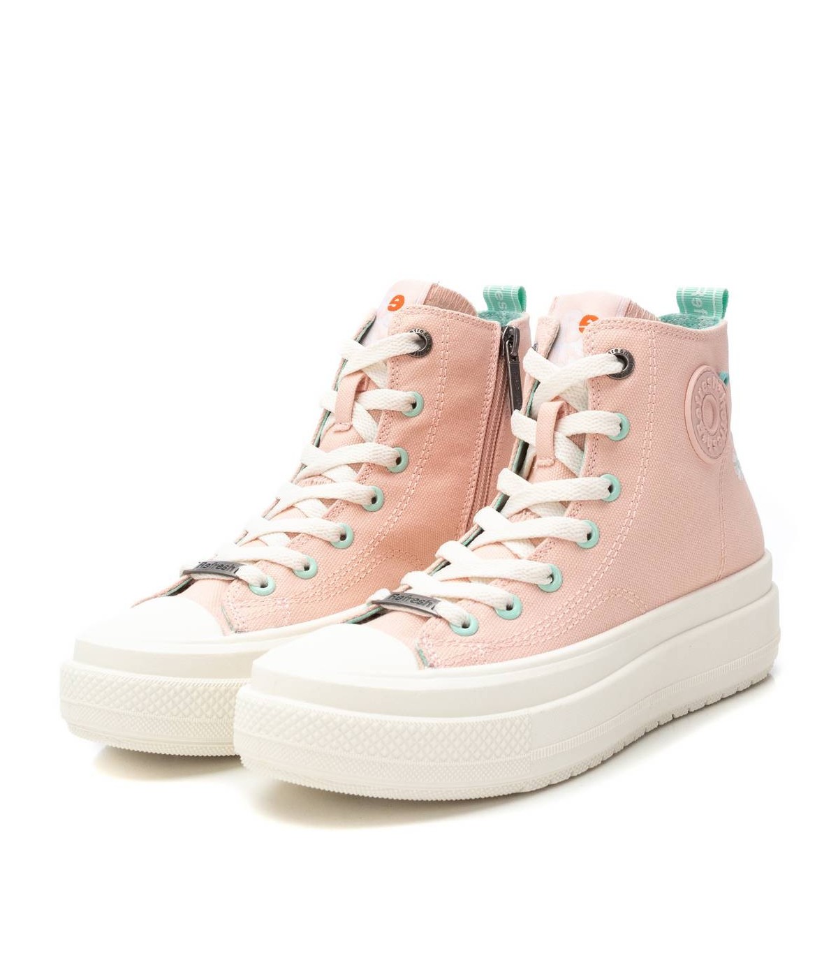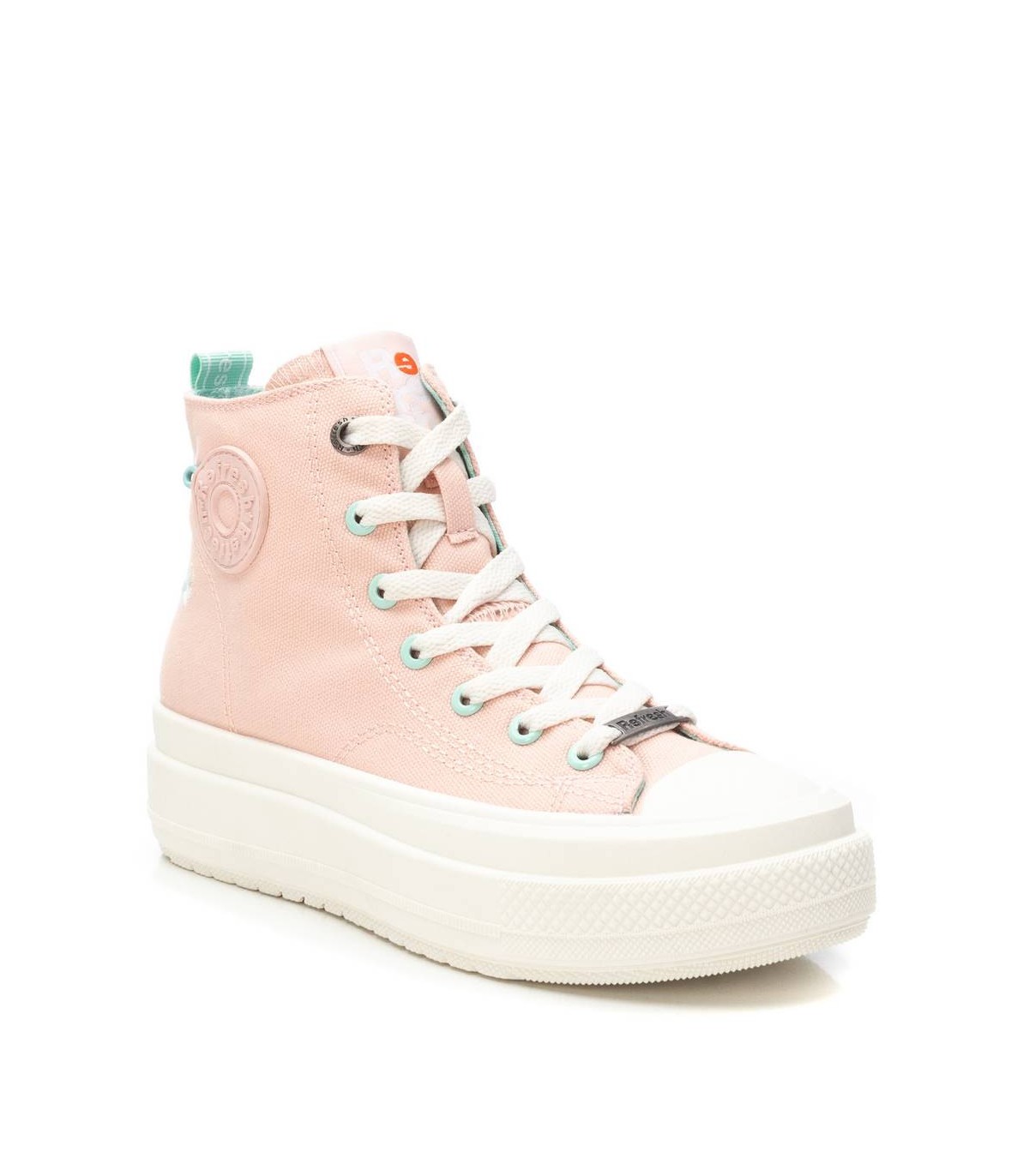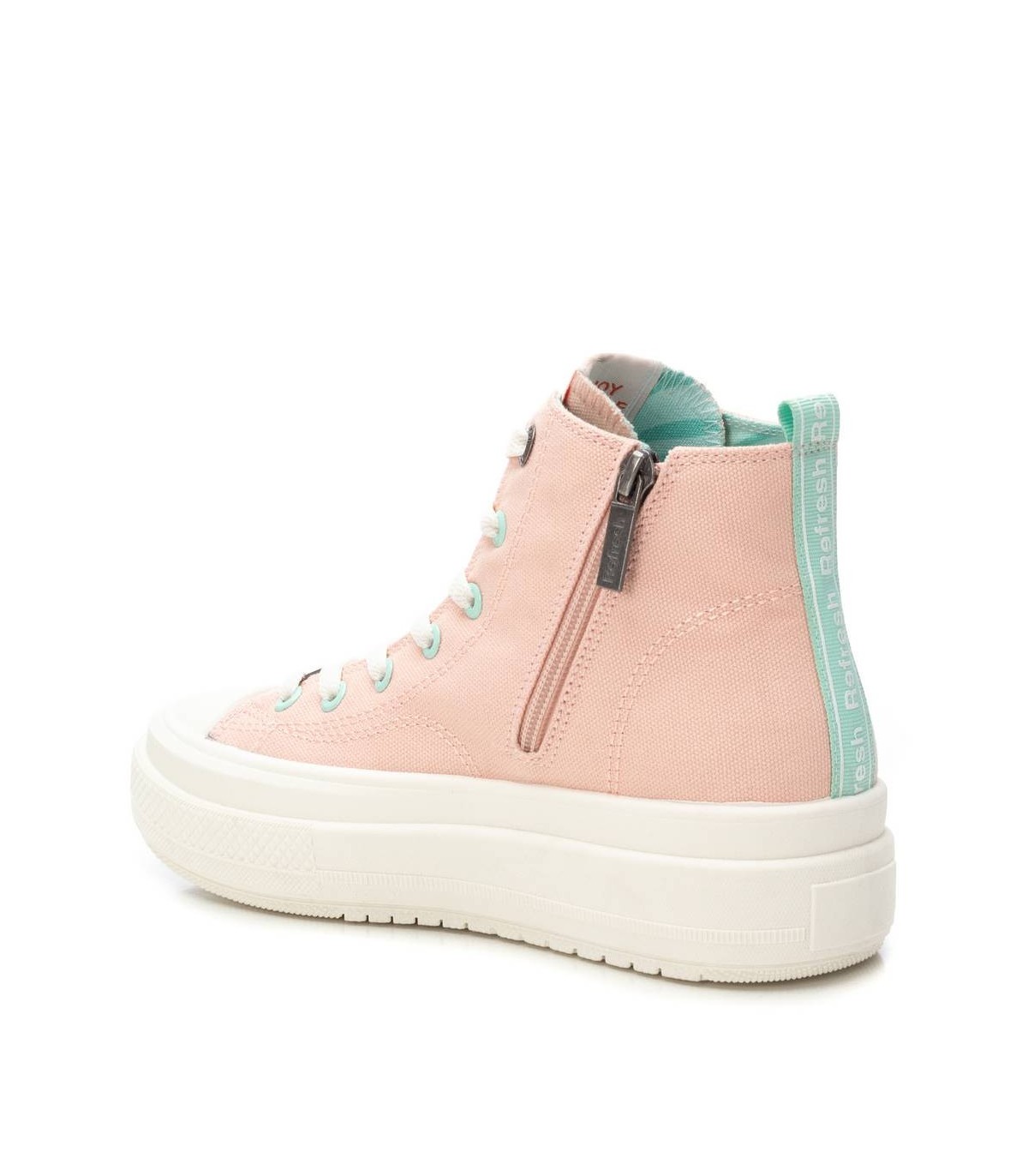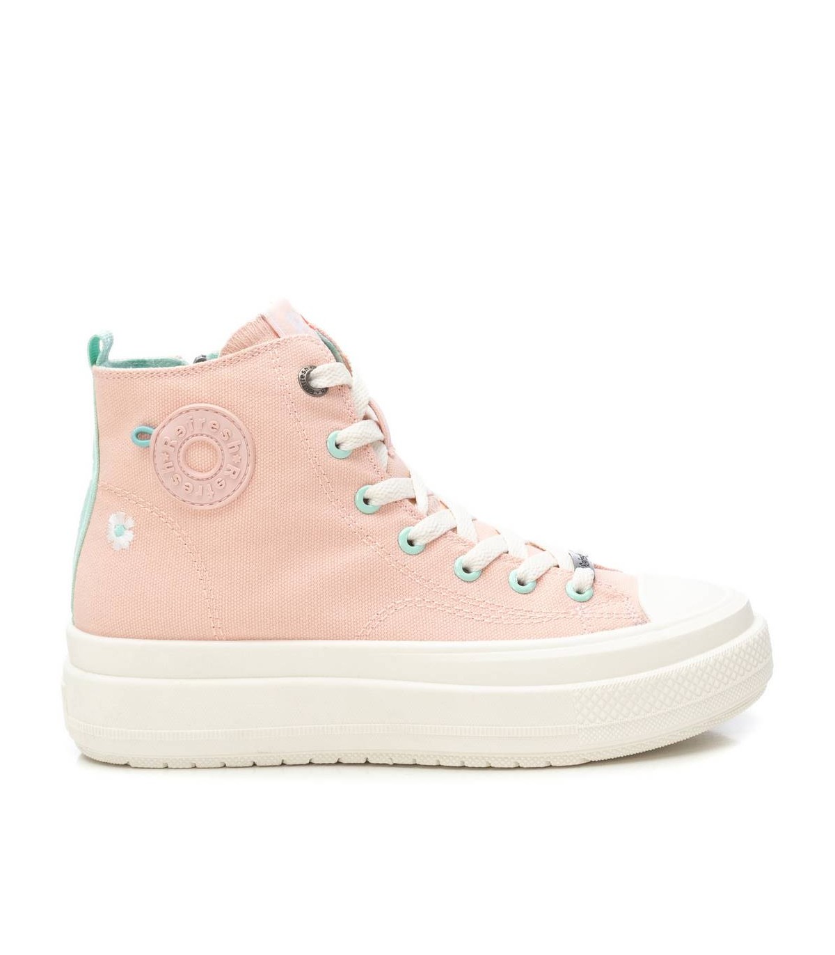 Zapatilla tipo botín de la marca Refresh. Fabricada en lona decorada con logo de la marca en el lateral y una pequeña flor bordada. Cierre mediante cremallera interior. Cordones regulables para un mejor ajuste. Piso volumen con suela de goma antideslizante. Este modelo ha obtenido el certificado vegano por la organización mundial PETA (Organización de los derechos de los animales).