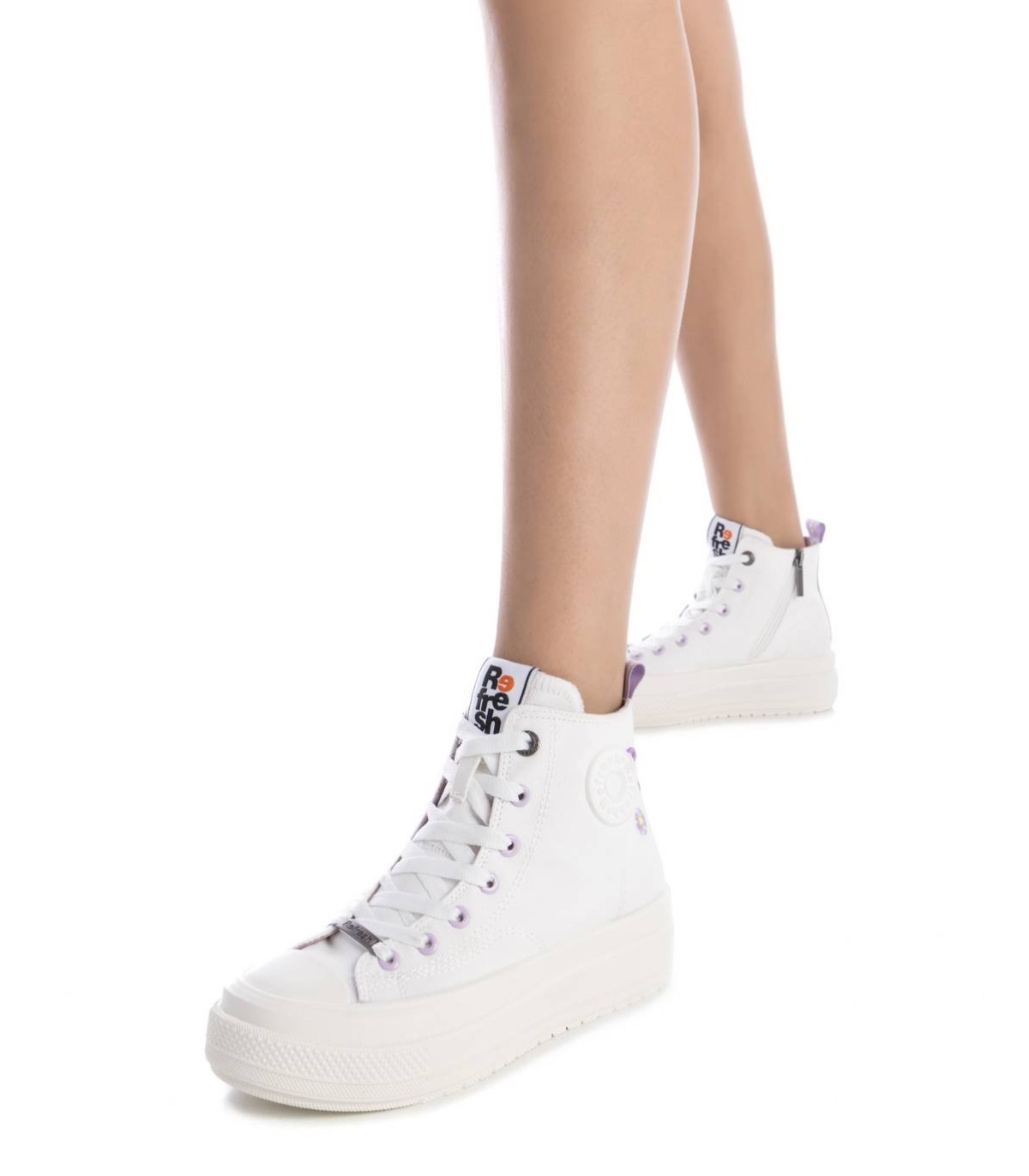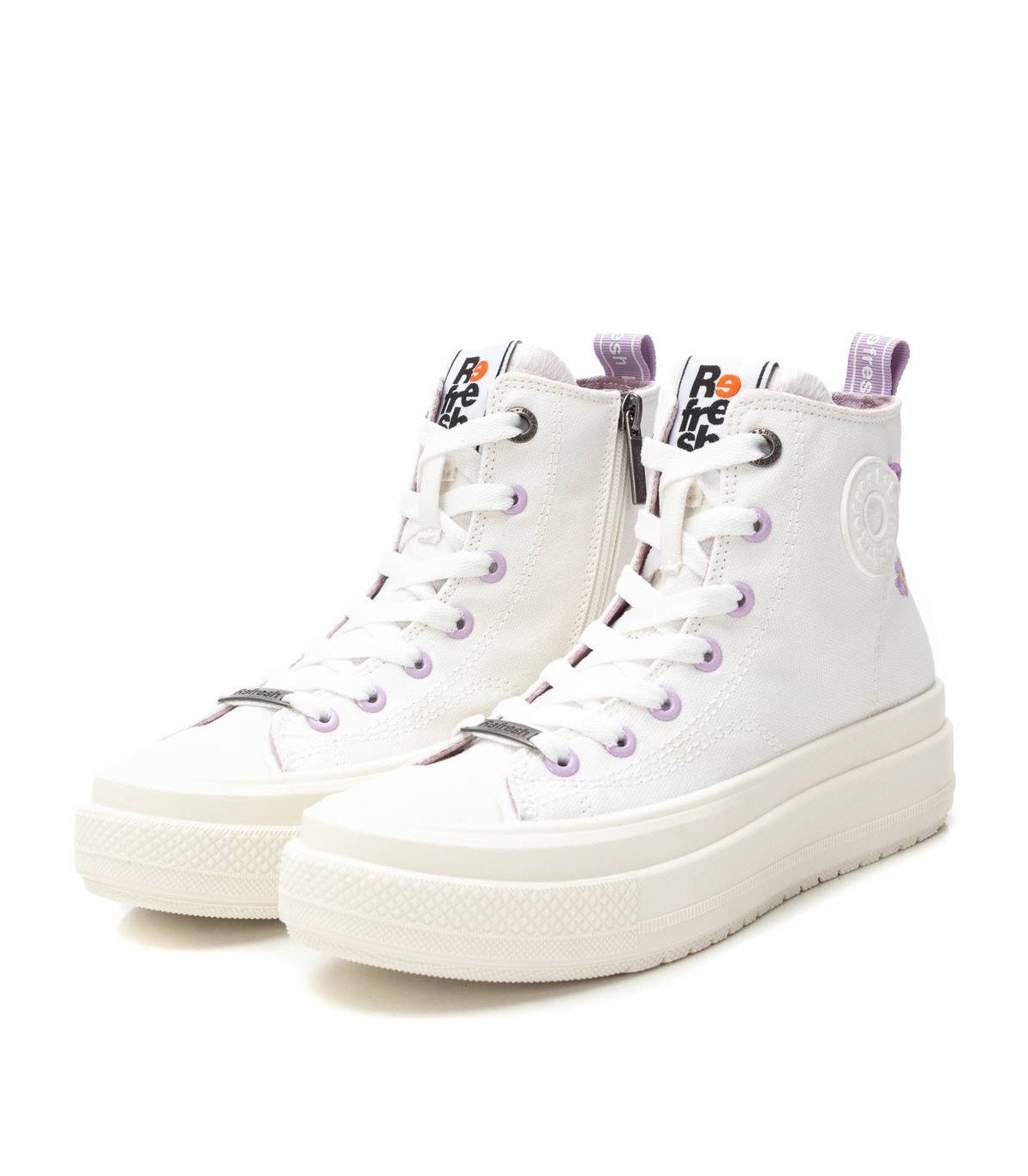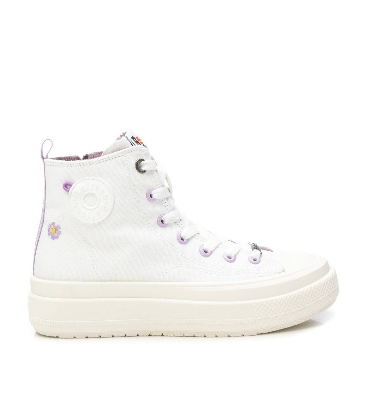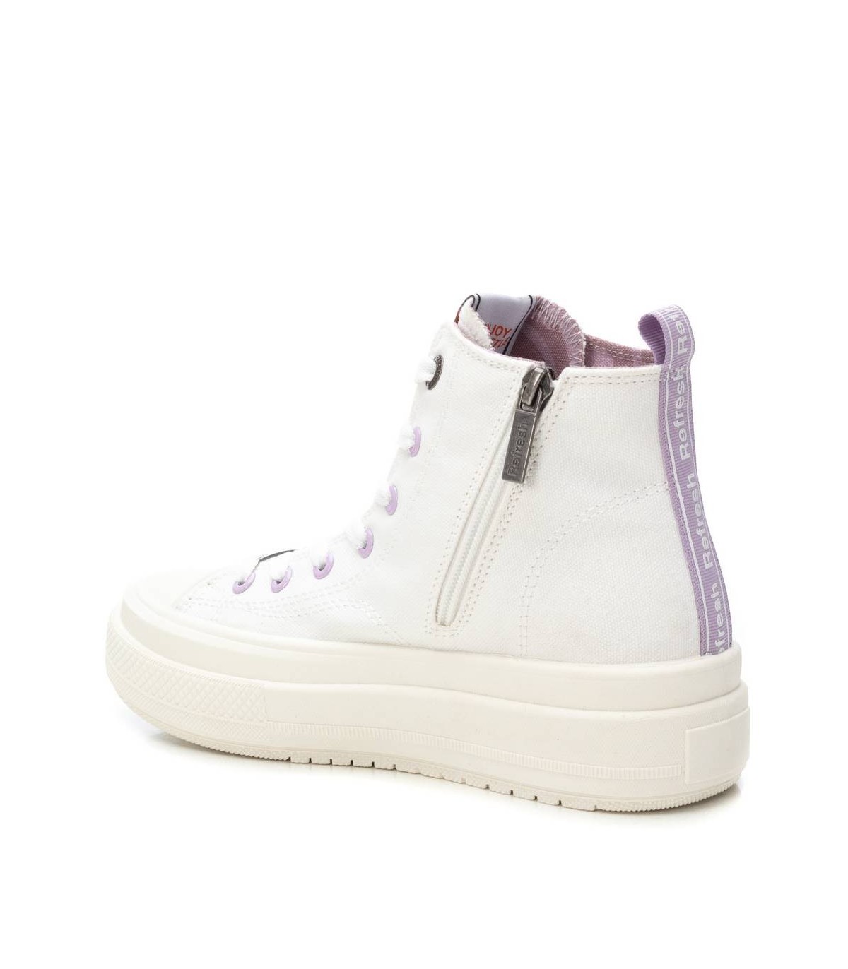 Zapatilla tipo botín de la marca Refresh. Fabricada en lona decorada con logo de la marca en el lateral y una pequeña flor bordada. Cierre mediante cremallera interior. Cordones regulables para un mejor ajuste. Piso volumen con suela de goma antideslizante. Este modelo ha obtenido el certificado vegano por la organización mundial PETA (Organización de los derechos de los animales).