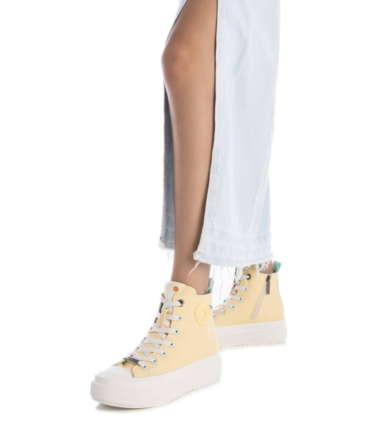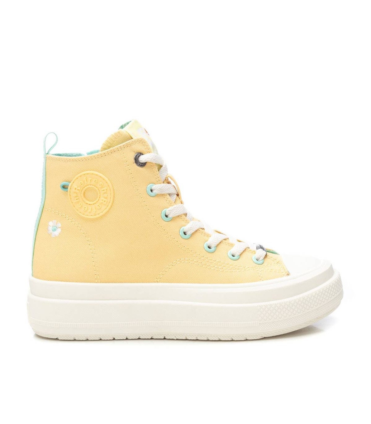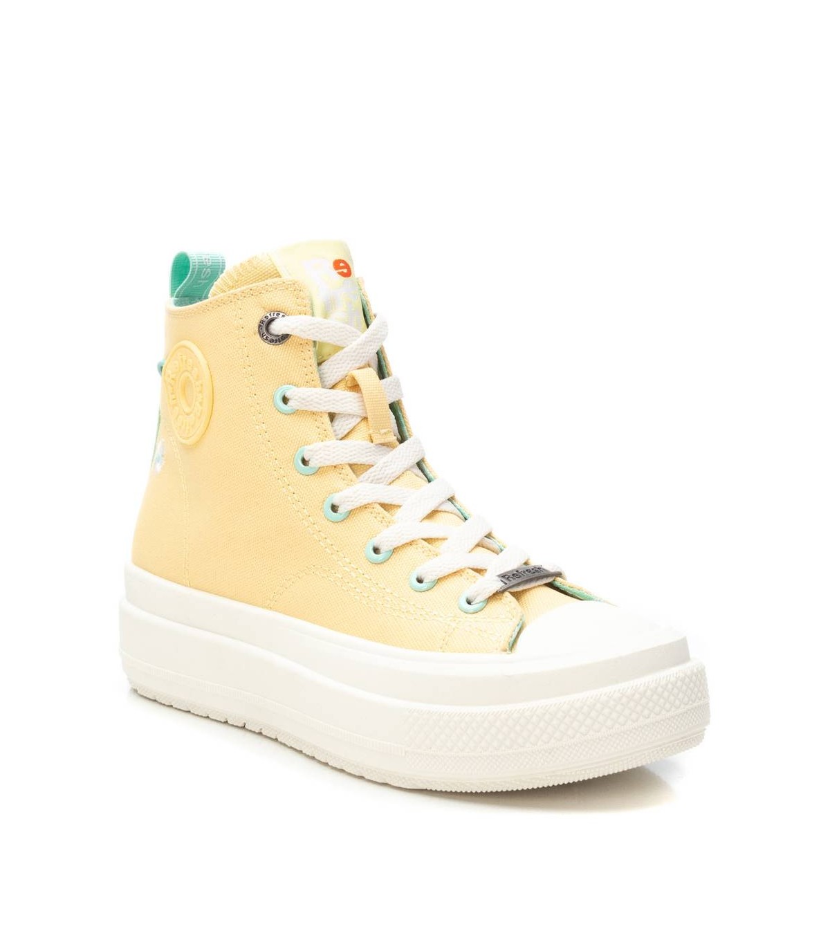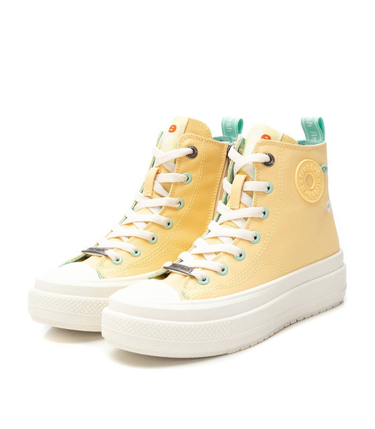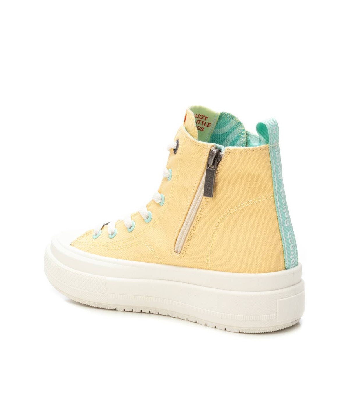 Zapatilla tipo botín de la marca Refresh. Fabricada en lona decorada con logo de la marca en el lateral y una pequeña flor bordada. Cierre mediante cremallera interior. Cordones regulables para un mejor ajuste. Piso volumen con suela de goma antideslizante. Este modelo ha obtenido el certificado vegano por la organización mundial PETA (Organización de los derechos de los animales).
