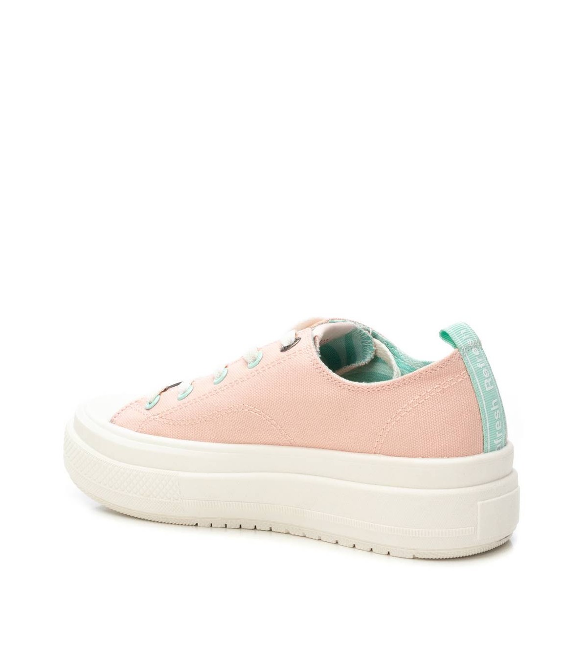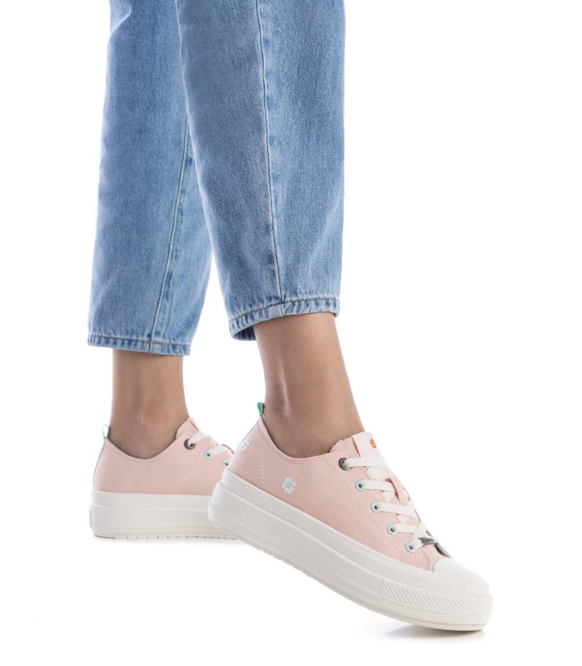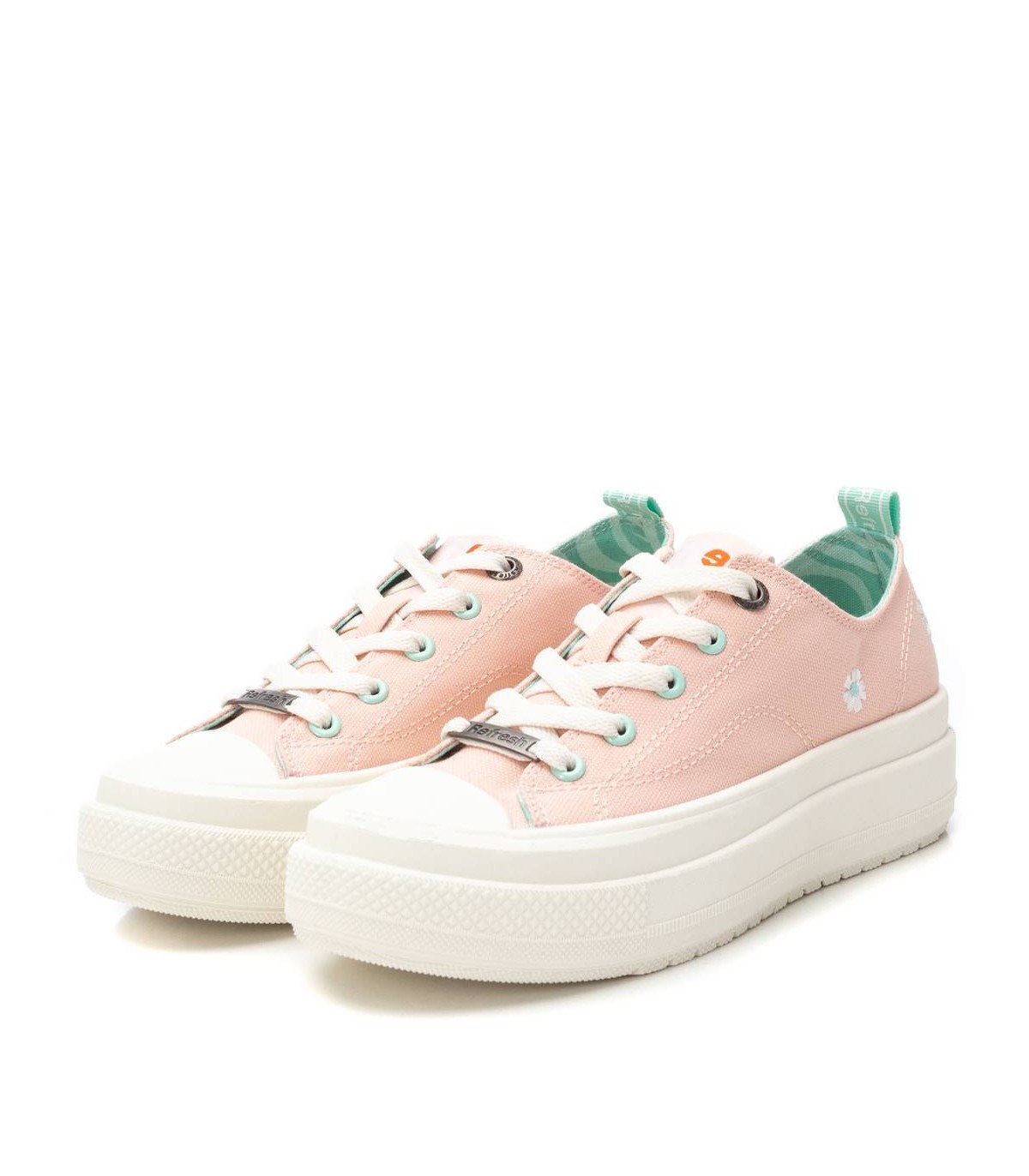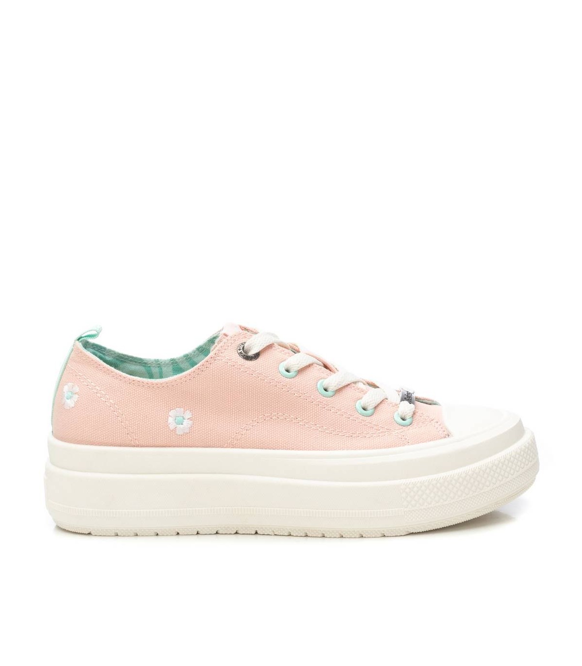 Zapatilla de la marca Refresh. Fabricada en resistente lona decorada con pequeñas flores bordadas. Forro con motivo decorativo. Cordones regulables y tirador trasero para facilitar la puesta. Suela volumen de goma antideslizante. Este modelo ha obtenido el certificado vegano por la organización mundial PETA (Organización de los derechos de los animales).