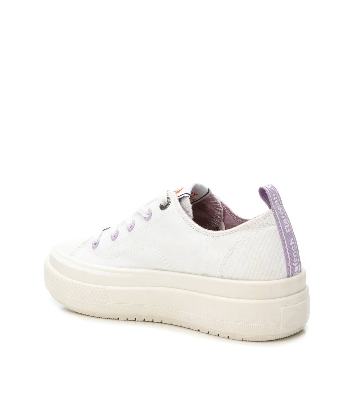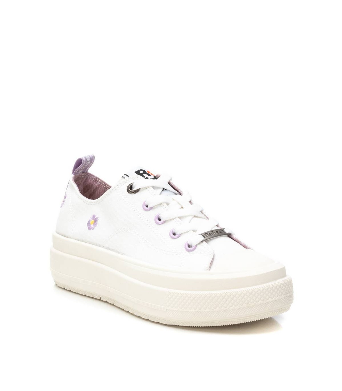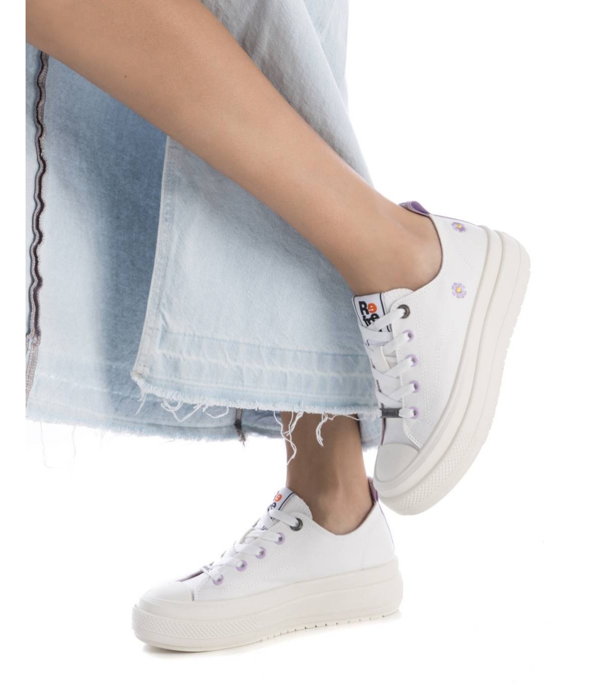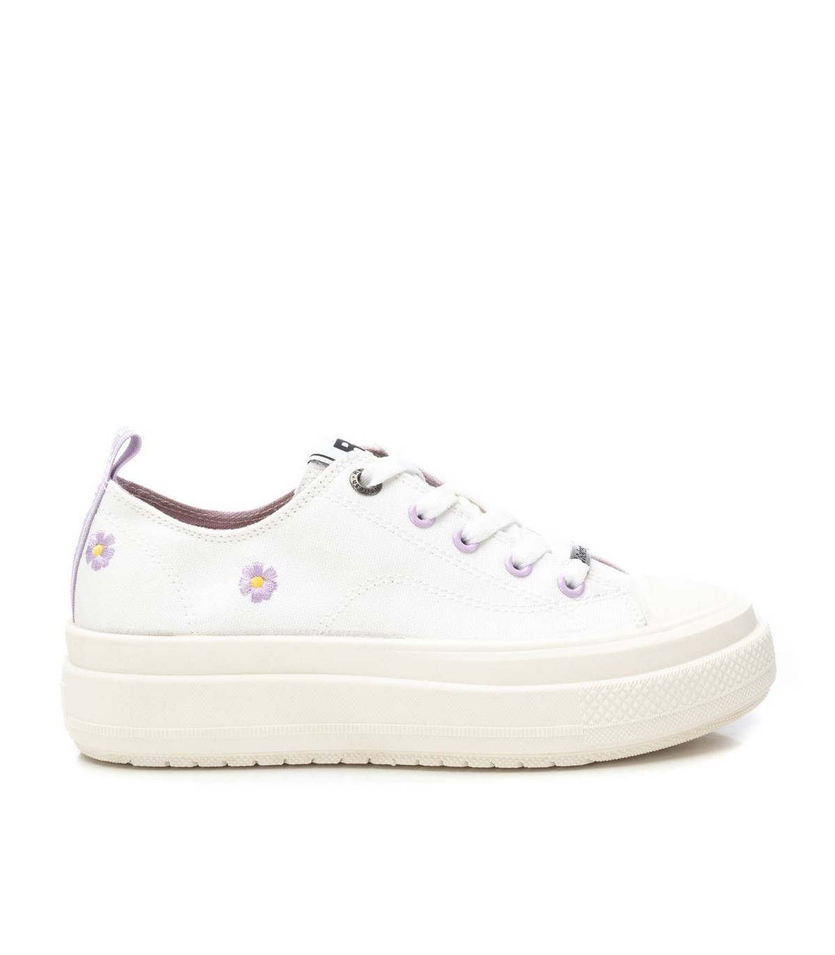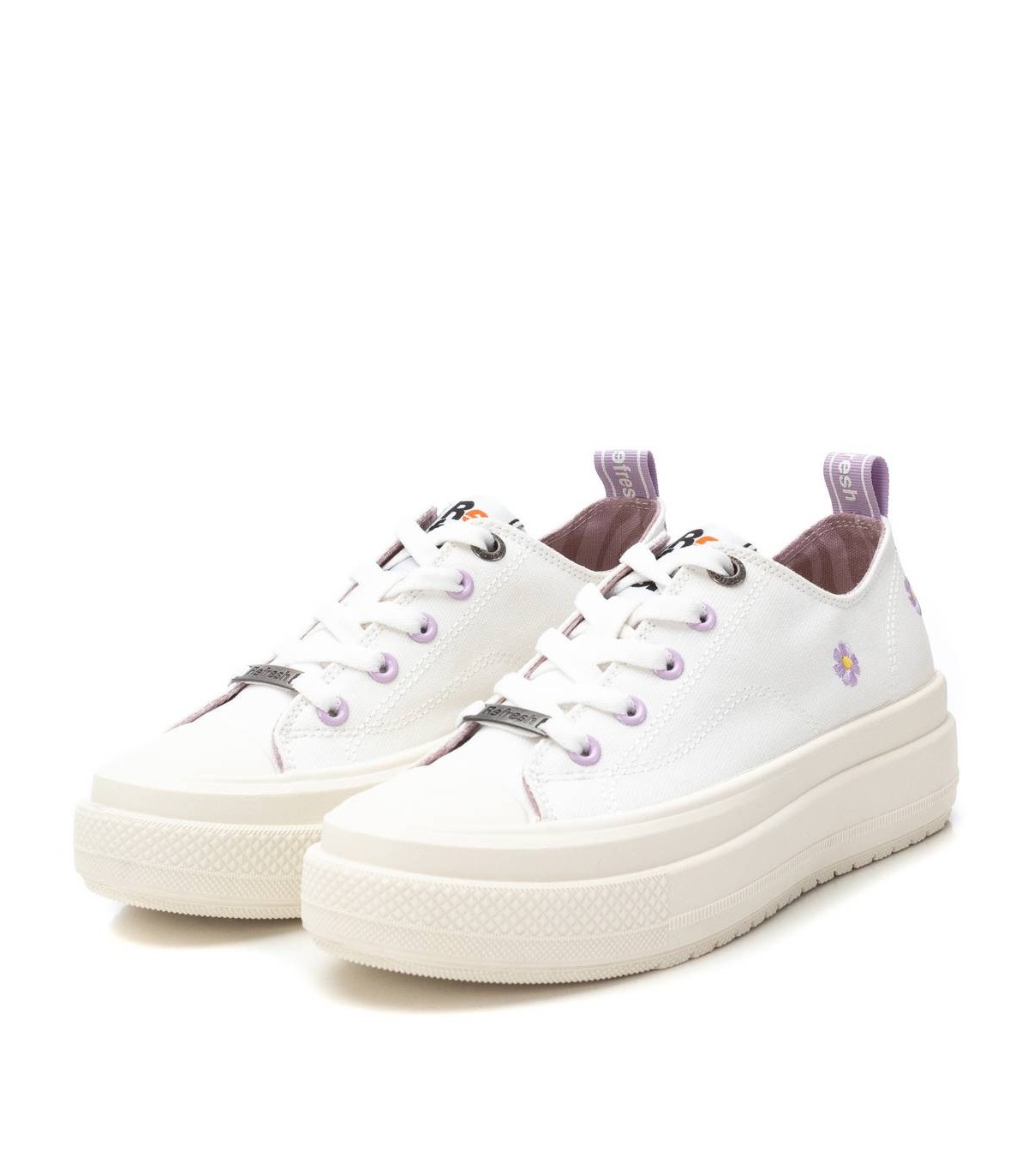 Zapatilla de la marca Refresh. Fabricada en resistente lona decorada con pequeñas flores bordadas. Forro con motivo decorativo. Cordones regulables y tirador trasero para facilitar la puesta. Suela volumen de goma antideslizante. Este modelo ha obtenido el certificado vegano por la organización mundial PETA (Organización de los derechos de los animales).