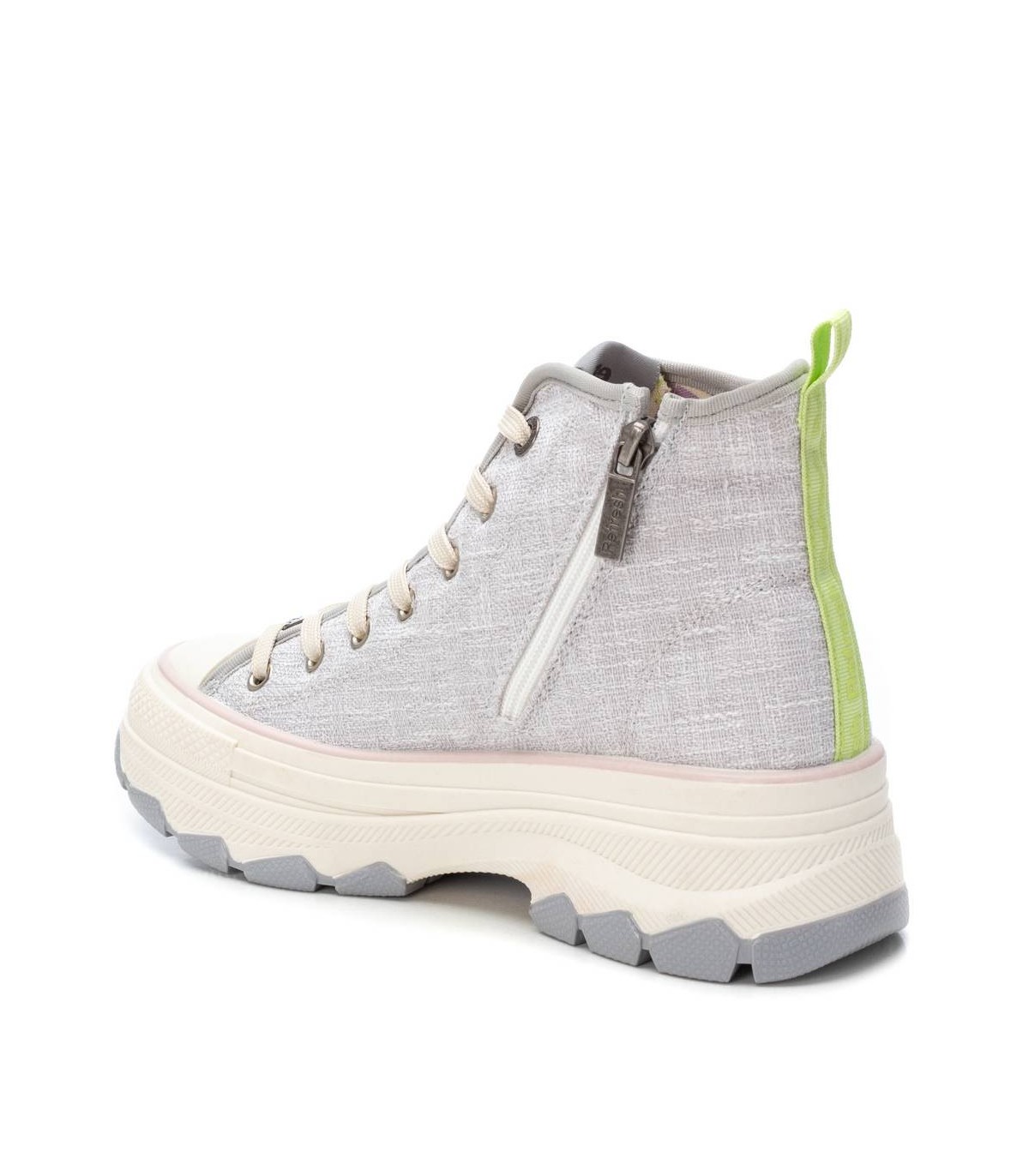 Zapatilla tipo botín de la marca Refresh. Fabricada en un suave tejido. Cierre mediante cremallera interior con cordones regulables para un mejor ajuste. Tirador trasero para facilitar la puesta. Logo de goma a contraste en el lateral. Piso volumen con suela de goma antideslizante. Este modelo ha obtenido el certificado vegano por la organización mundial PETA (Organización de los derechos de los animales).