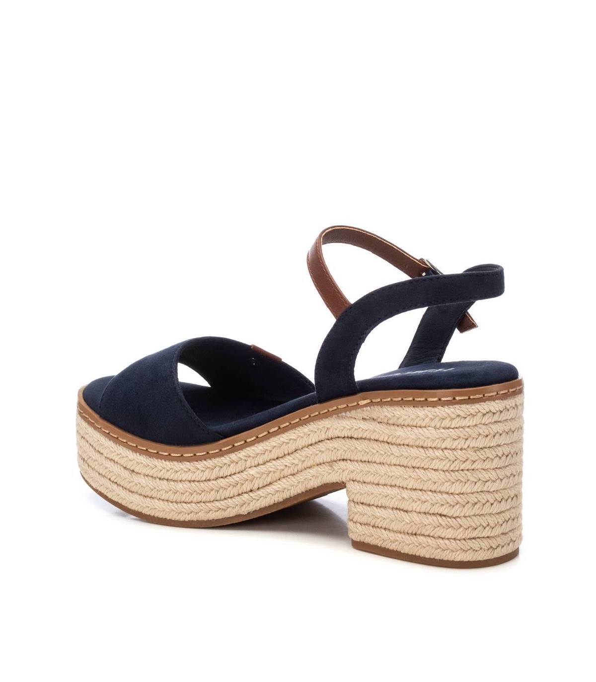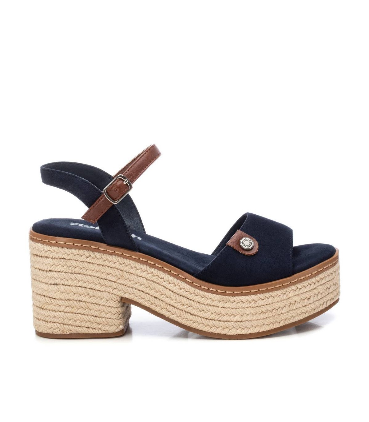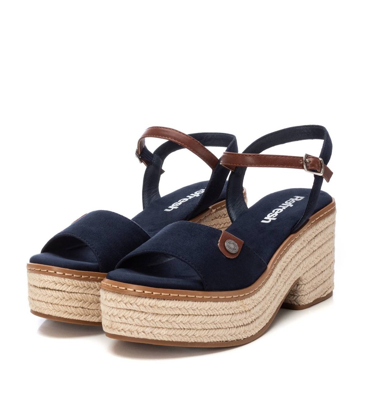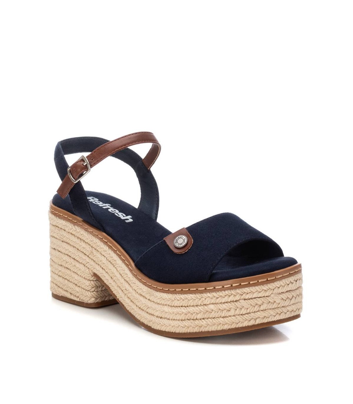 Sandalia de mujer, de la marca Refresh. Fabricada en antelina. Pala ancha y pulsera la tobillo con cierre de hebilla. Tacón ancho de 8 cm con plataforma delantera forrado en yute trenzado. Suela de goma antideslizante. Este modelo ha obtenido el certificado vegano por la organización mundial PETA (Organización de los derechos de los animales).