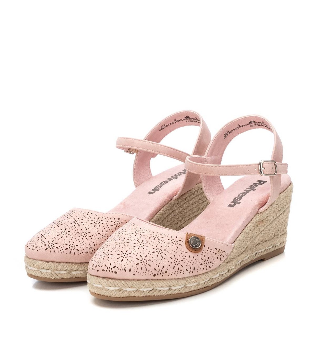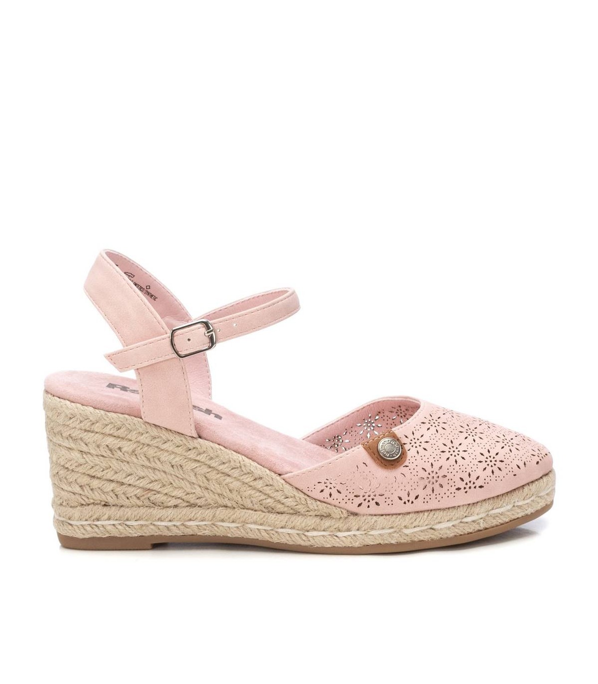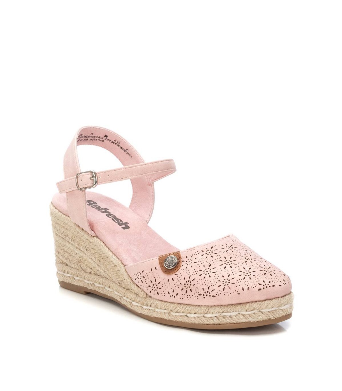 Alpargata de mujer, de la marca Refresh. Fabricada en material que imita la piel con diseño troquelado. Talón destalonado. Pulsera al tobillo con hebilla. Cuña de 7 cm de yute y suela de goma antideslizante. Este modelo ha obtenido el certificado vegano por la organización mundial PETA (Organización de los derechos de los animales).
