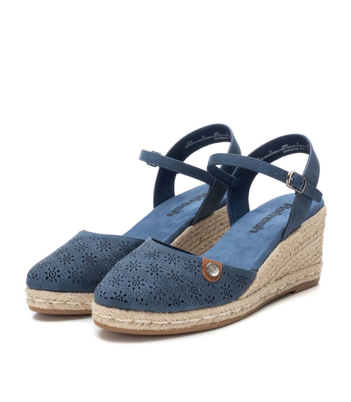 Alpargata de mujer, de la marca Refresh. Fabricada en material que imita la piel con diseño troquelado. Talón destalonado. Pulsera al tobillo con hebilla. Cuña de 7 cm de yute y suela de goma antideslizante. Este modelo ha obtenido el certificado vegano por la organización mundial PETA (Organización de los derechos de los animales).