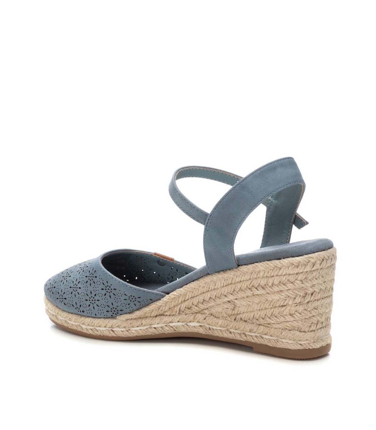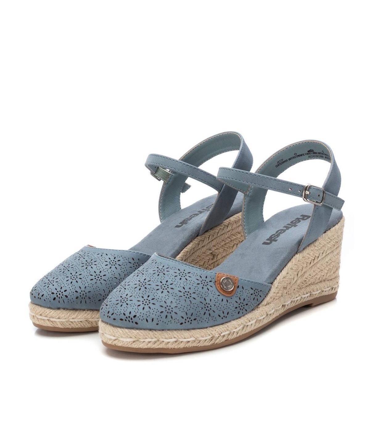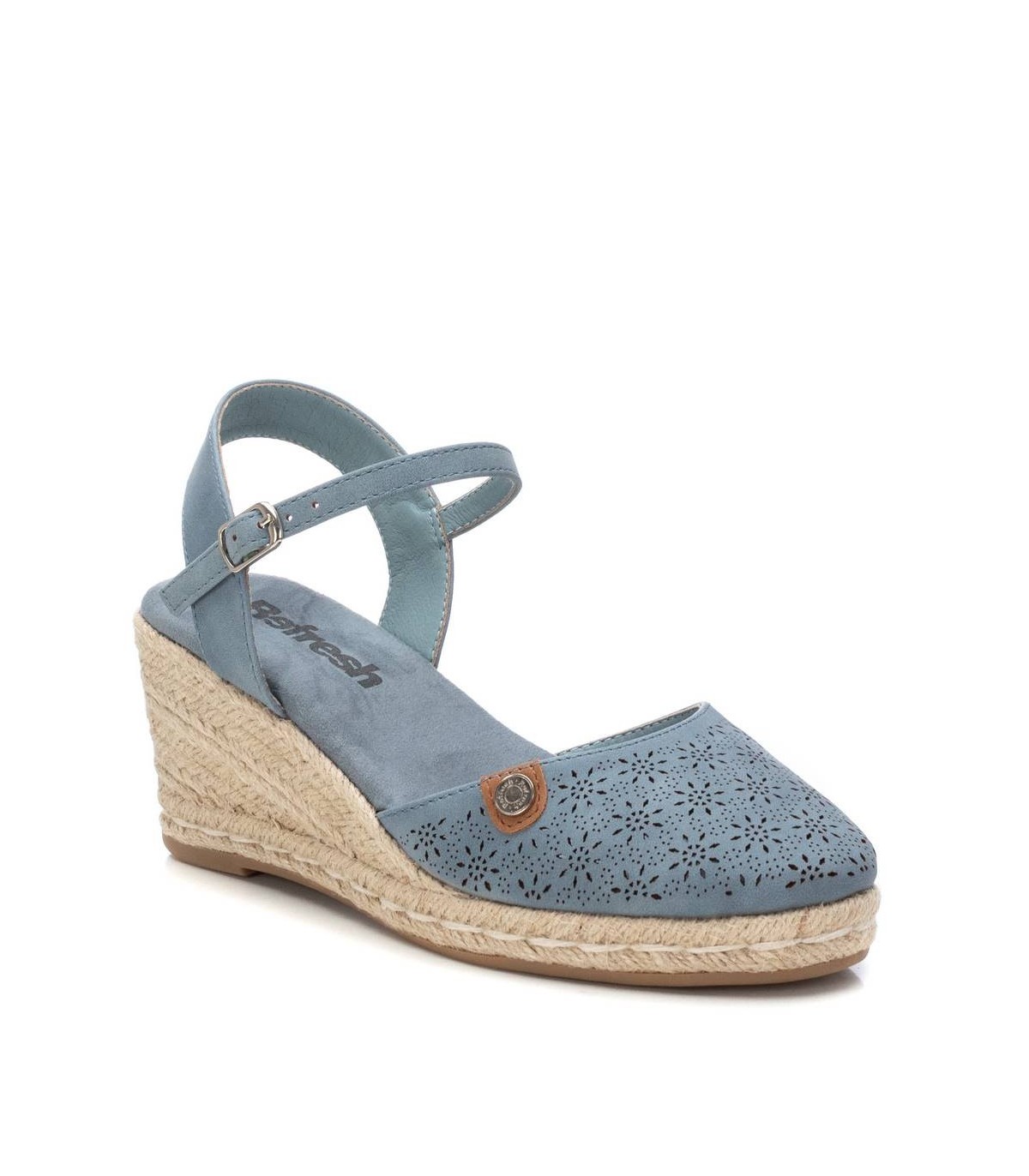 Alpargata de mujer, de la marca Refresh. Fabricada en material que imita la piel con diseño troquelado. Talón destalonado. Pulsera al tobillo con hebilla. Cuña de 7 cm de yute y suela de goma antideslizante. Este modelo ha obtenido el certificado vegano por la organización mundial PETA (Organización de los derechos de los animales).