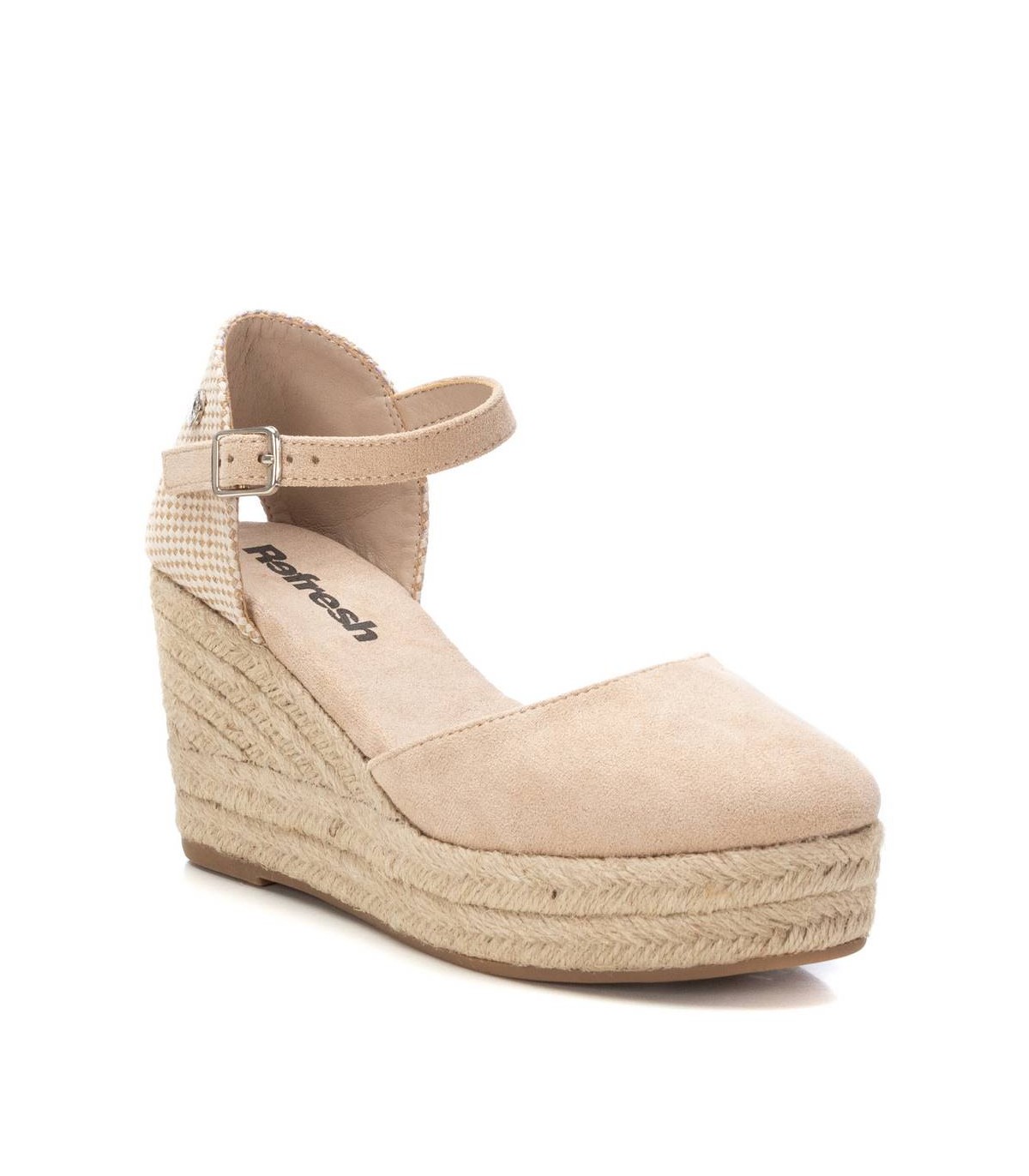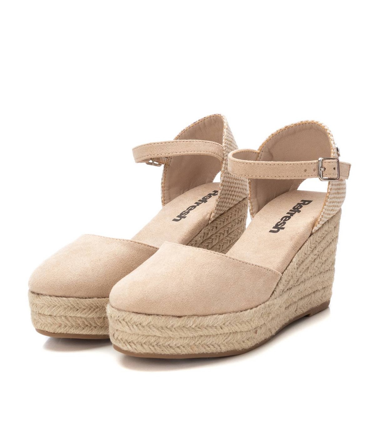 Valenciana de mujer, de la marca Refresh. Fabricada en antelina. Talón cerrado y pulsera al tobillo con hebilla. Cuña de 8 cm forrada en yute trenzado. Suela de goma antideslizante. Este modelo ha obtenido el certificado vegano por la organización mundial PETA (Organización de los derechos de los animales).