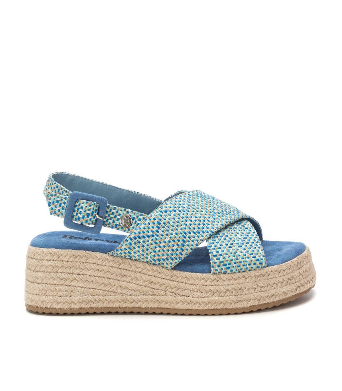 Sandalia de mujer, de la marca Refresh. Fabricada textil tipo rafia. Doble pala cruza con pulsera en antelina para ajustar al tobillo. Cuña de 6 cm forrada en yute. Suela de goma antideslizante. Un modelo que combinará a la perfección con tus looks de esta temporada. Este modelo ha obtenido el certificado vegano por la organización mundial PETA (Organización de los derechos de los animales).
