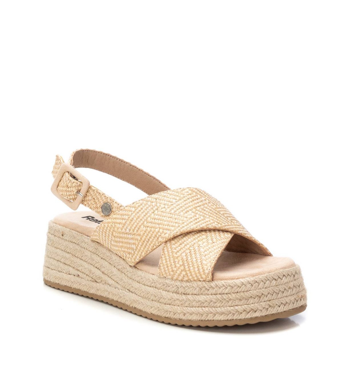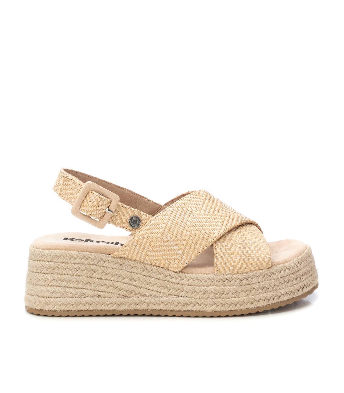 Sandalia de mujer, de la marca Refresh. Fabricada textil tipo rafia. Doble pala cruza con pulsera en antelina para ajustar al tobillo. Cuña de 6 cm forrada en yute. Suela de goma antideslizante. Un modelo que combinará a la perfección con tus looks de esta temporada. Este modelo ha obtenido el certificado vegano por la organización mundial PETA (Organización de los derechos de los animales).