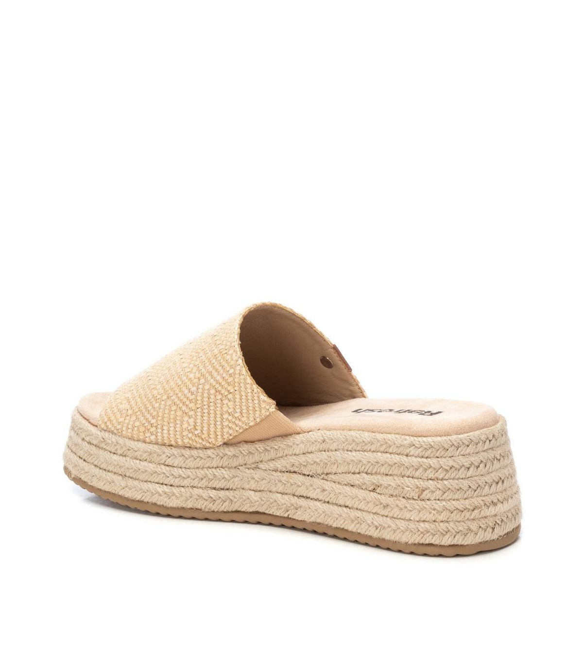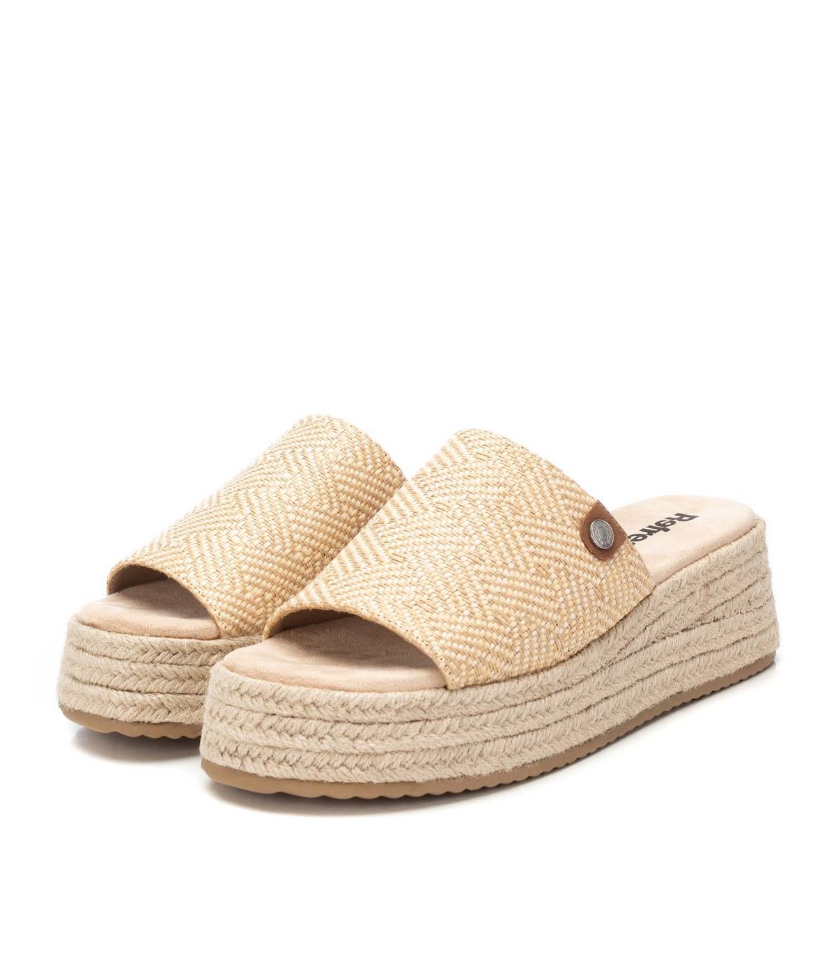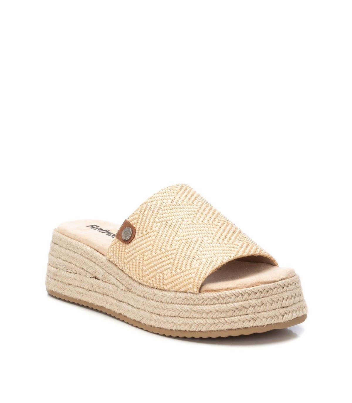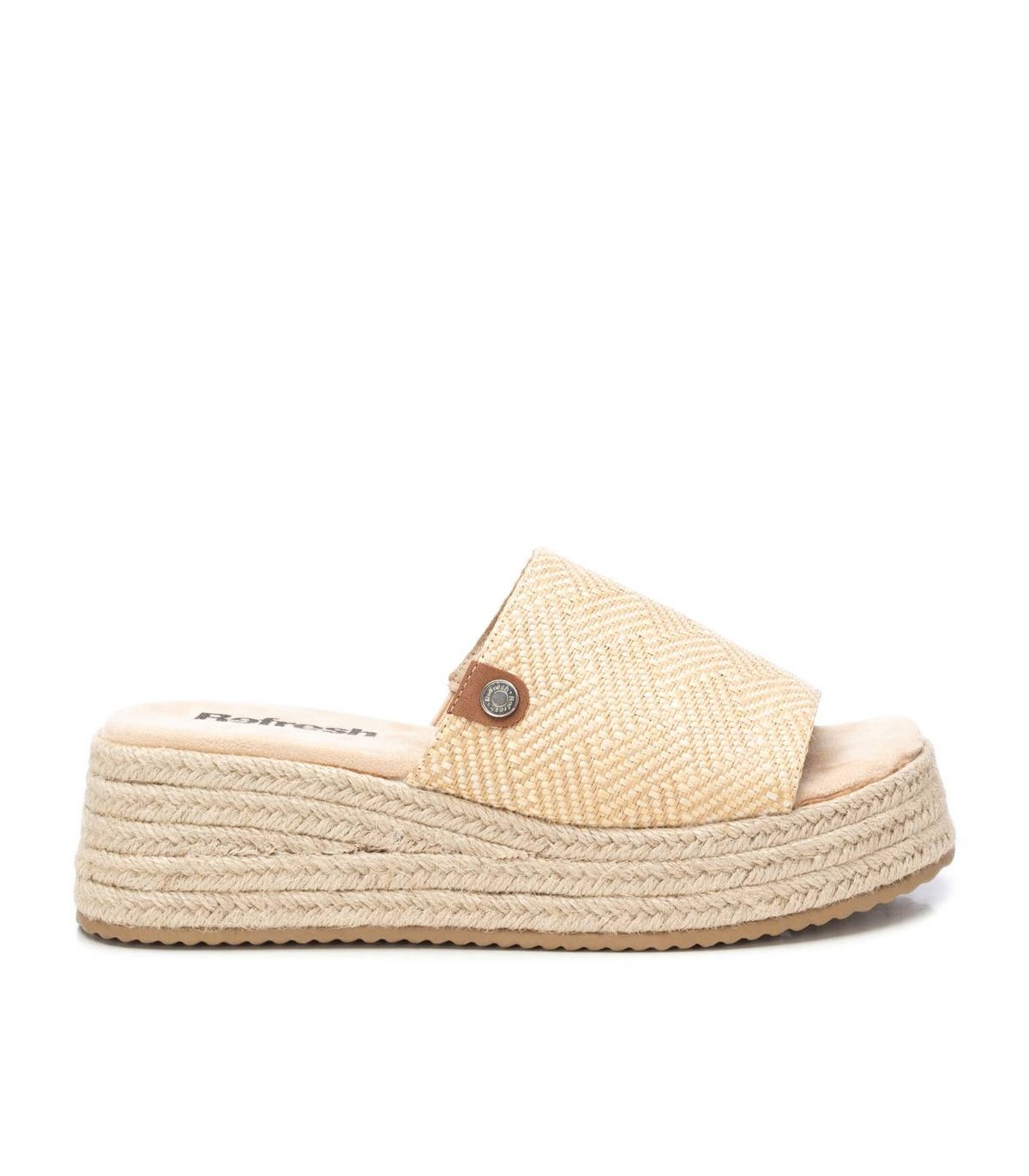 Sandalia de mujer, de la marca Refresh. Fabricada en textil tipo rafia. Sandalia con pala ancha destalonada. Cuña de 6 cm forrada en yute. Suela de goma antideslizante. Un modelo que combinará a la perfección con tus looks de esta temporada. Este modelo ha obtenido el certificado vegano por la organización mundial PETA (Organización de los derechos de los animales).