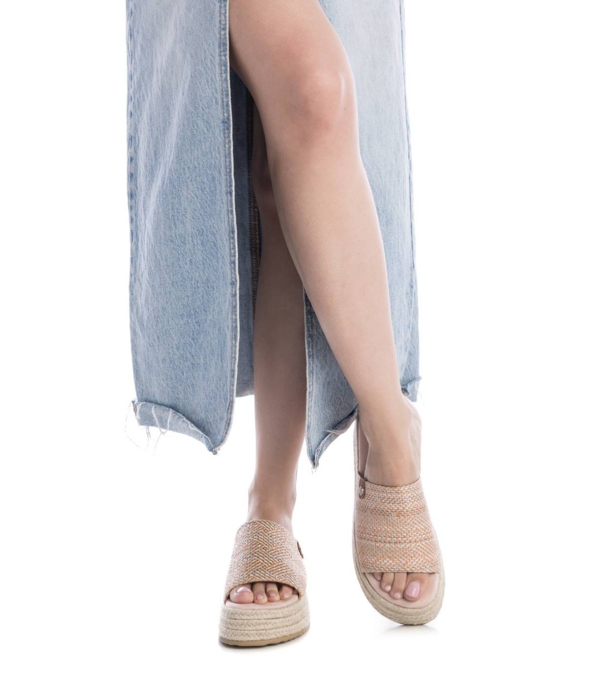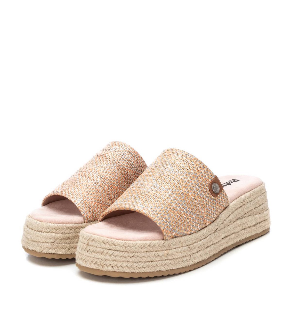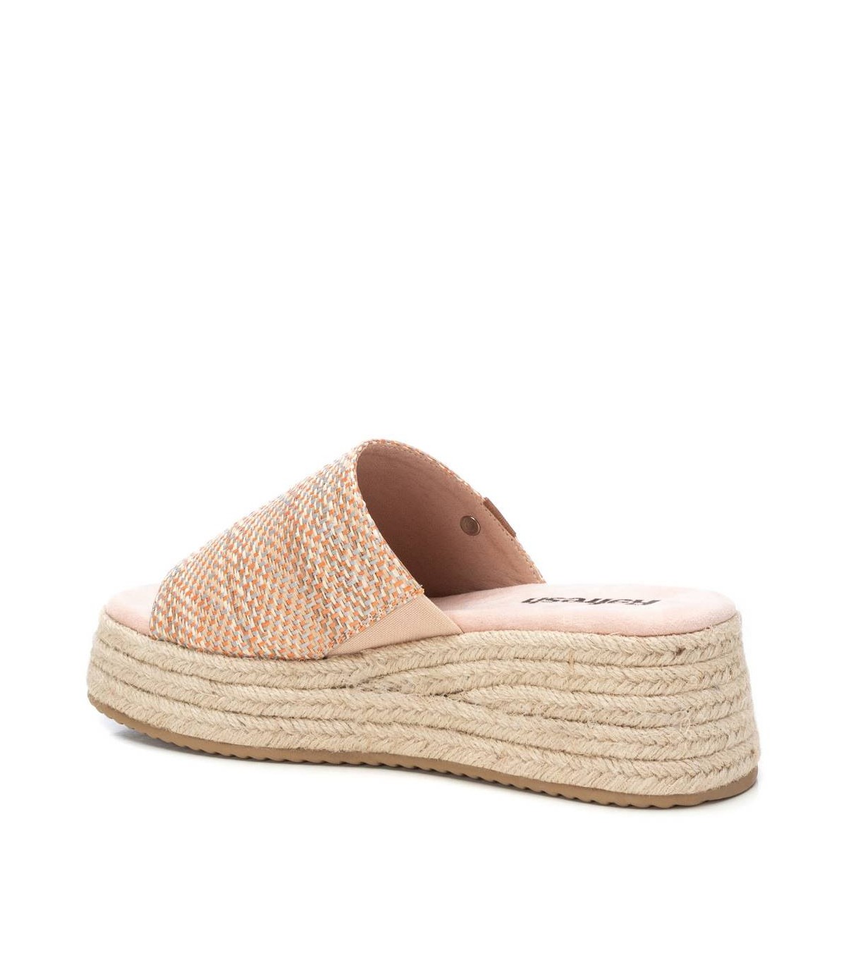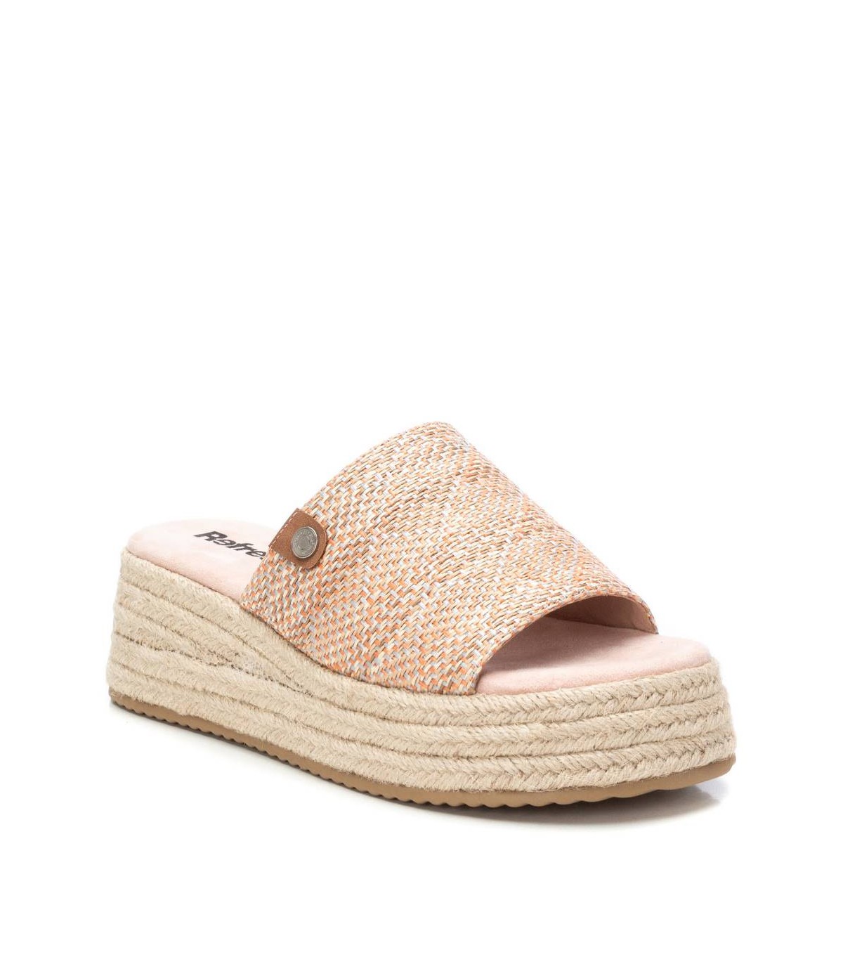 Sandalia de mujer, de la marca Refresh. Fabricada en textil tipo rafia. Sandalia con pala ancha destalonada. Cuña de 6 cm forrada en yute. Suela de goma antideslizante. Un modelo que combinará a la perfección con tus looks de esta temporada. Este modelo ha obtenido el certificado vegano por la organización mundial PETA (Organización de los derechos de los animales).