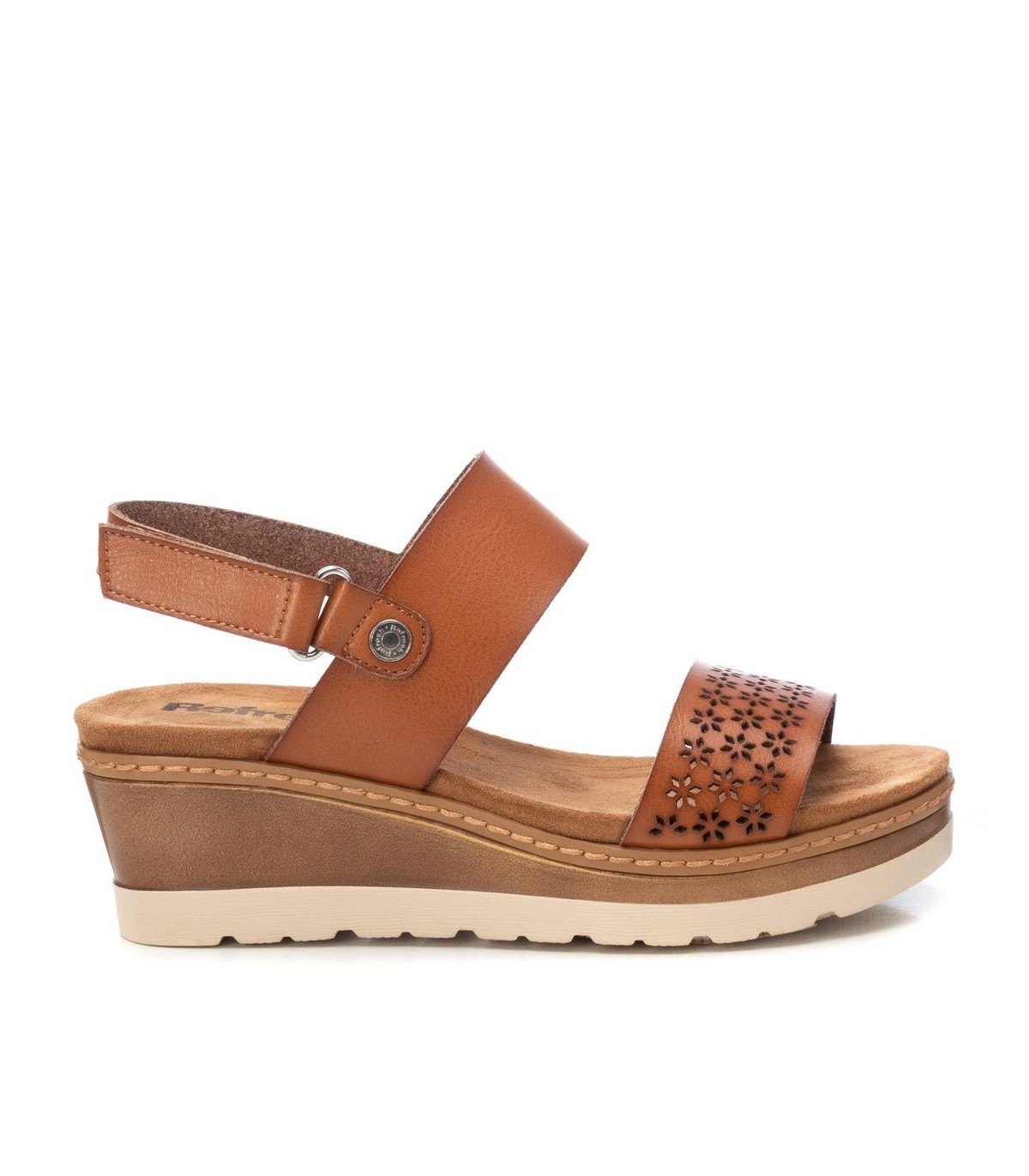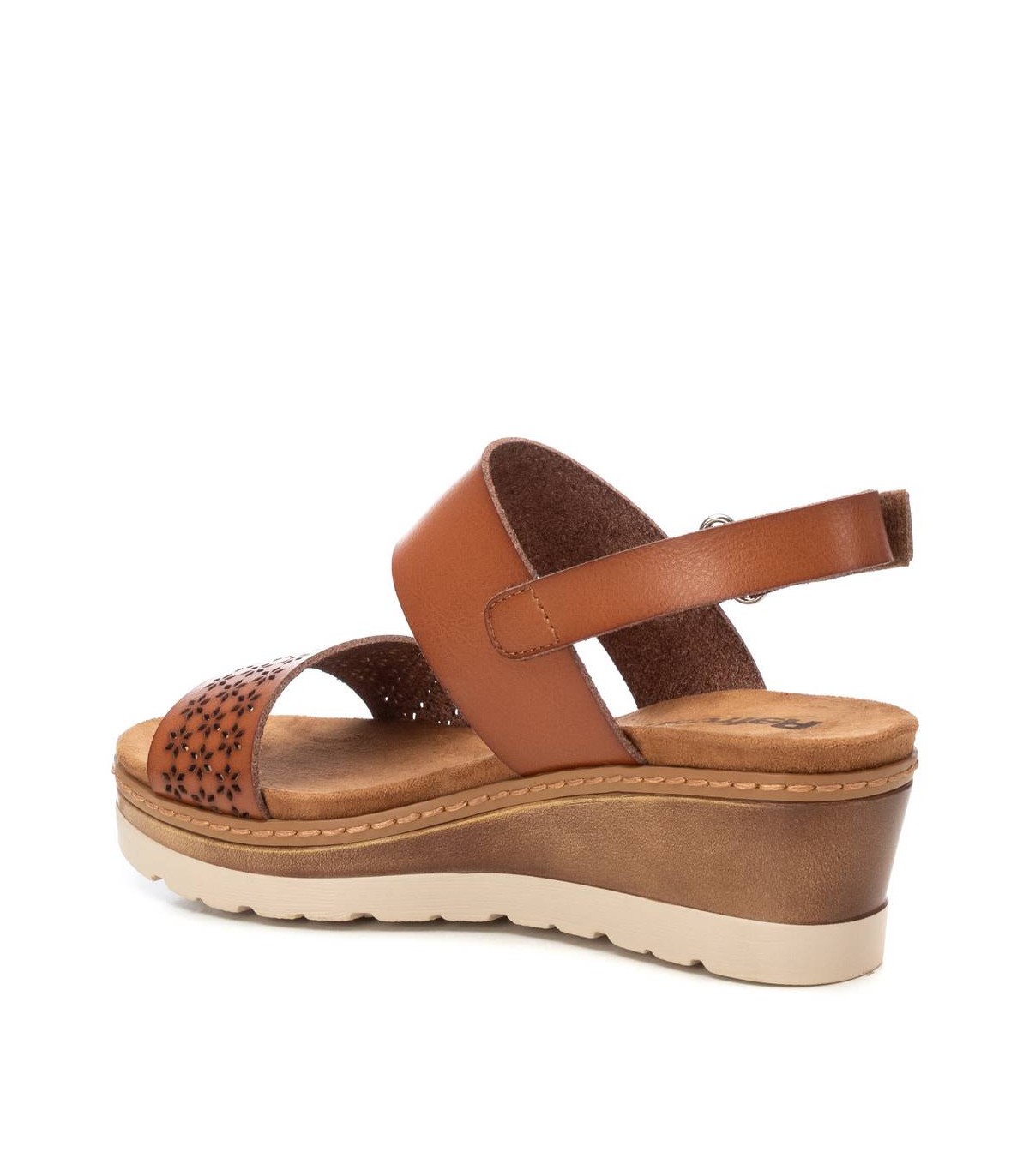 Sandalia de mujer, de la marca Refresh. Fabricada en material que imita a la piel. Diseño de doble tira en pala y empeine. Tira trasera con cierre auto adherente para sujetar el talón. Cuña de 6 cm con suela de goma antideslizante. Este modelo ha obtenido el certificado vegano por la organización mundial PETA (Organización de los derechos de los animales).