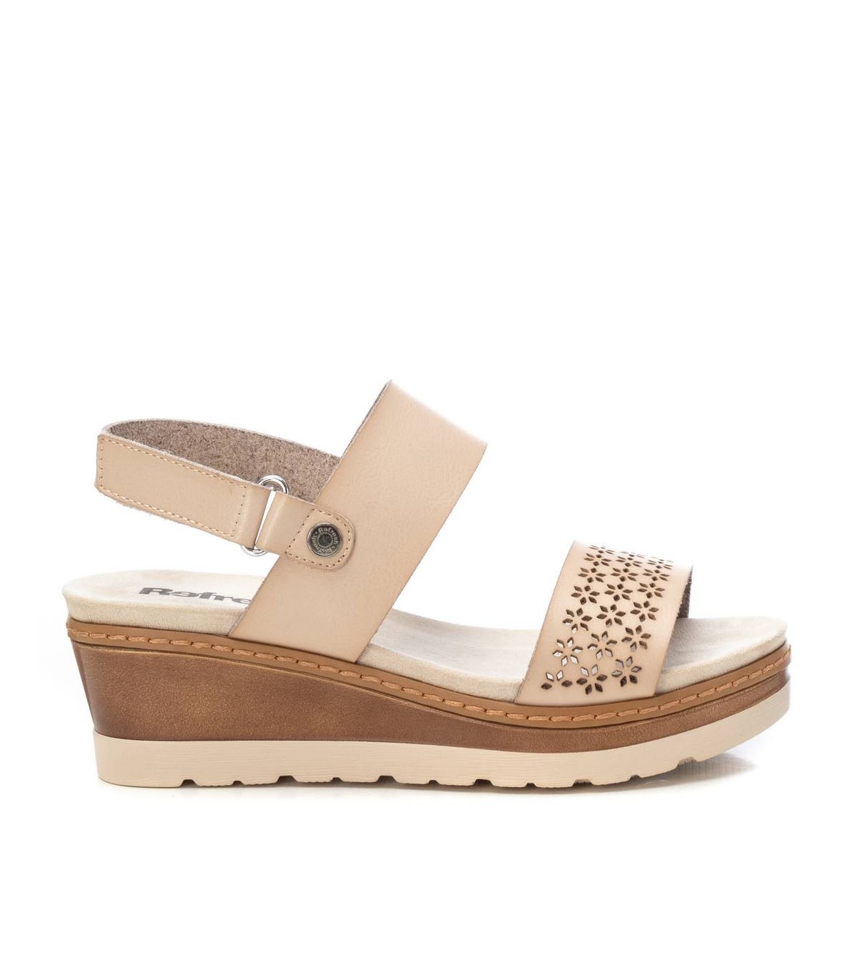 Sandalia de mujer, de la marca Refresh. Fabricada en material que imita a la piel. Diseño de doble tira en pala y empeine. Tira trasera con cierre auto adherente para sujetar el talón. Cuña de 6 cm con suela de goma antideslizante. Este modelo ha obtenido el certificado vegano por la organización mundial PETA (Organización de los derechos de los animales).