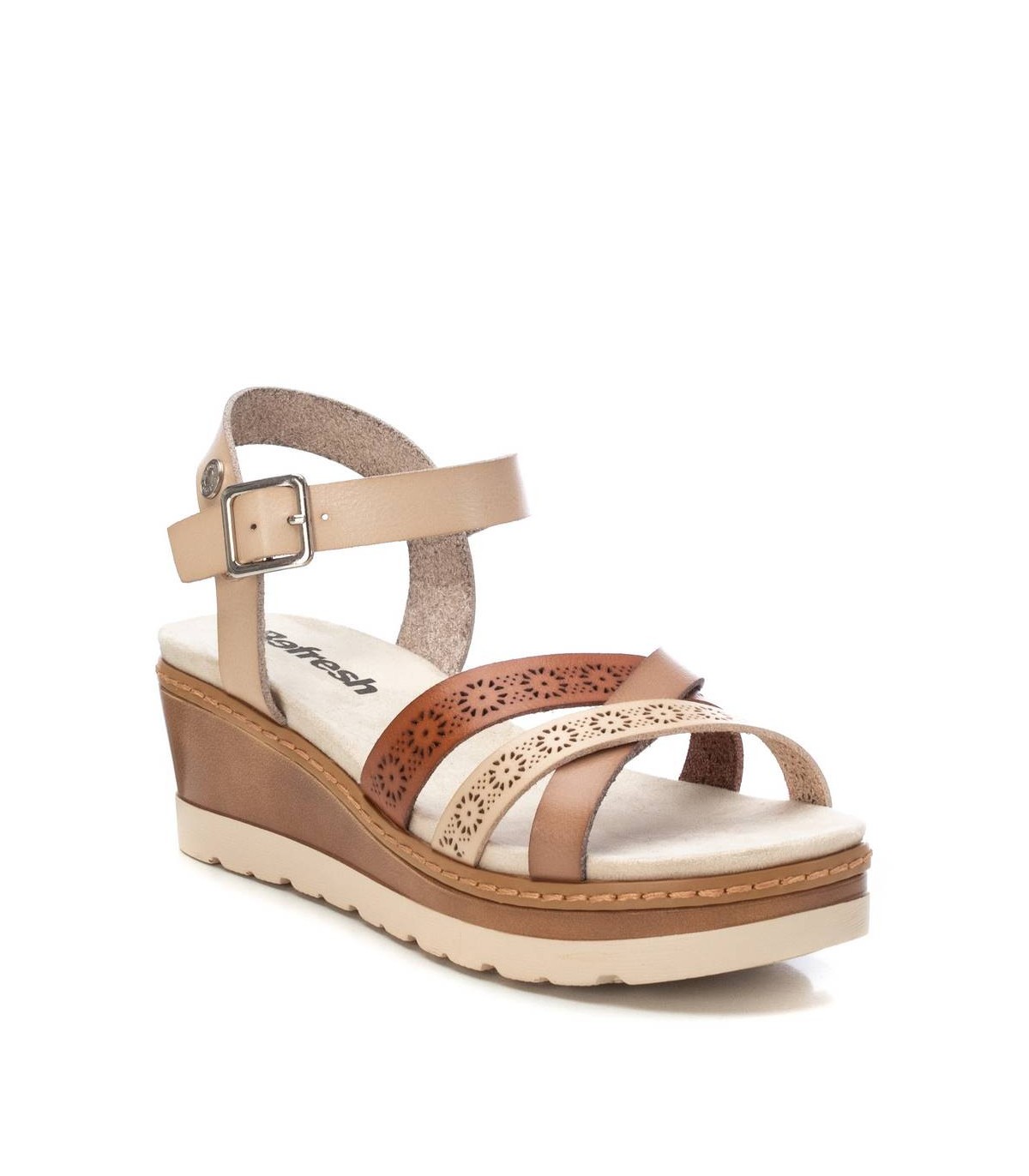 Sandalia de mujer, de la marca Refresh. Fabricada en material que imita a la piel. Diseño de pala multitiras con pulsera que ajusta el tobillo. Cómoda planta acolchada. Cuña de 6 cm con suela de goma antideslizante. Este modelo ha obtenido el certificado vegano por la organización mundial PETA (Organización de los derechos de los animales).