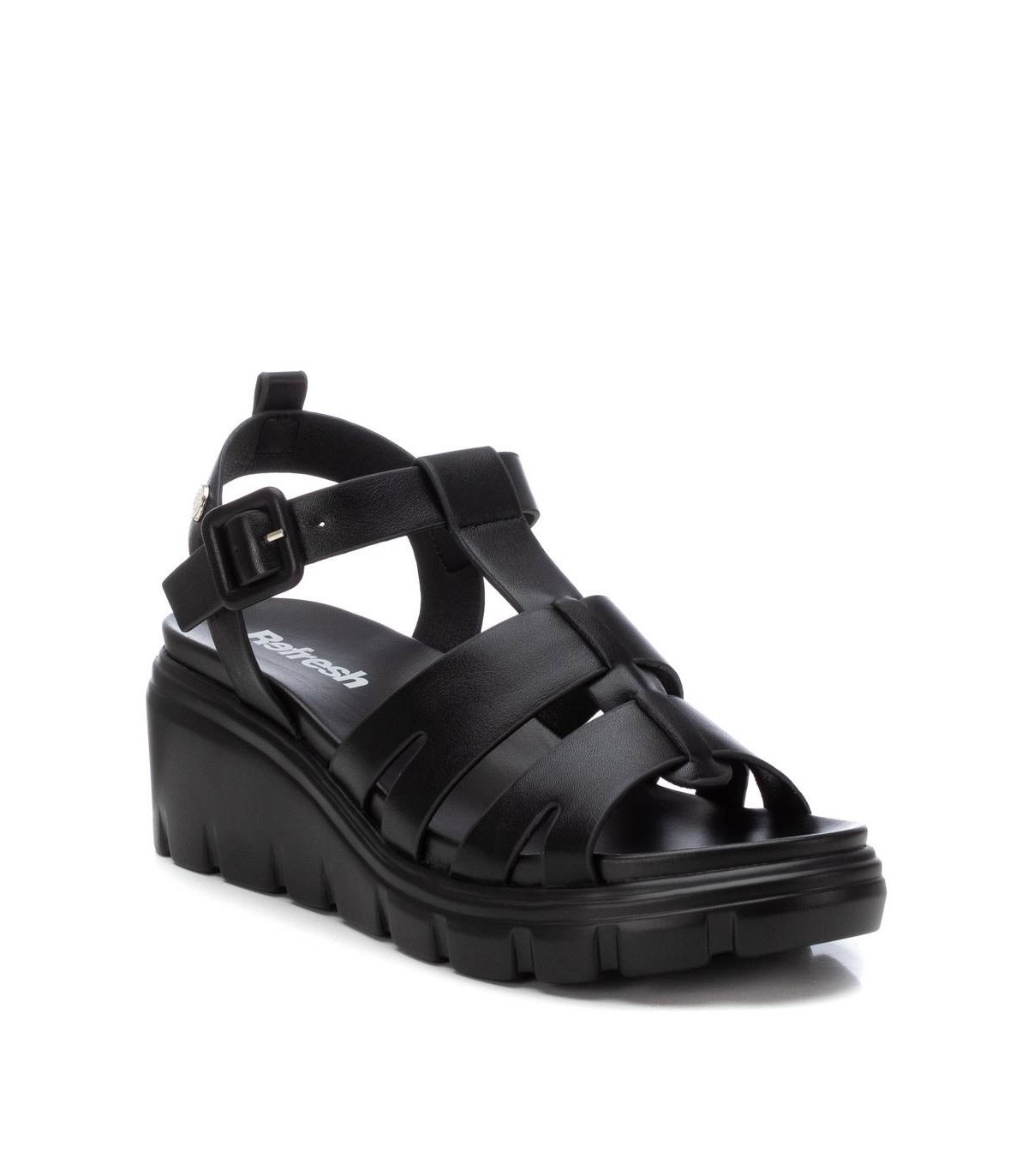 Sandalia de mujer, de la marca Refresh. Fabricada en material que imita a la piel. Modelo multitiras tipo cangrejera. Cierre mediante hebilla. Tirador trasero decorativo. Cómoda planta. Cuña de 6 cm. Este modelo ha obtenido el certificado vegano por la organización mundial PETA (Organización de los derechos de los animales).