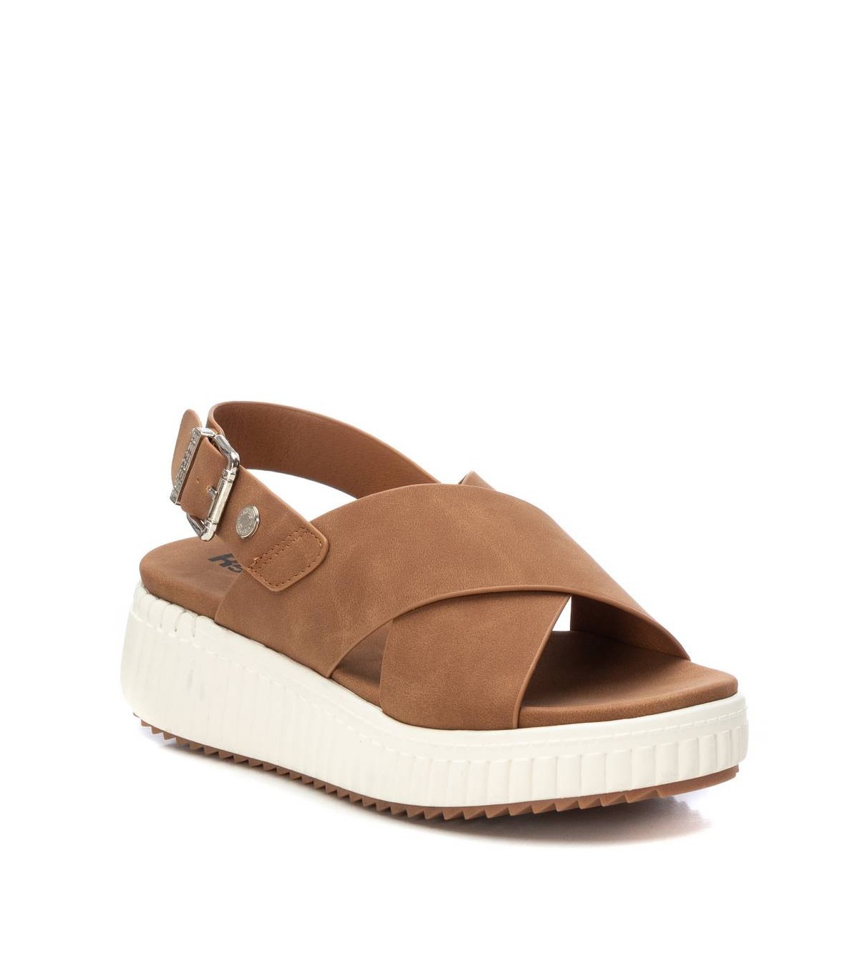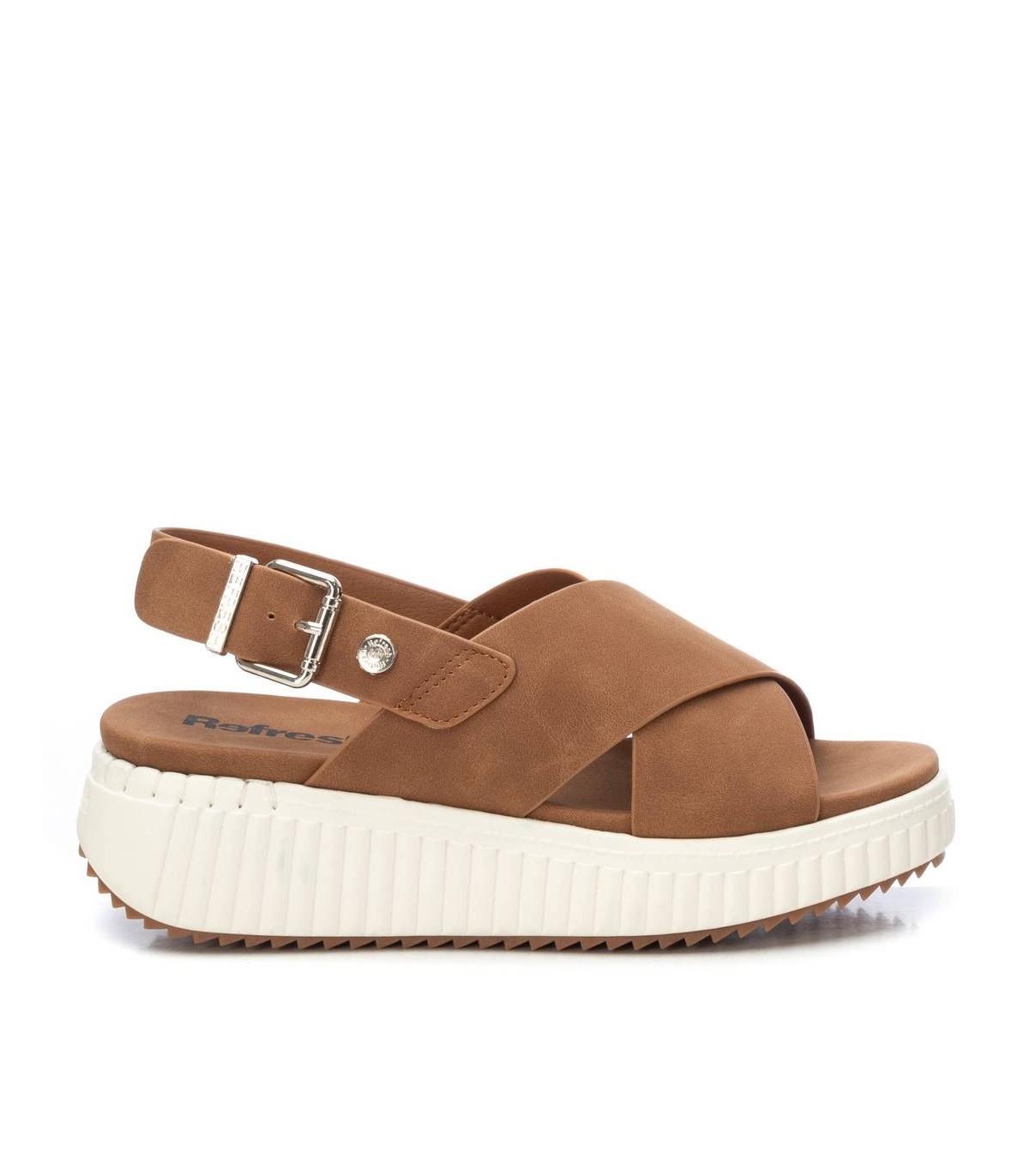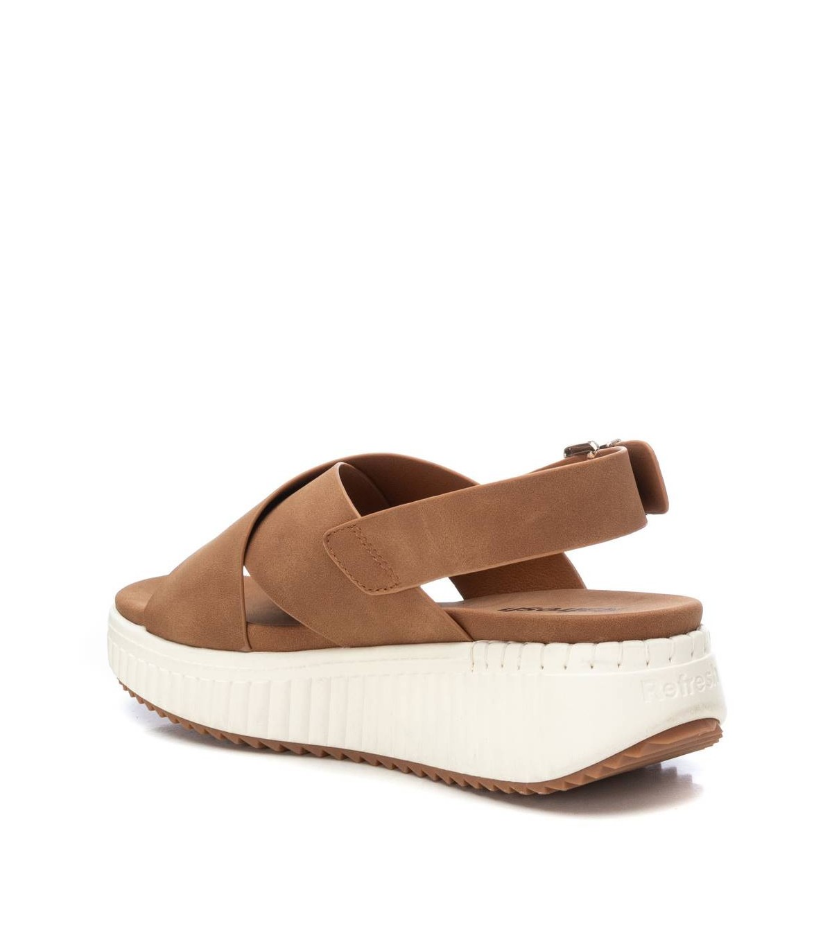 Sandalia de mujer, de la marca Refresh. Fabricada en material que imita a la piel. Diseño de doble pala cruzada con tira trasera para sujetar el talón. Cierre mediante hebilla. Cómoda planta acolchada. Suela canalada de goma antideslizante. Este modelo ha obtenido el certificado vegano por la organización mundial PETA (Organización de los derechos de los animales).