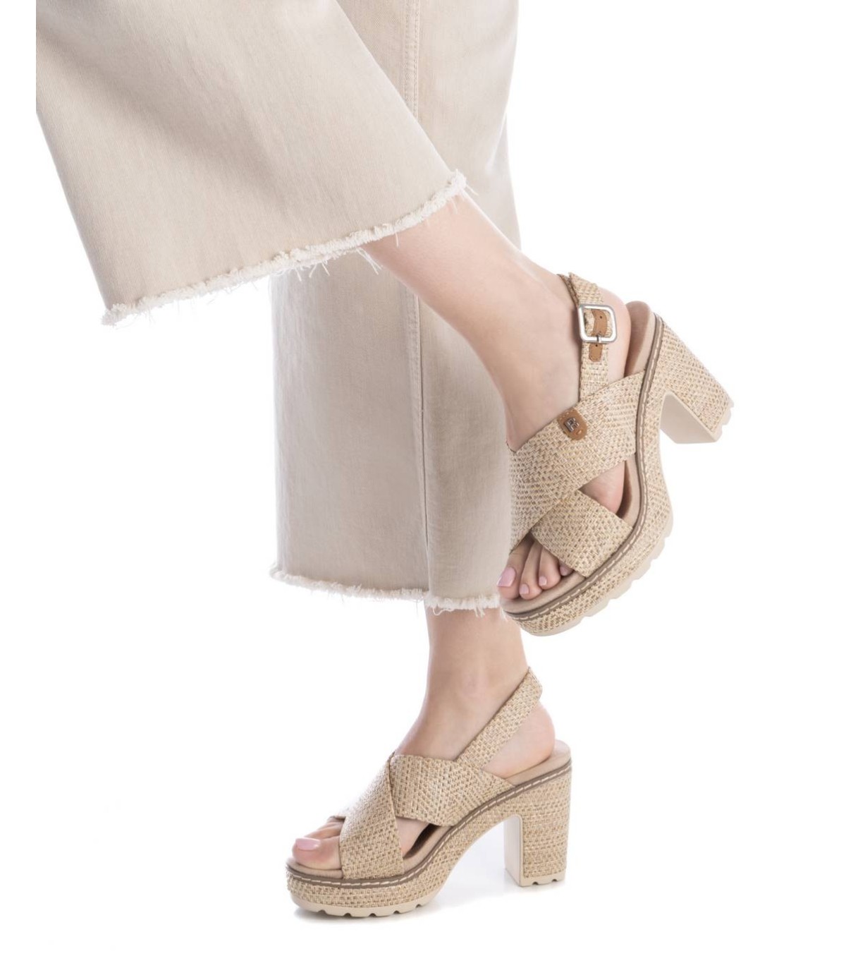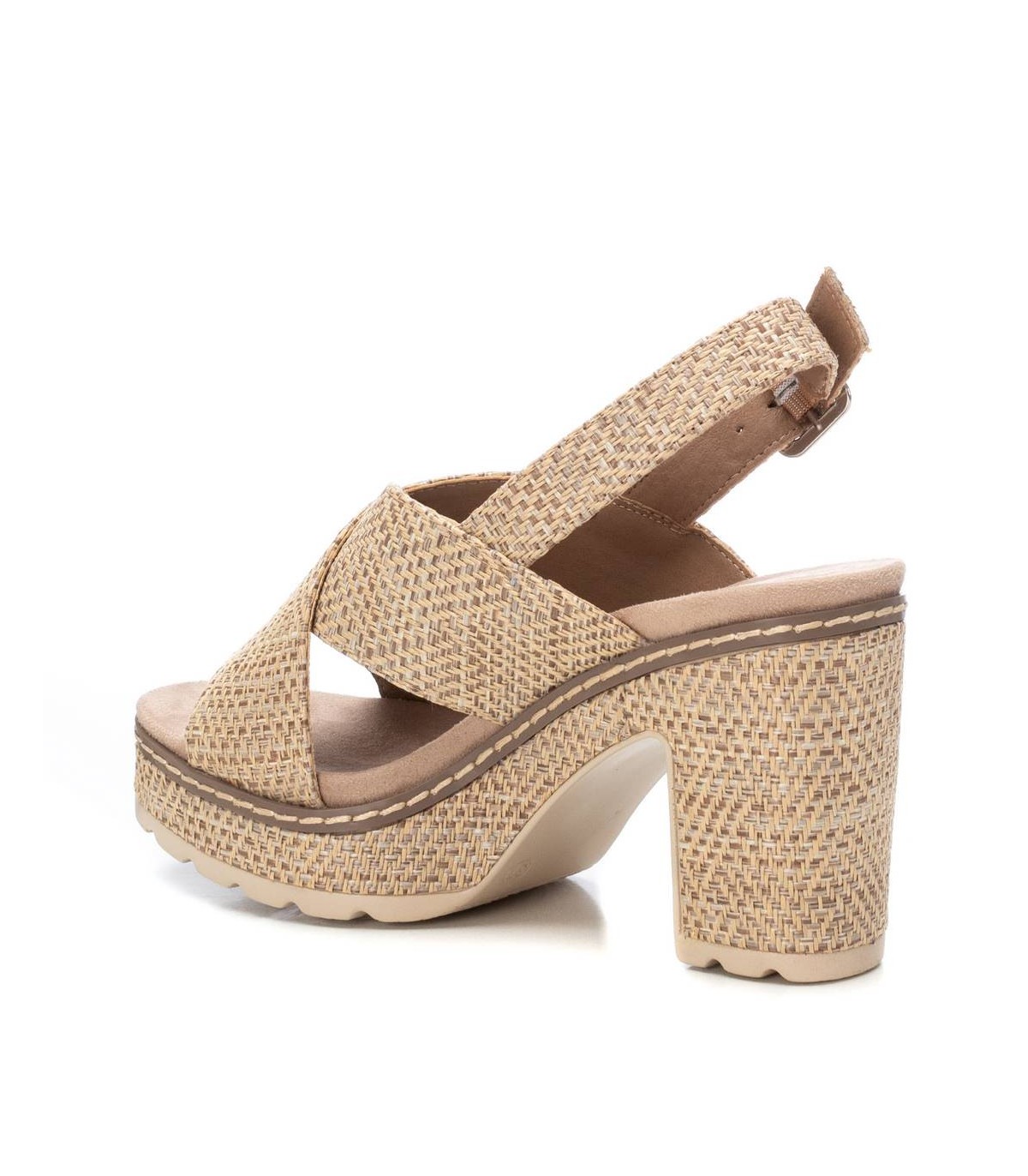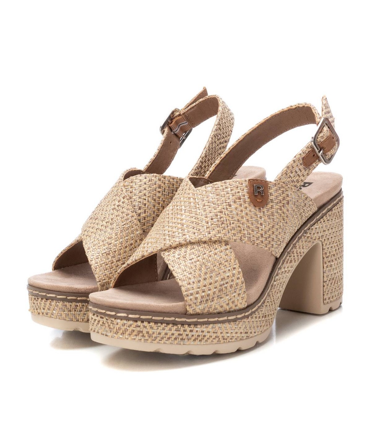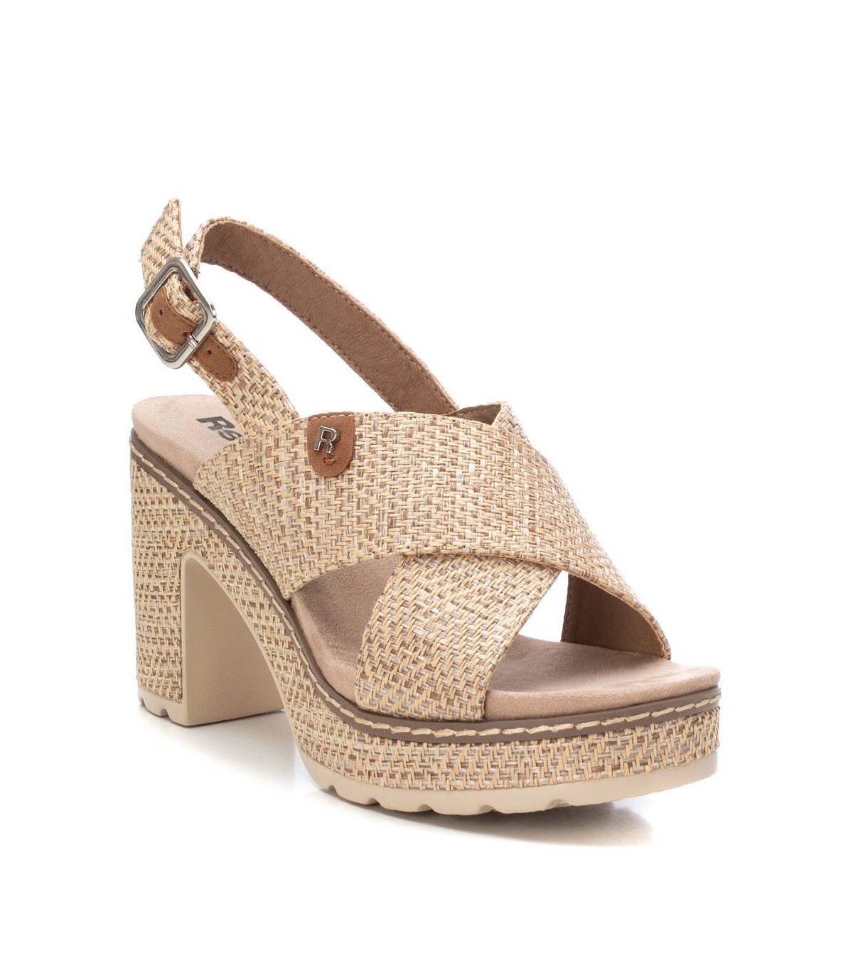 Sandalia de mujer, de la marca Refresh. Fabricada en material que simula la rafia. Doble pala cruzada con pulsera para un mejor ajuste. Cómoda planta acolchada. Tacón ancho de 10 cm forrado en el mismo material del corte. Suela de goma antideslizante. Este modelo ha obtenido el certificado vegano por la organización mundial PETA (Organización de los derechos de los animales).