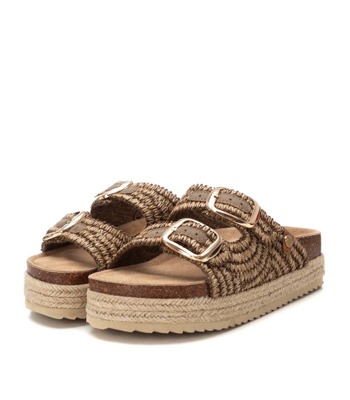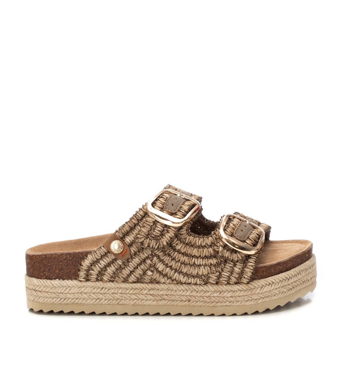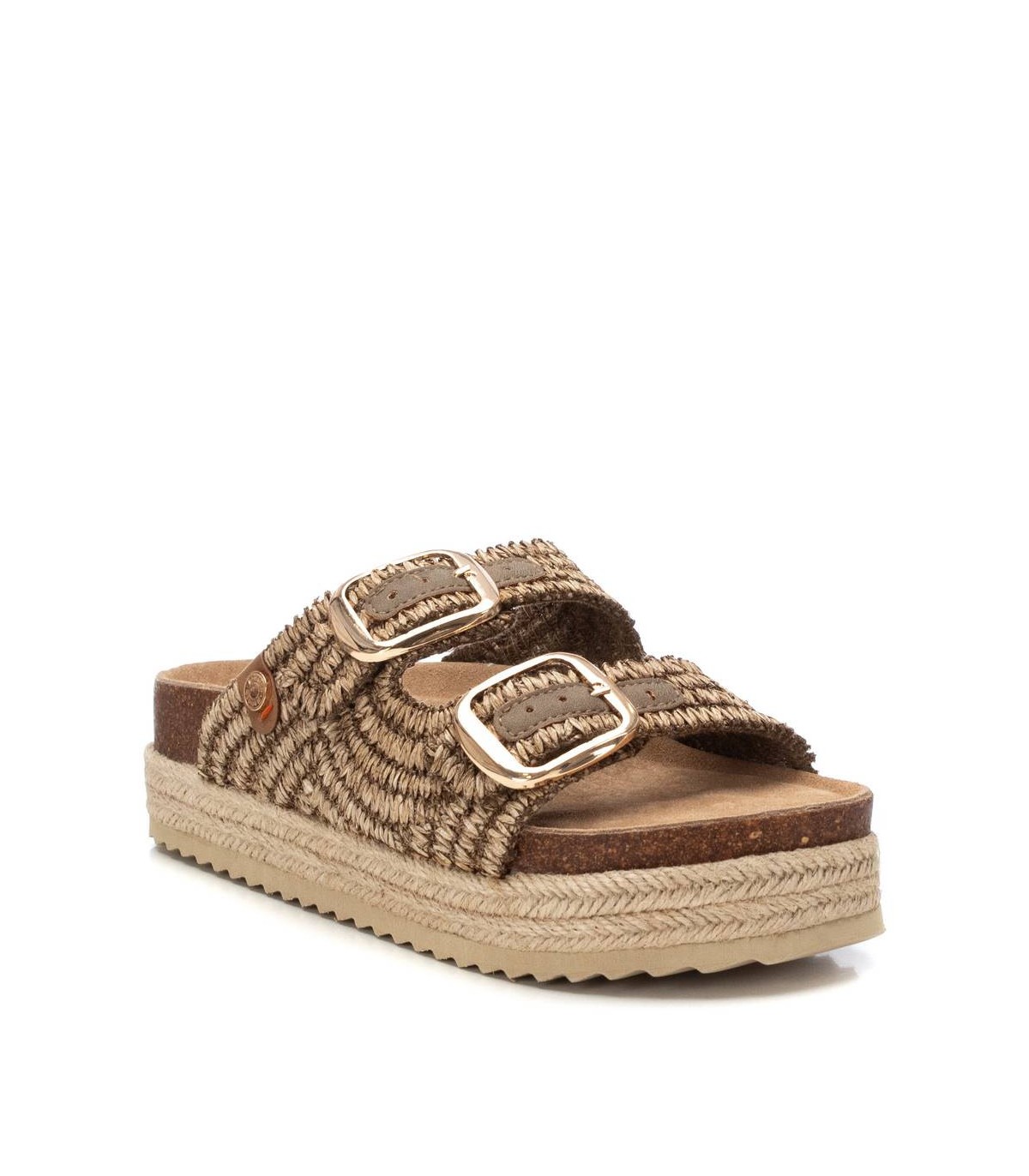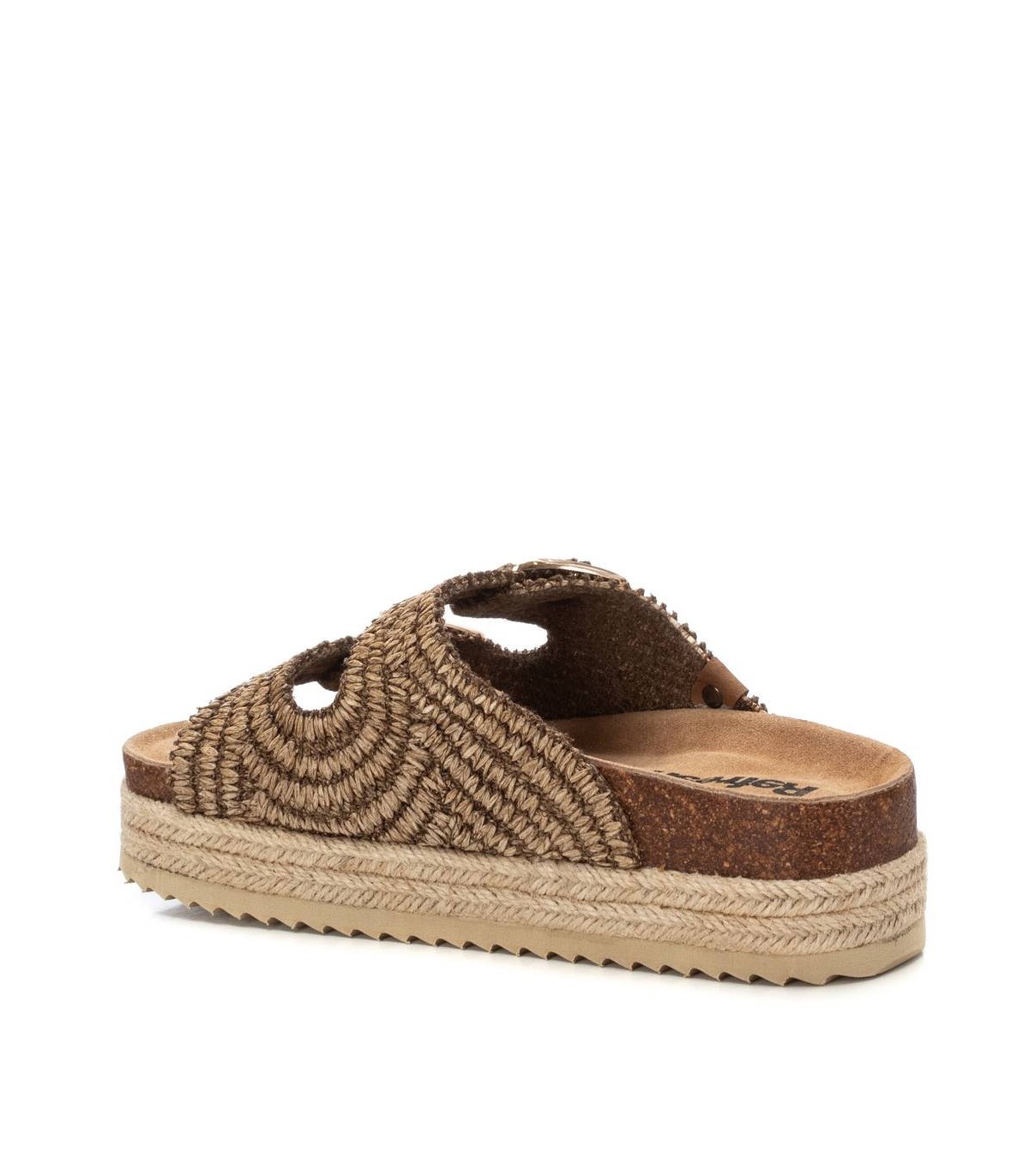 Sandalia de mujer, de la marca Refresh. Fabricada en tiras de material que simula la rafia. Modelo de doble pala con hebillas ajustables. Planta bios. Piso forrado en yute trenzado y suela antideslizante.