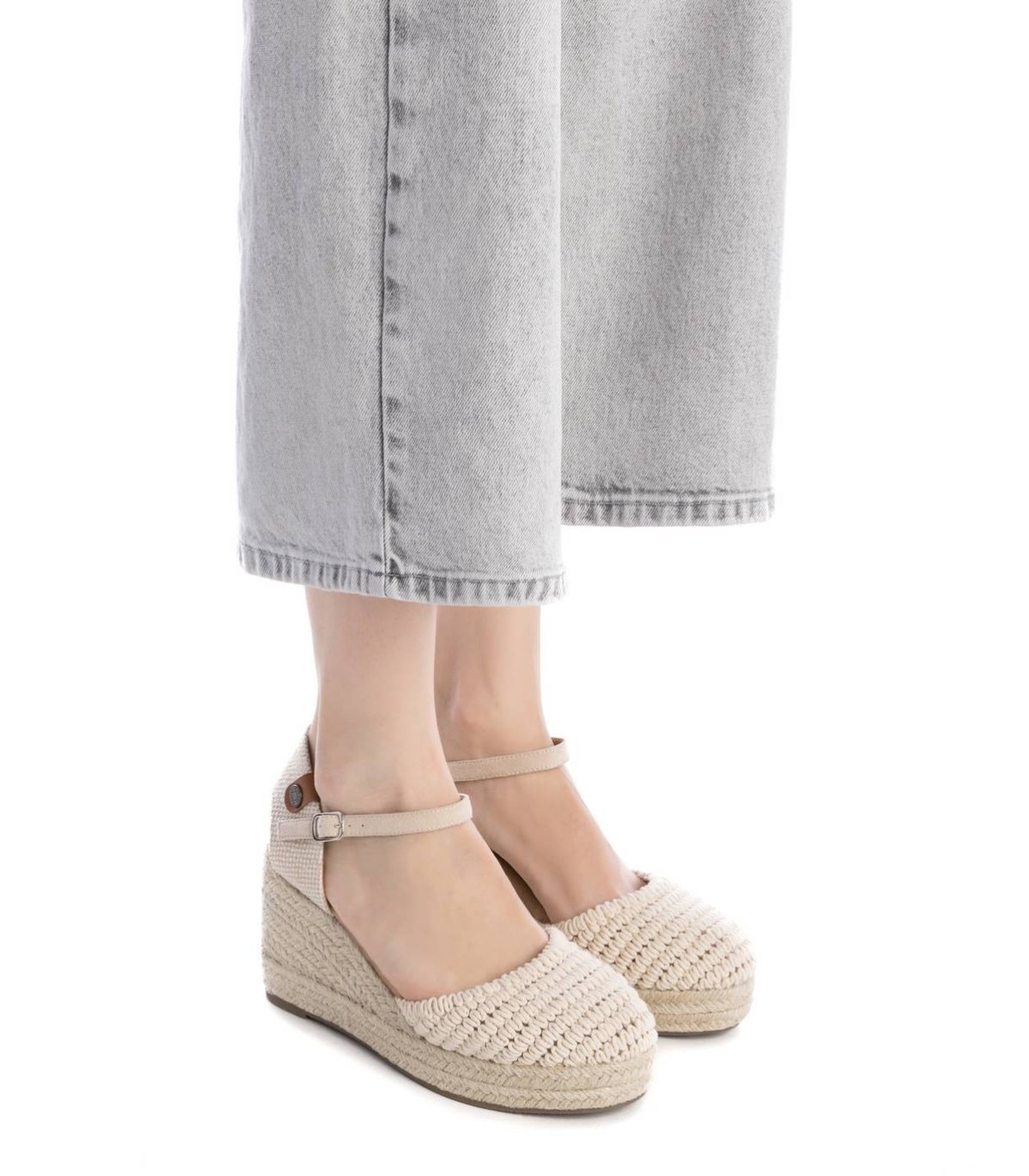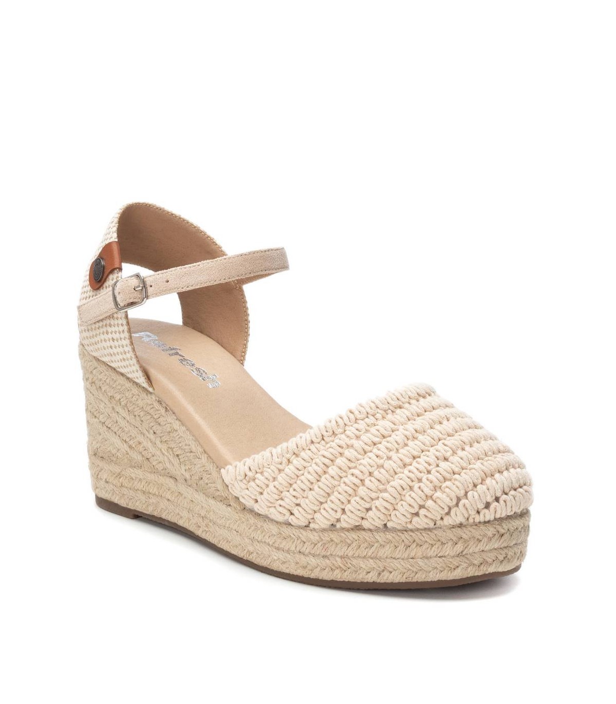 Alpargata de mujer, de la marca Refresh. Fabricada en tejido cruzado formando un dibujo. Pulsera al tobillo con hebilla. Cómoda planta. Cuña de 5 cm recubierta en tiras de yute trenzado. Suela de goma antideslizante. Este modelo ha obtenido el certificado vegano por la organización mundial PETA (Organización de los derechos de los animales).