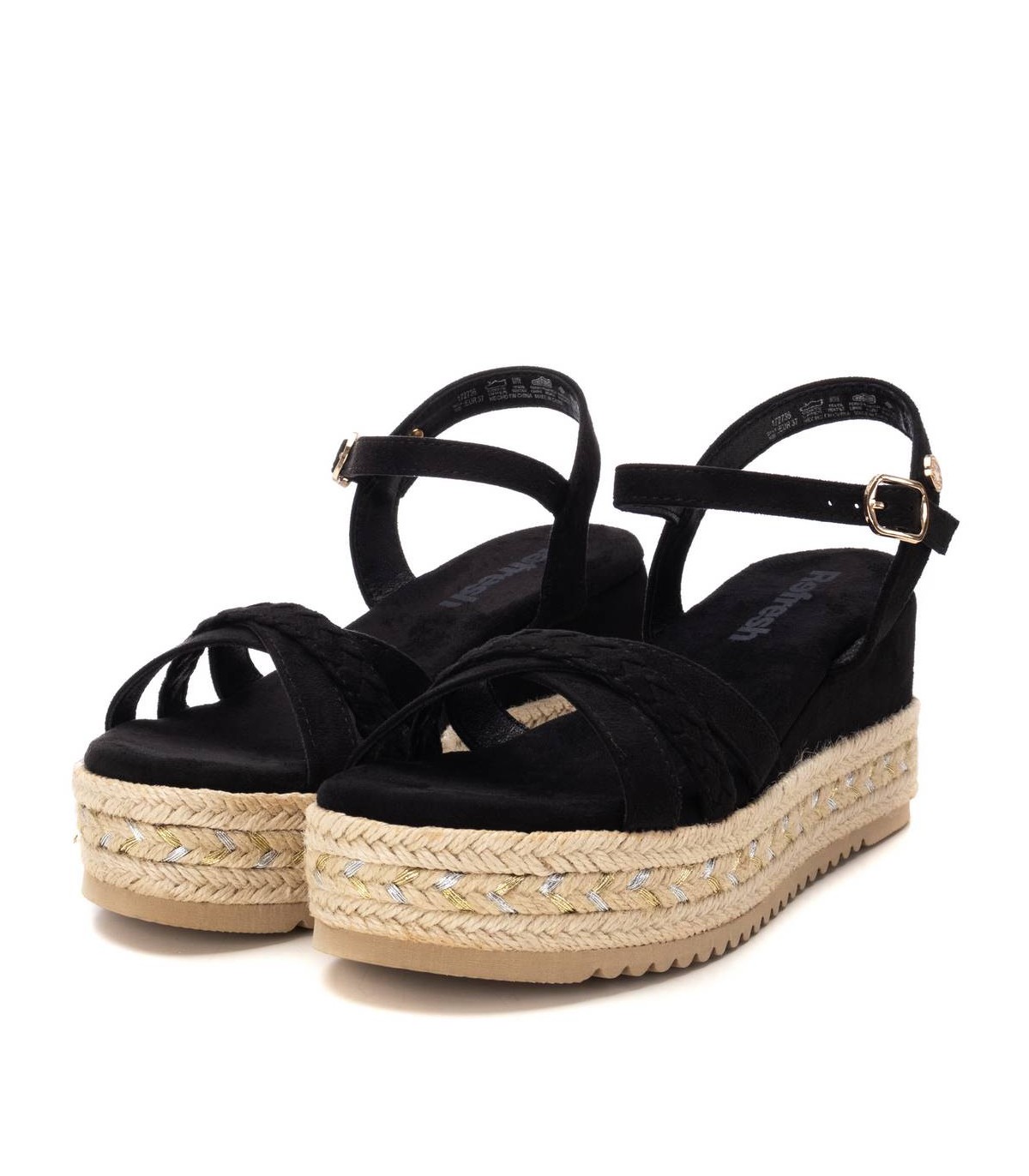 Sandalia de mujer, de la marca Refresh. Fabricada en antelina. Pala multitiras con pulsera trasera para ajustar al tobillo. Cierre de hebilla. Cómoda planta al tono. Cuña de 7 cm, forrada en antelina con plataforma recubierta en tiras de yute. Este modelo ha obtenido el certificado vegano por la organización mundial PETA (Organización de los derechos de los animales).