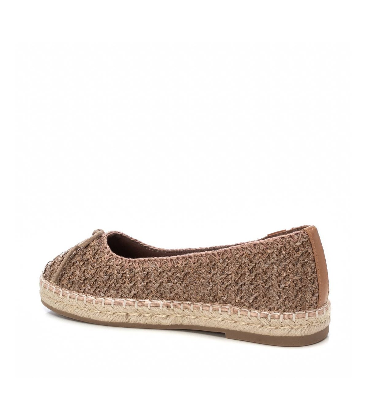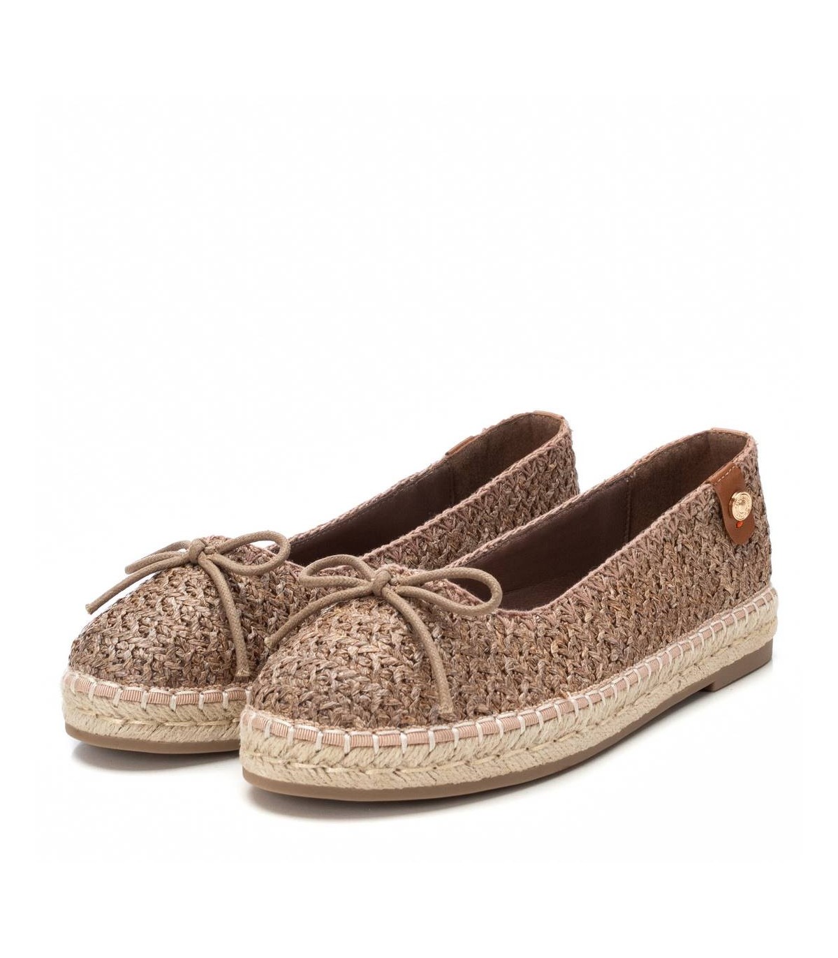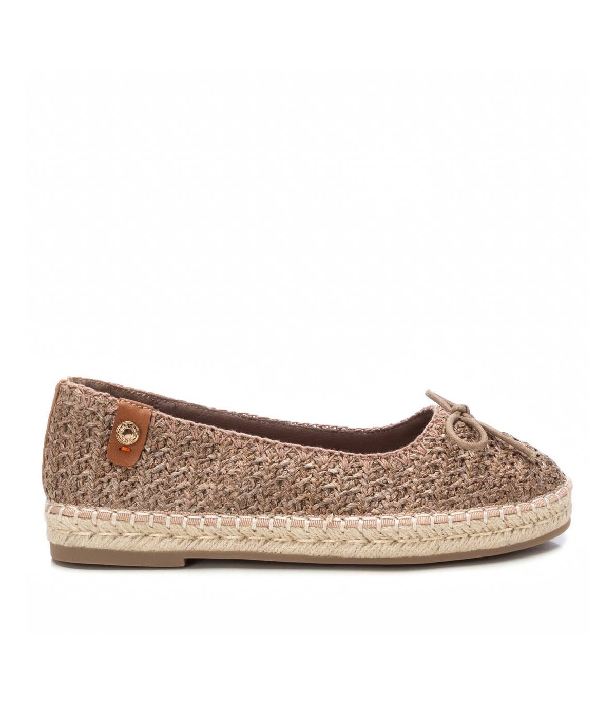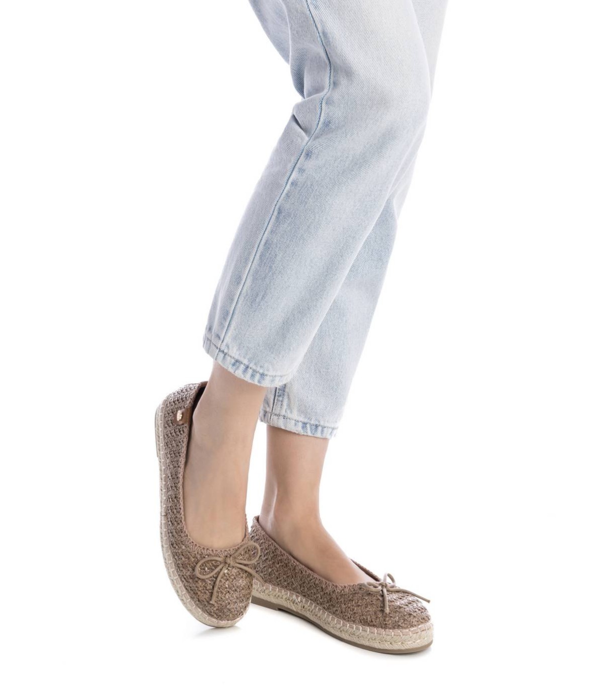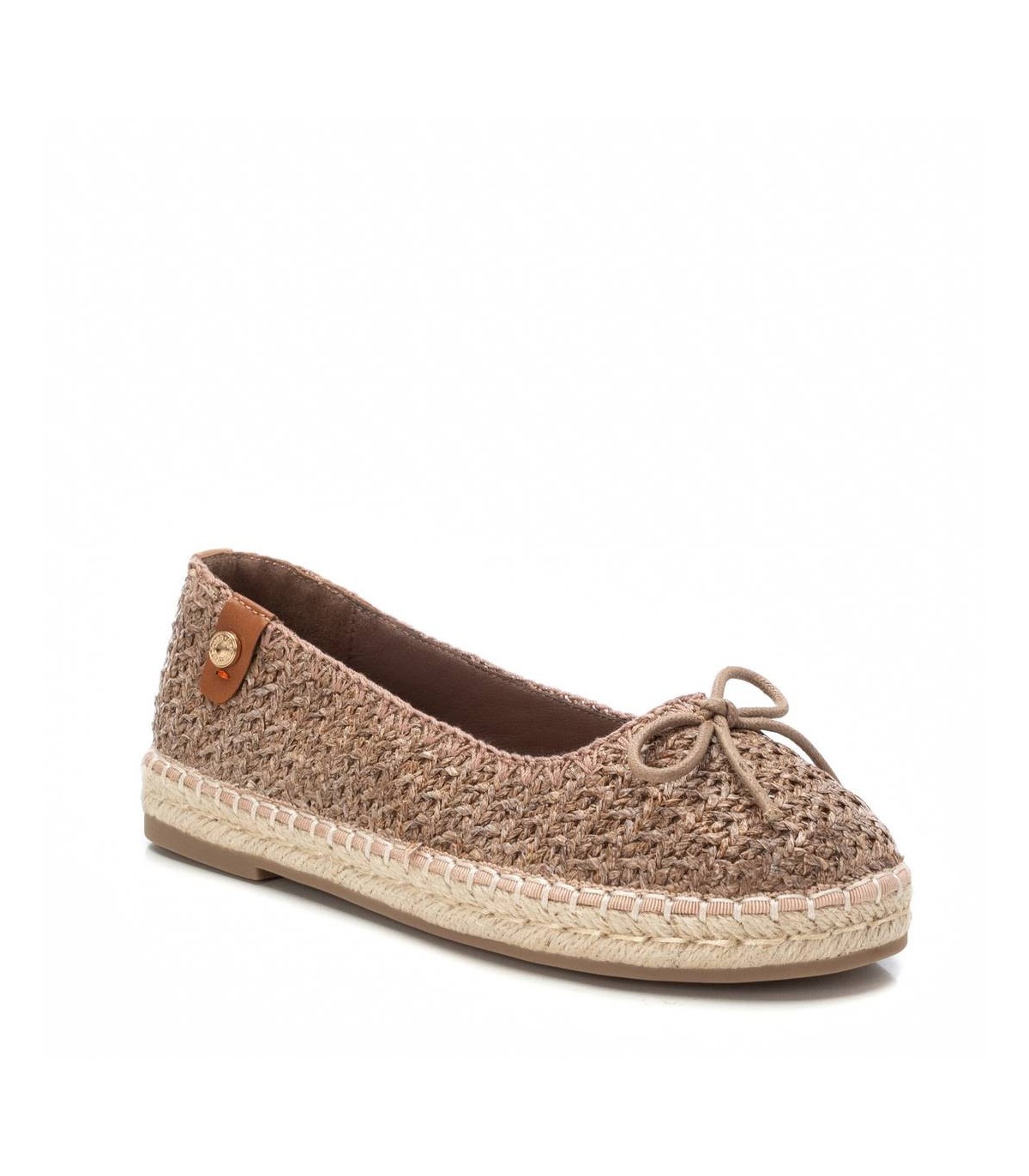 Zapato tipo bailarina, de la marca Refresh. Fabricado en material que simula rafia. Lazo decorativo. Piso de 3 cm con tira de yute. Suela de goma antideslizante. Este modelo ha obtenido el certificado vegano por la organización mundial PETA (Organización de los derechos de los animales).