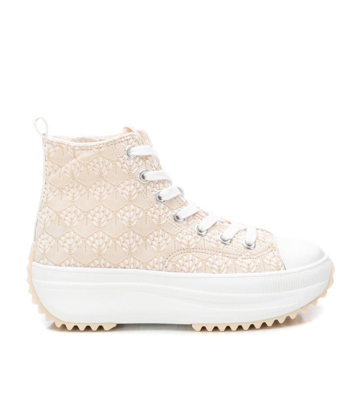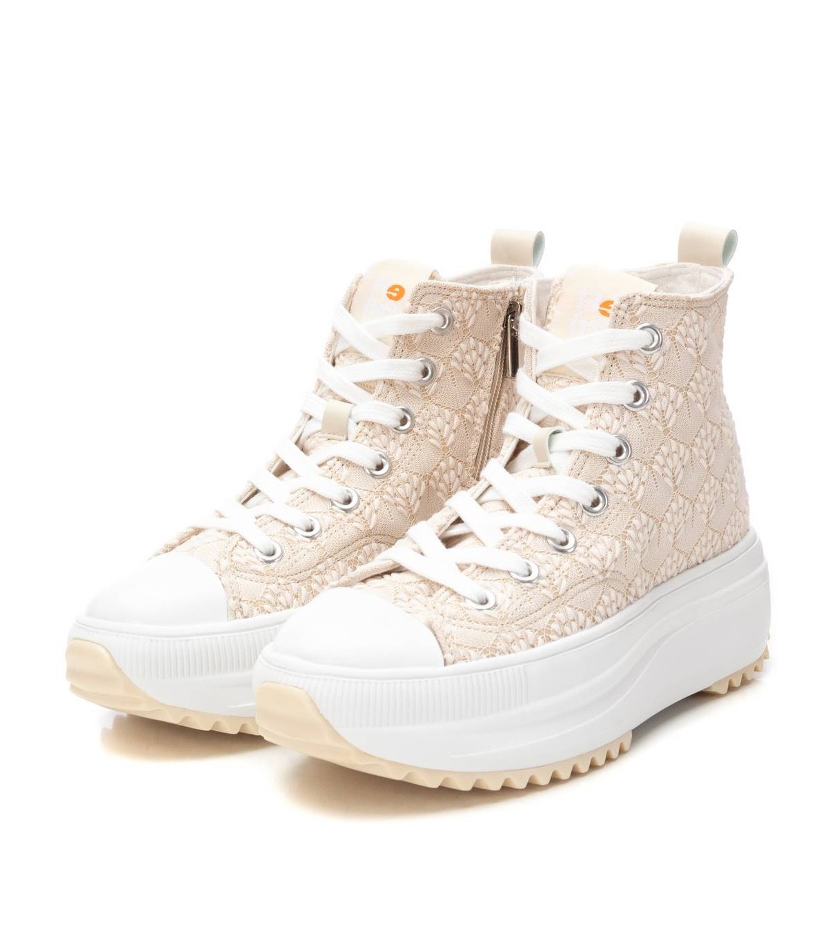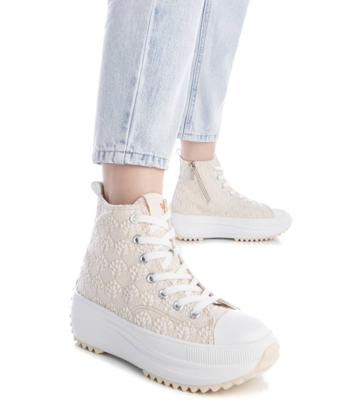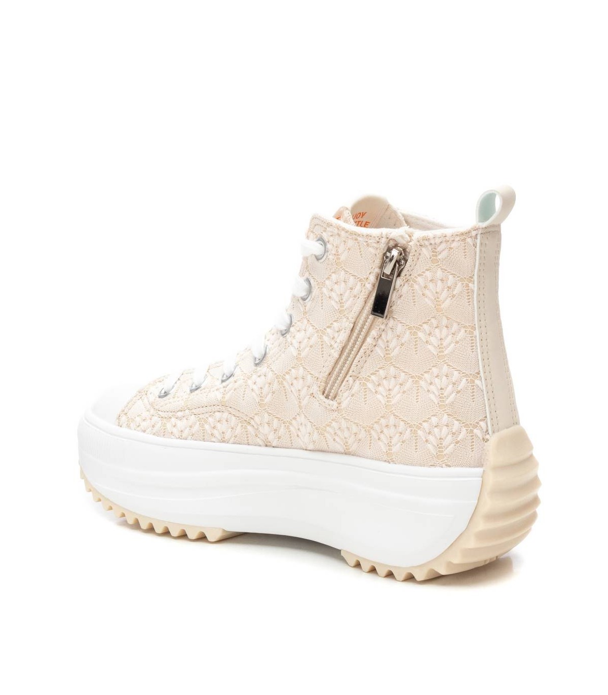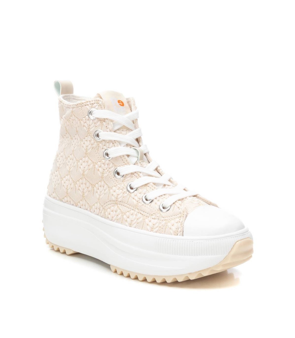 Zapatilla abotinada de mujer de la marca Refresh. Fabricada en textil con flores caladas. Cierre mediante cremallera interior y cordones para un mayor ajuste. Tirador trasero para facilitar la puesta. Suela volumen de 5 cm con diseño dentado de goma antideslizante. Este modelo ha obtenido el certificado vegano por la organización mundial PETA (Organización de los derechos de los animales).