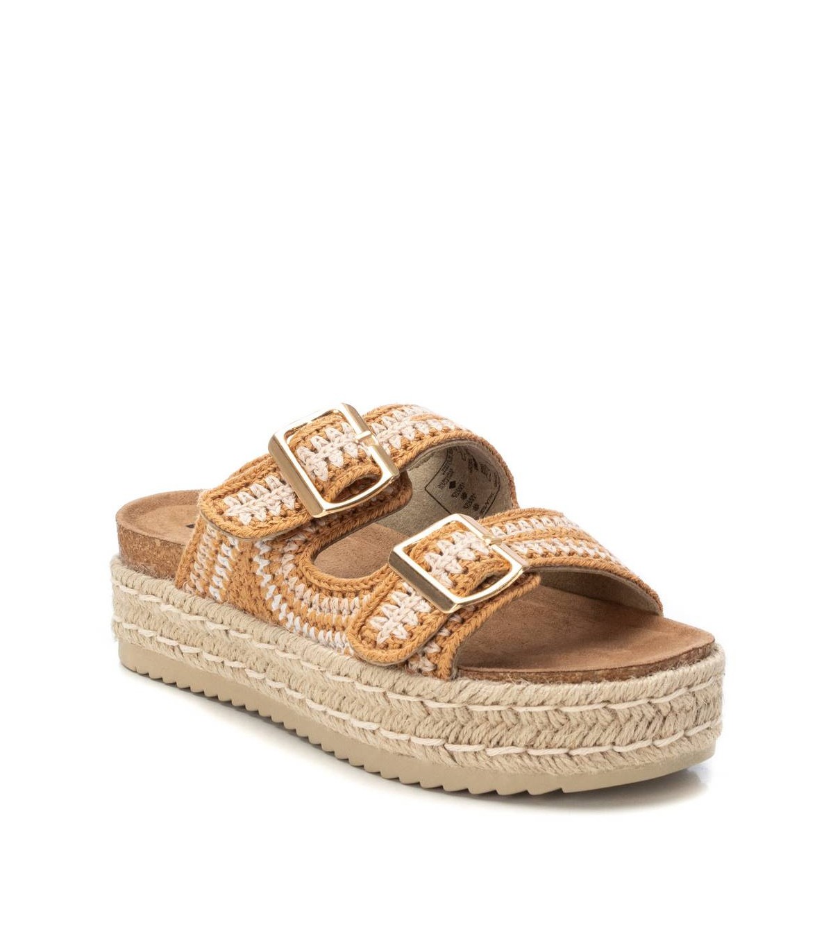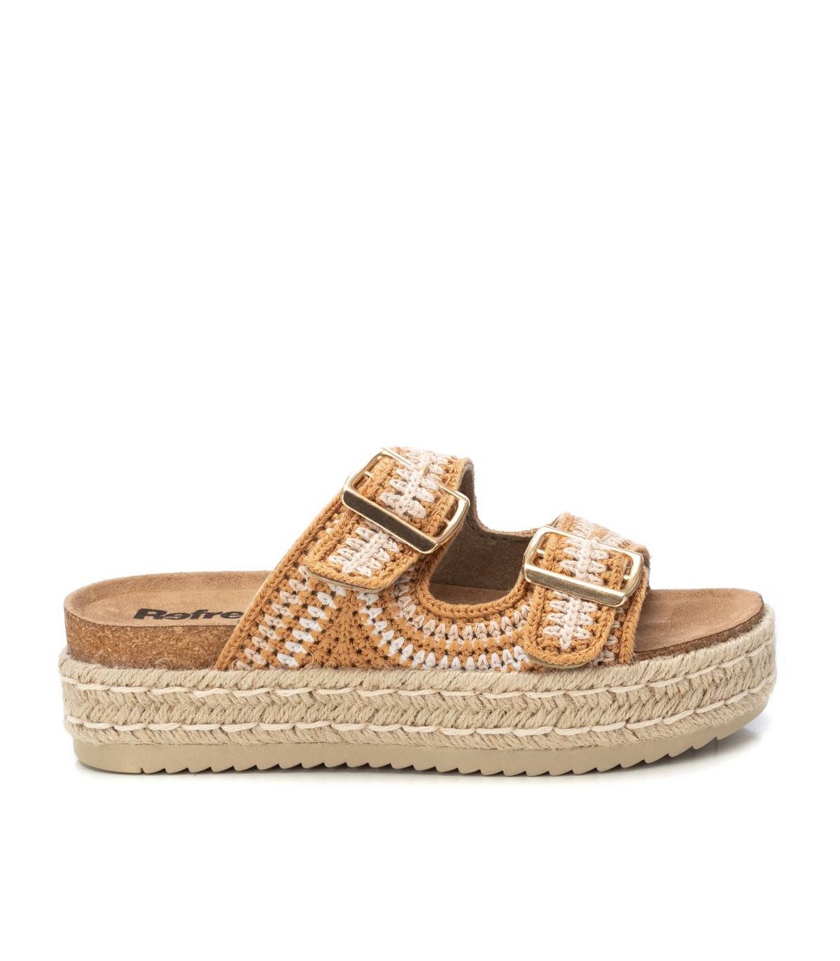 Sandalia de mujer, de la marca Refresh. Fabricada en textil multi tono. Diseño de doble pala con hebillas metalizadas en oro. Planta estilo bios. Piso de 5 cm recubierto en yute. Suela dentada antideslizante. Este modelo ha obtenido el certificado vegano por la organización mundial PETA (Organización de los derechos de los animales).