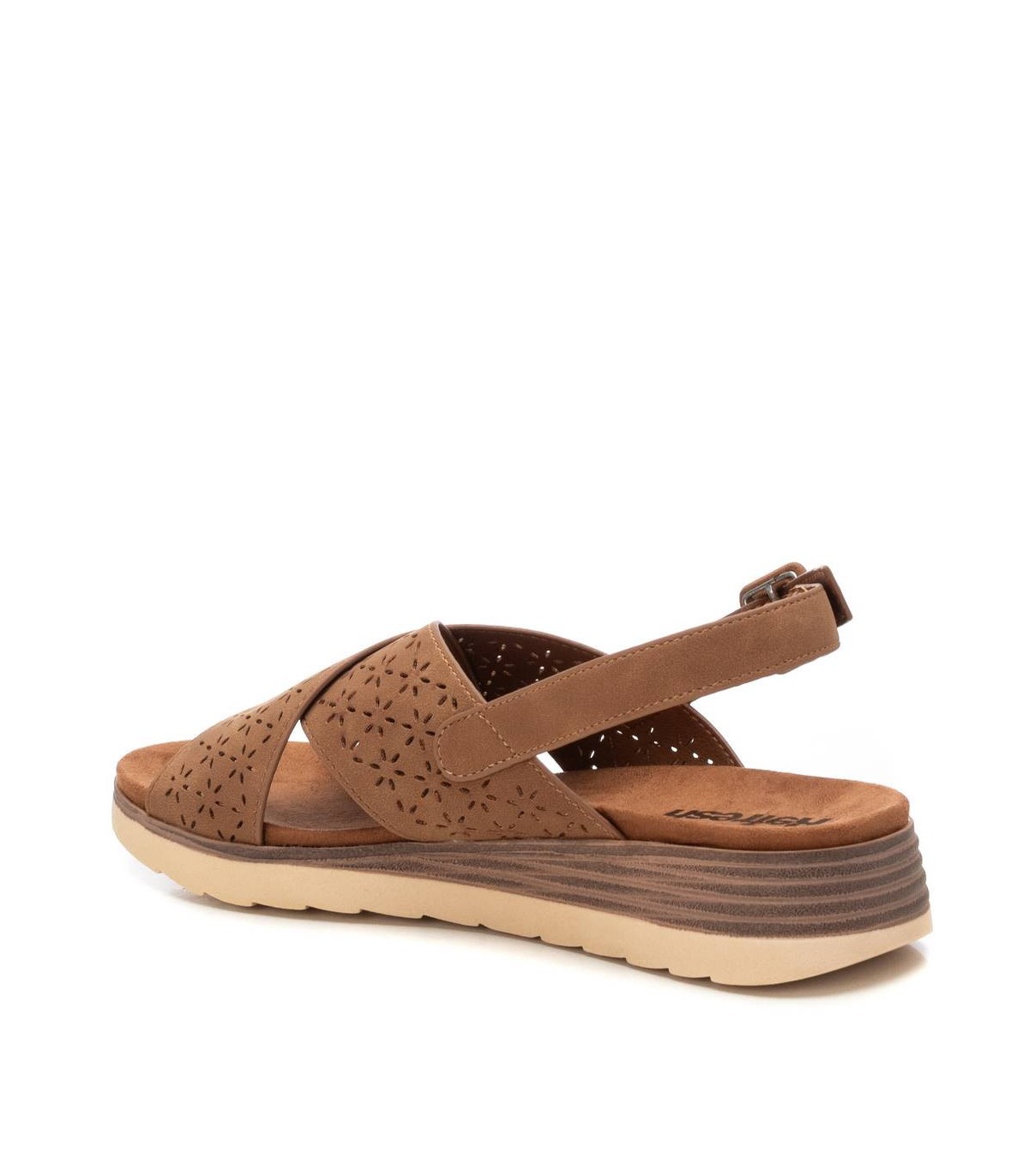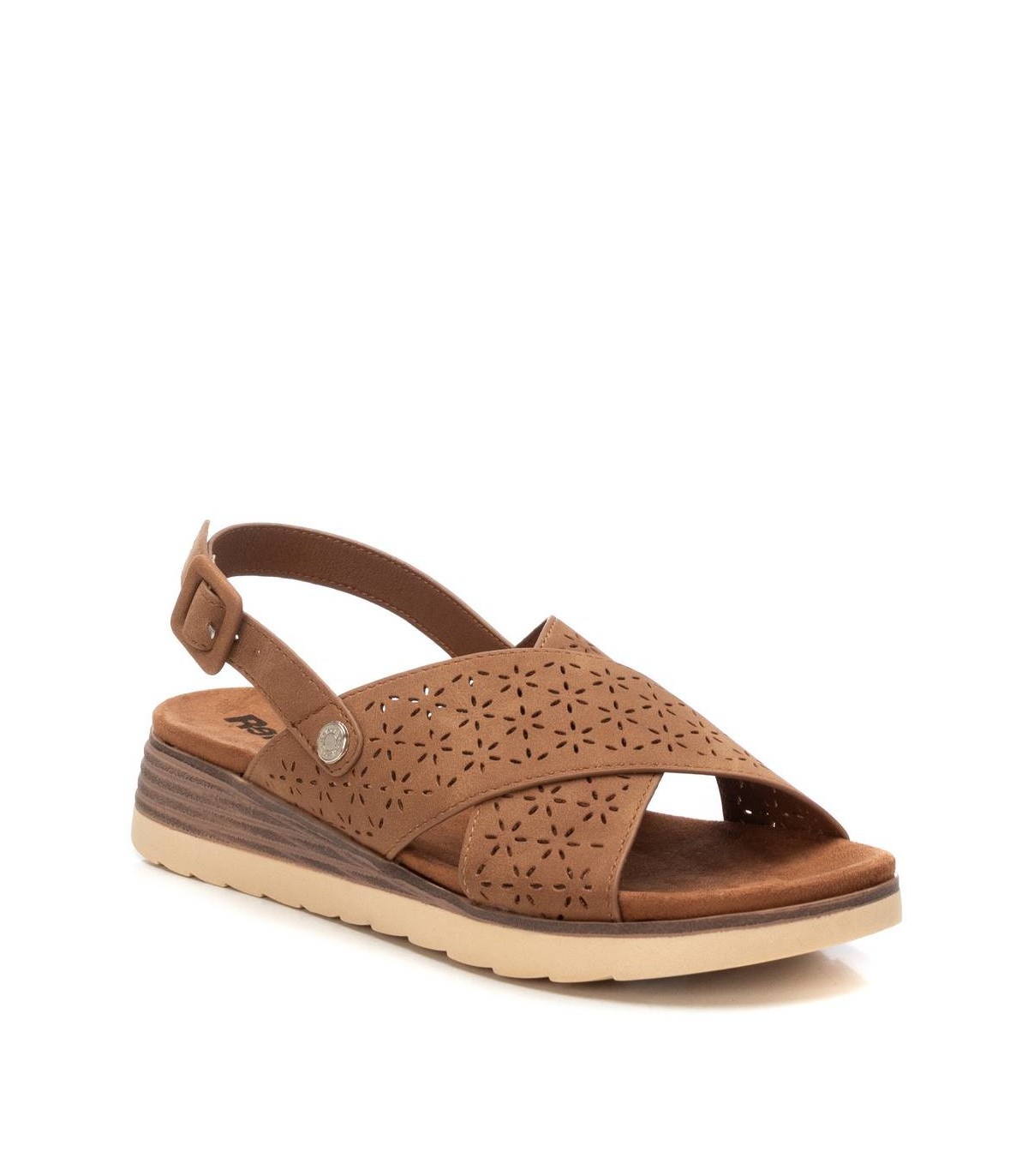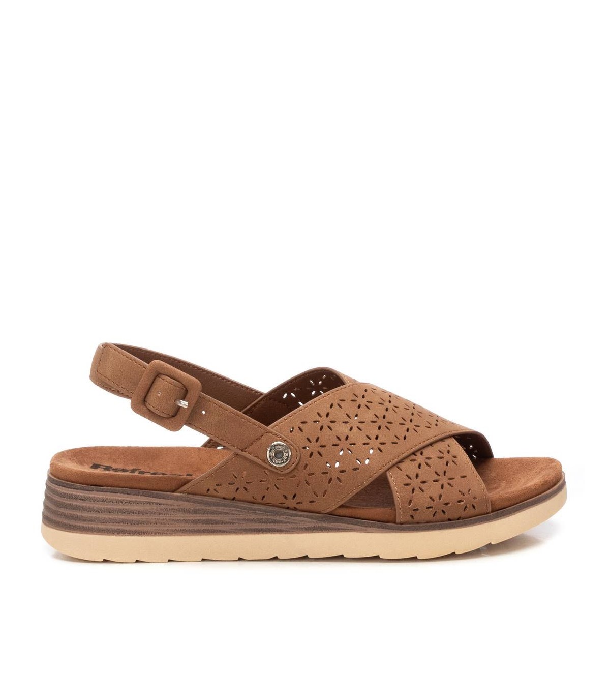 Sandalia de mujer, de la marca Refresh. Fabricada en material que imita a la piel con motivo calado decorativo. Diseño de pala ancha formada por dos tiras cruzadas. Correa con hebilla para sujetar al talón. Cómoda planta acolchada. Suela de goma antideslizante. Este modelo ha obtenido el certificado vegano por la organización mundial PETA (Organización de los derechos de los animales).
