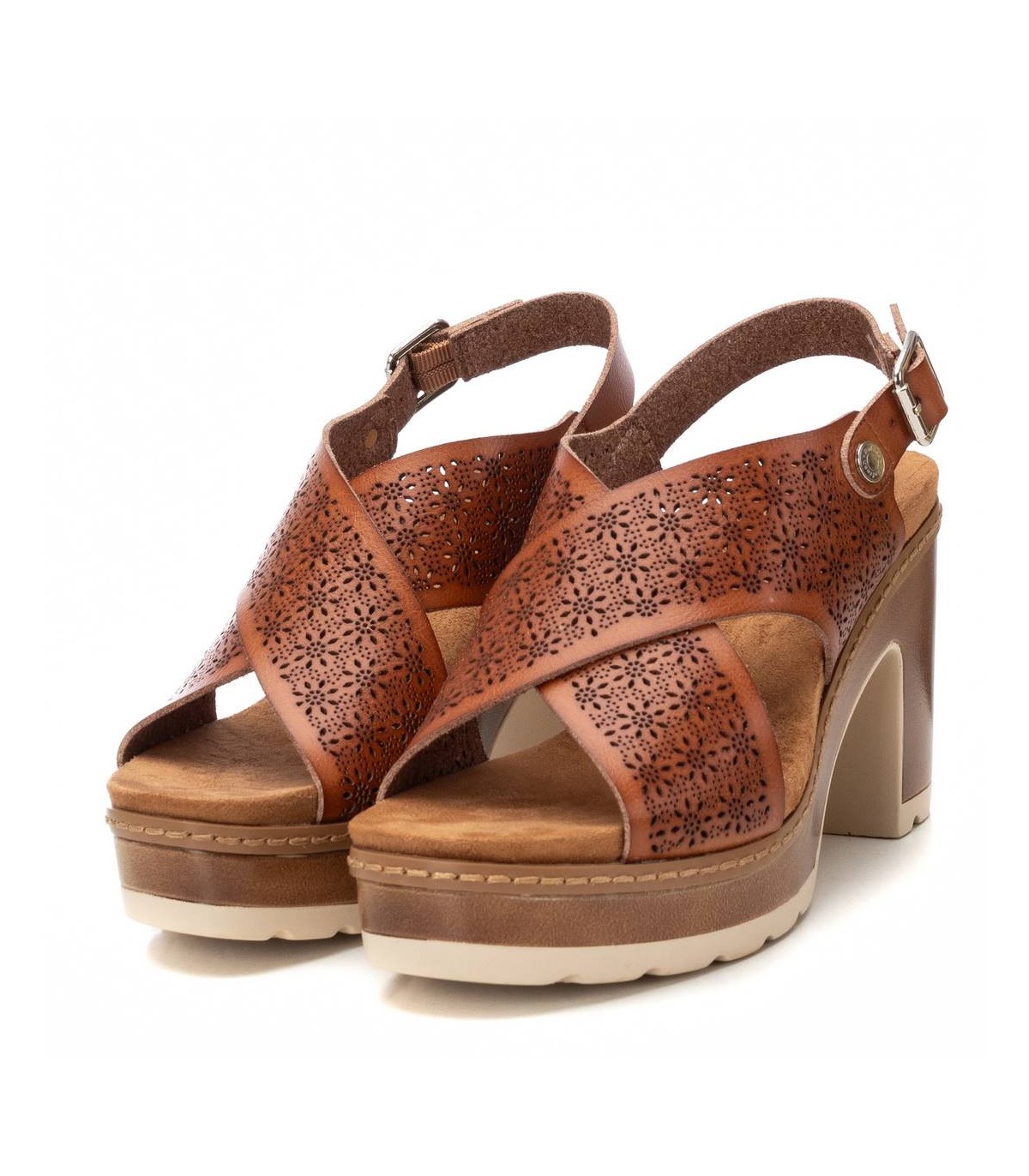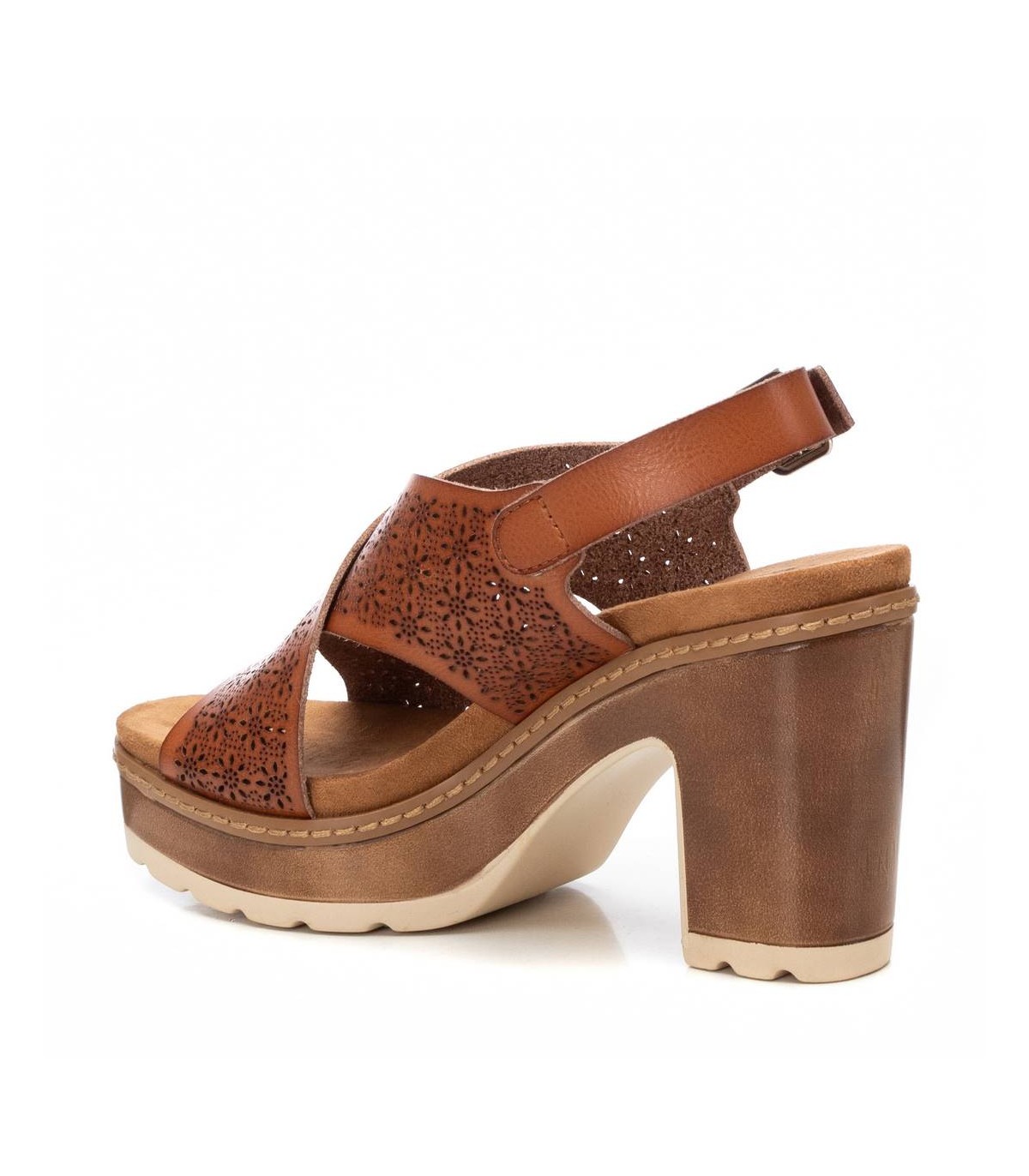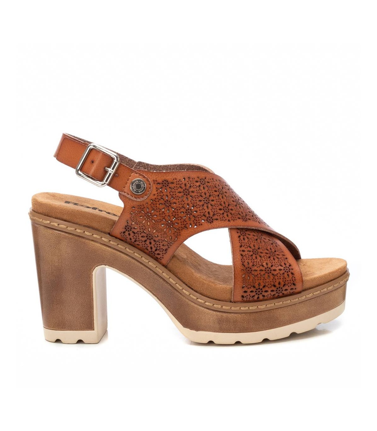 Sandalia de mujer, de la marca Refresh. Fabricada en material que imita a la piel. Pala ancha cruzada con correa al tobillo. Cierre mediante hebilla. Planta acolchada. Tacón de 10 cm con plataforma. Suela de goma antideslizante. Este modelo ha obtenido el certificado vegano por la organización mundial PETA (Organización de los derechos de los animales).