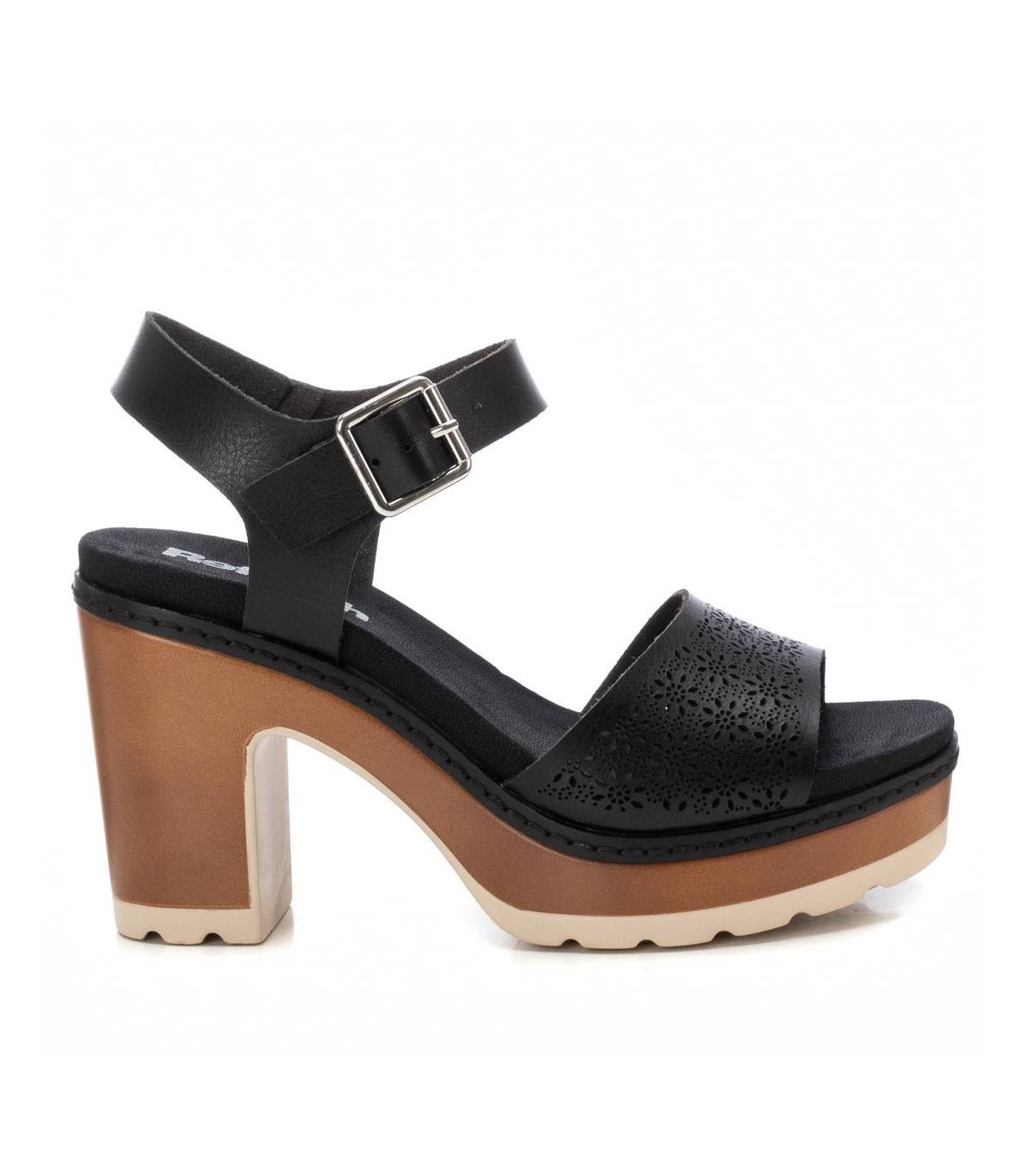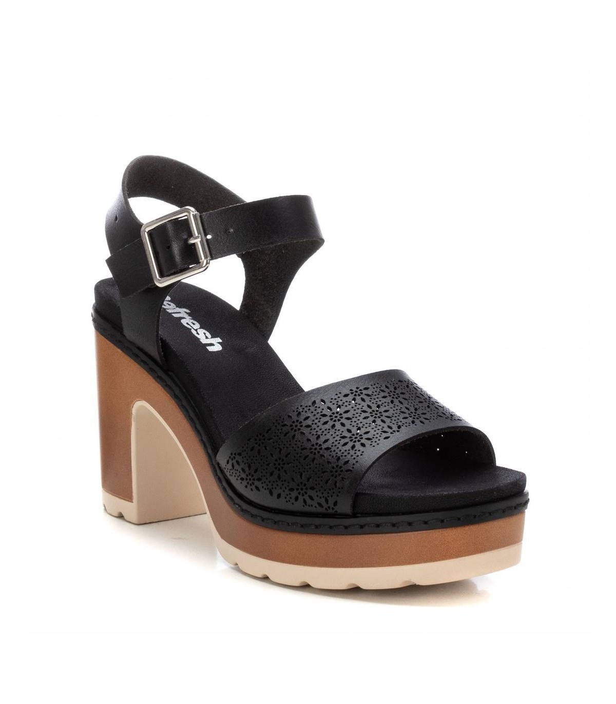 Sandalia de mujer, de la marca Refresh. Fabricada en material que imita la piel. Modelo de pala con motivo calado decorativo y pulsera al tobillo con hebilla. Cómoda suela acolchada. Tacón ancho de 10 cm y plataforma para mayor comodidad. Suela antideslizante. Este modelo ha obtenido el certificado vegano por la organización mundial PETA (Organización de los derechos de los animales).