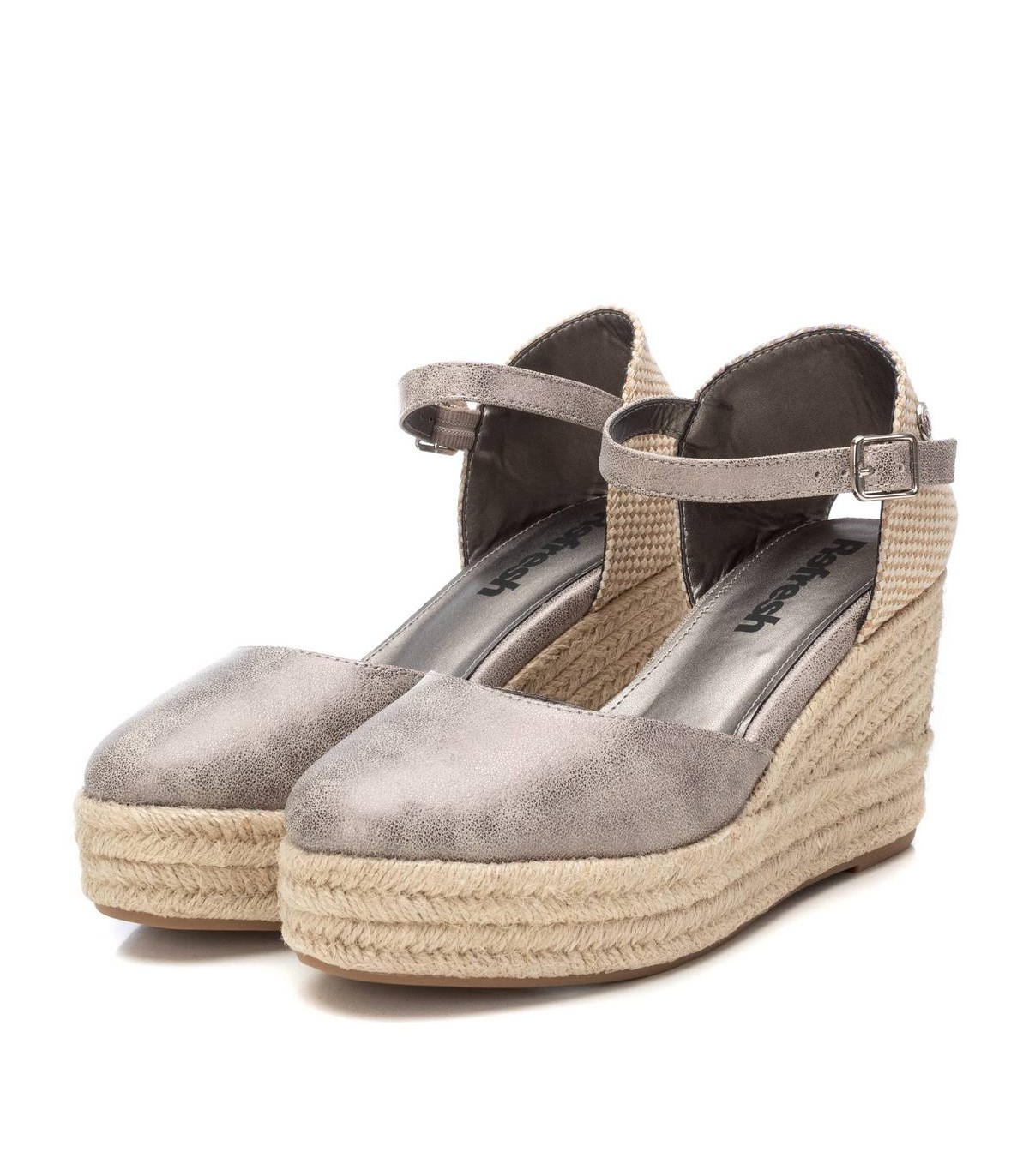 Alpargata tipo valenciana de mujer, de la marca Refresh. Fabricada en material que imita la piel con efecto metalizado. Pulsera al tobillo con hebilla. Cuña de 8 cm de yute y suela de goma antideslizante. Este modelo ha obtenido el certificado vegano por la organización mundial PETA (Organización de los derechos de los animales).