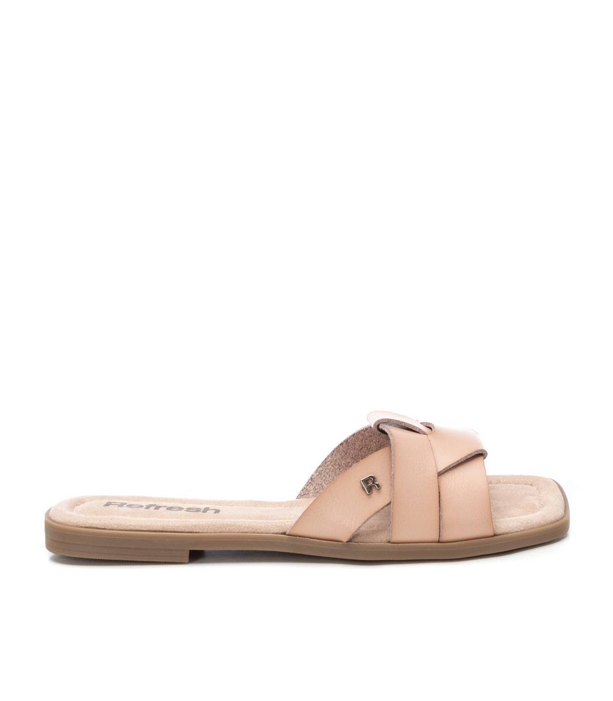 Sandalia de mujer, de la marca Refresh. Fabricada en material que imita la piel. Diseño tipo pala entrelazada. Cómoda planta acolchada. Suela flexible de goma antideslizante. Este modelo ha obtenido el certificado vegano por la organización mundial PETA (Organización de los derechos de los animales).