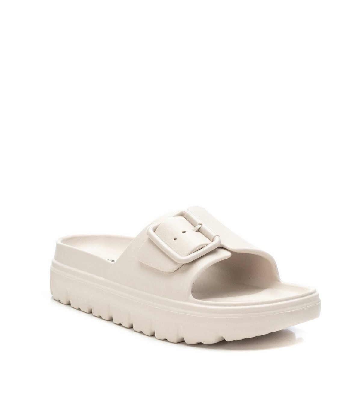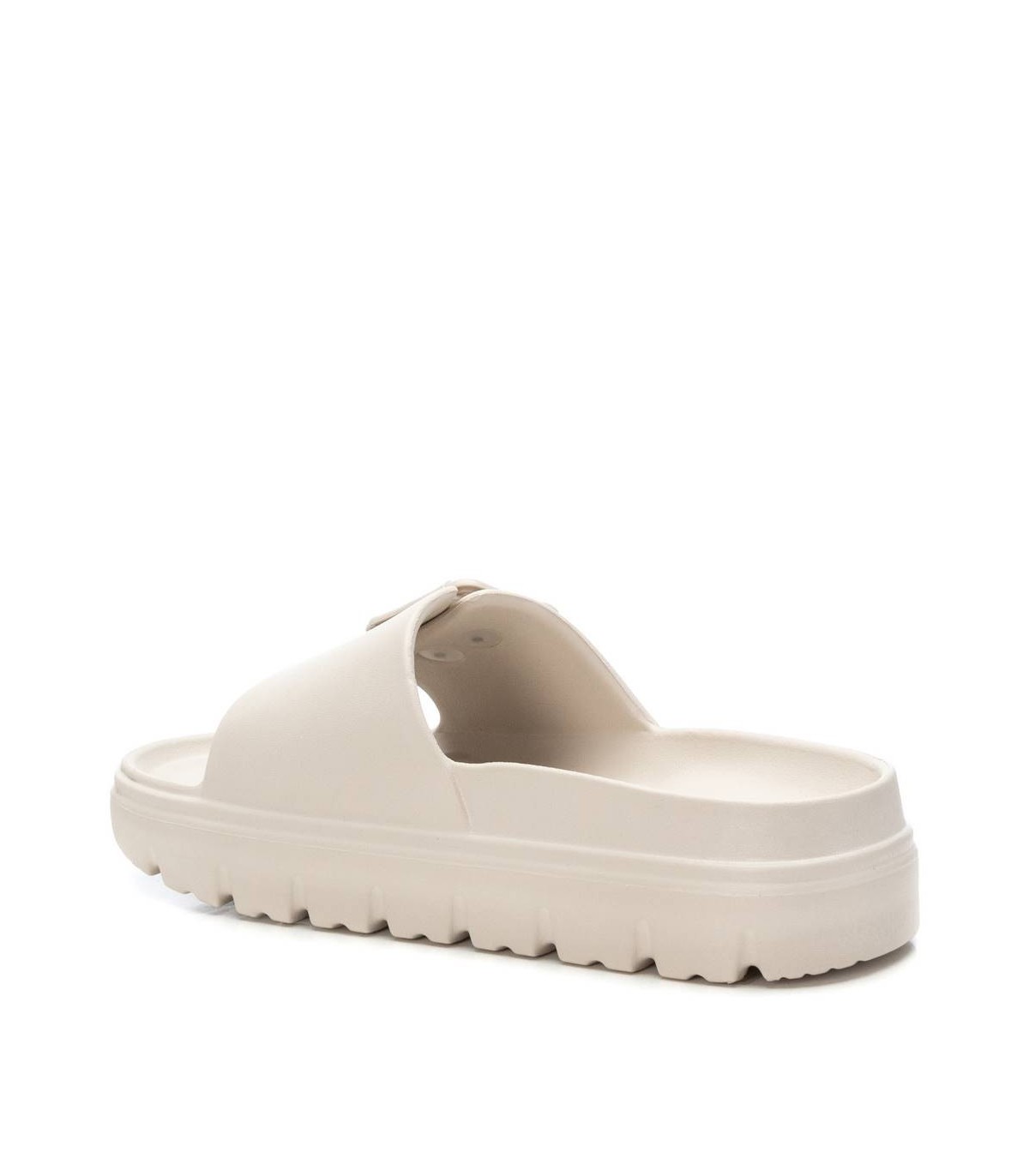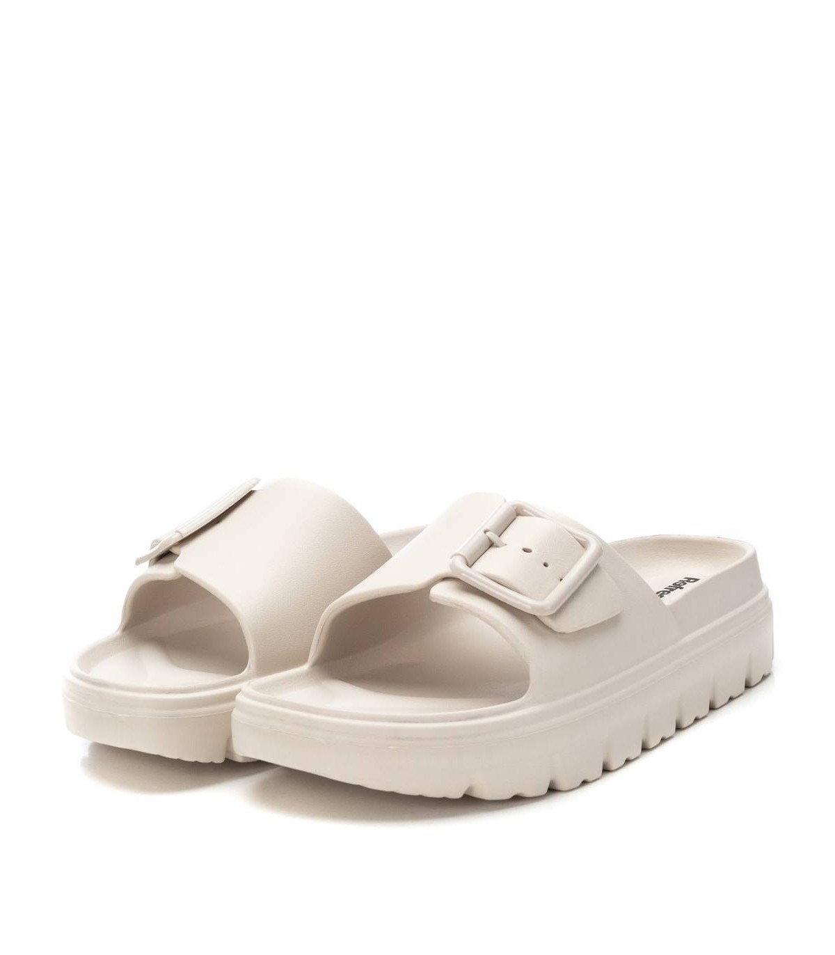 Chancla de playa de mujer, de la marca Refresh. Fabricada en caucho. Diseño de pala ancha con hebilla regulable. Suela antideslizante. Este modelo ha obtenido el certificado vegano por la organización mundial PETA (Organización de los derechos de los animales).