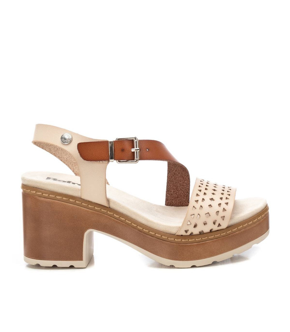 Sandalia de mujer de la marca Refresh. Fabricada en material que imita la piel con detalle calado. Correa cruzada con hebilla para un buen ajuste al pie. Tacón ancho de 8 cm con plataforma. Suela de goma. Este modelo ha obtenido el certificado vegano por la organización mundial PETA (Organización de los derechos de los animales).