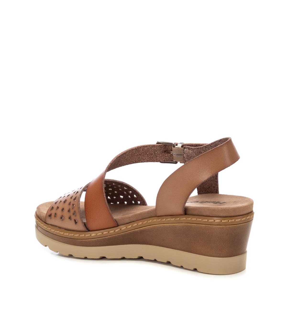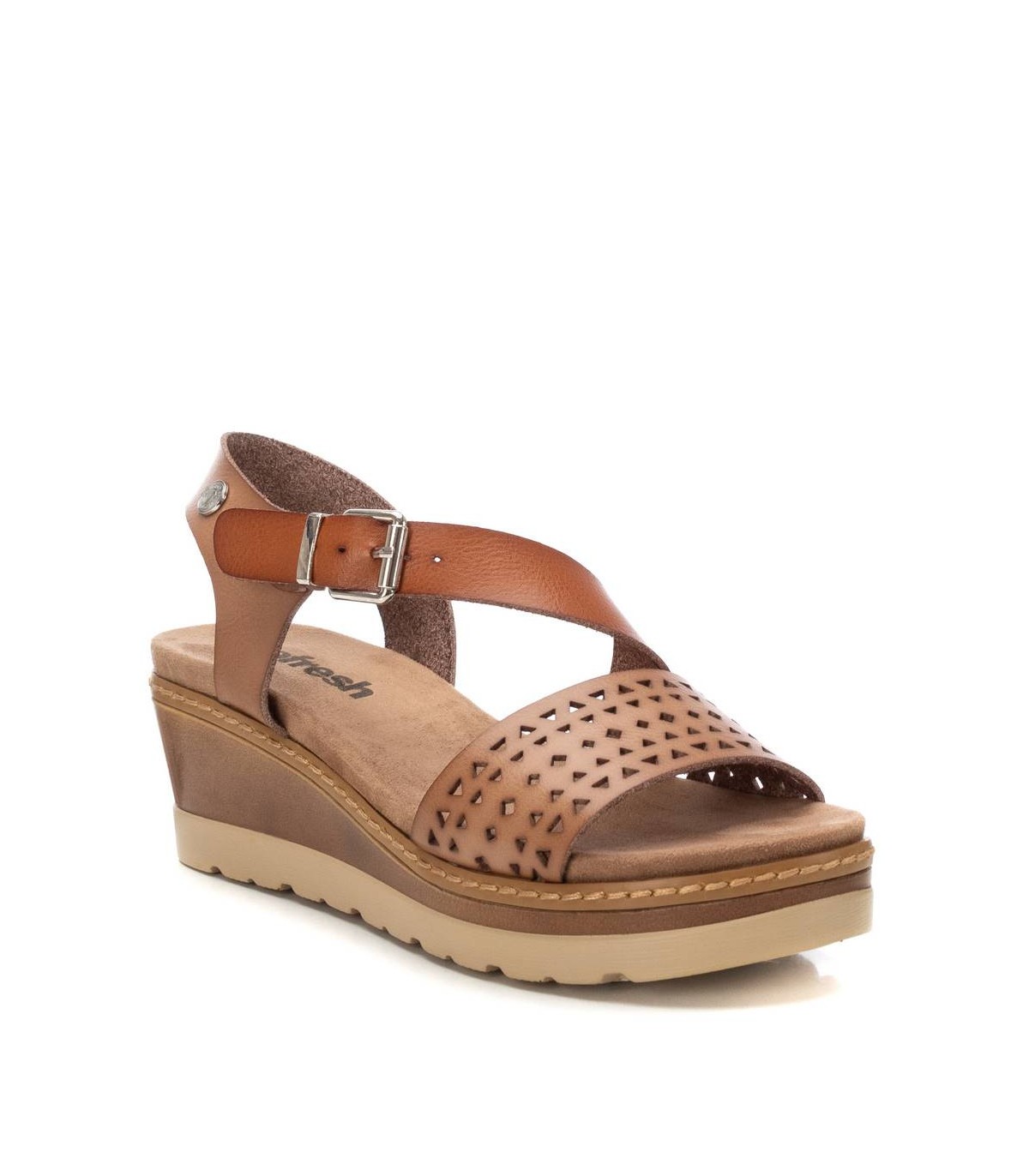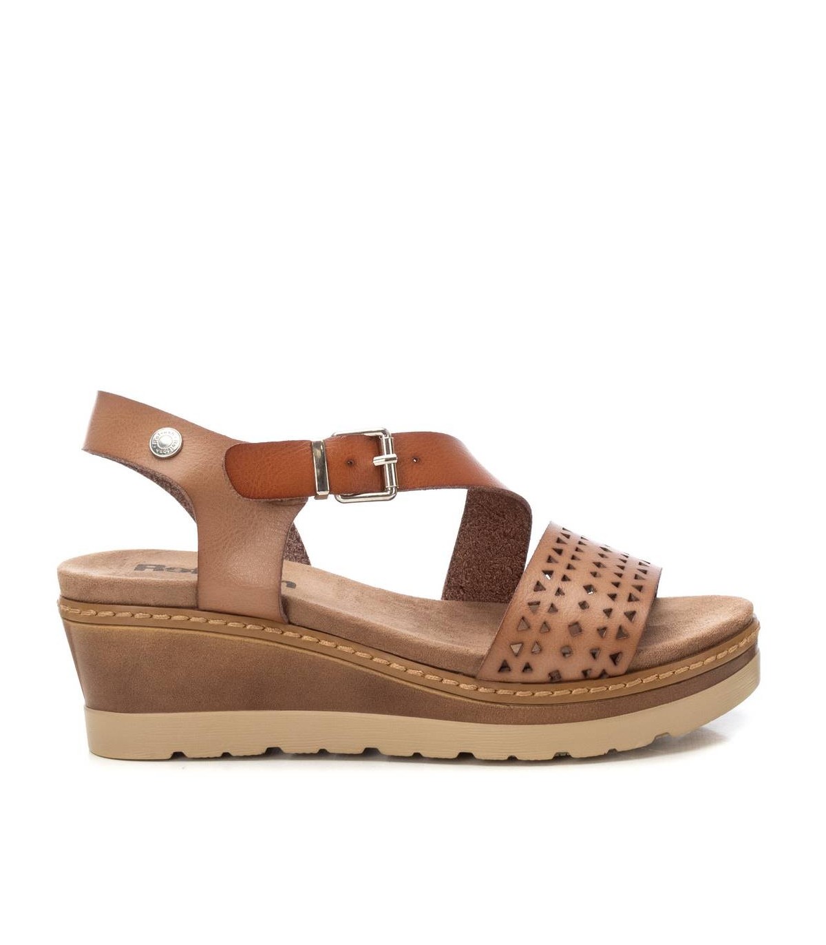 Sandalia de mujer de la marca Refresh. Fabricada en material que imita la piel con detalle calado. Correa cruzada con hebilla para un buen ajuste al pie. Cuña de 8 cm con plataforma. Suela de goma. Este modelo ha obtenido el certificado vegano por la organización mundial PETA (Organización de los derechos de los animales).