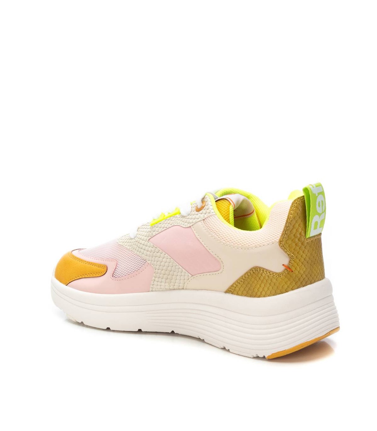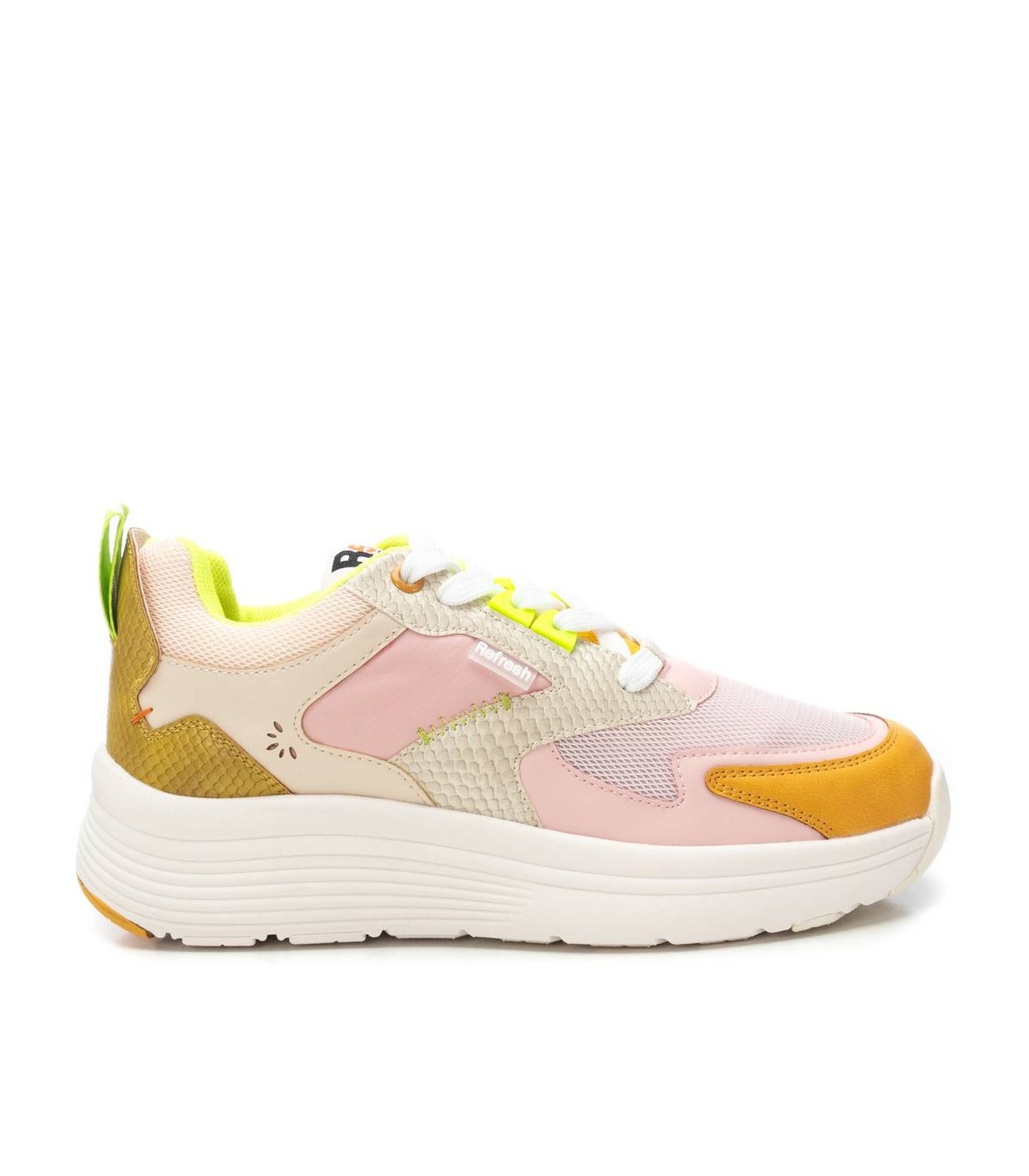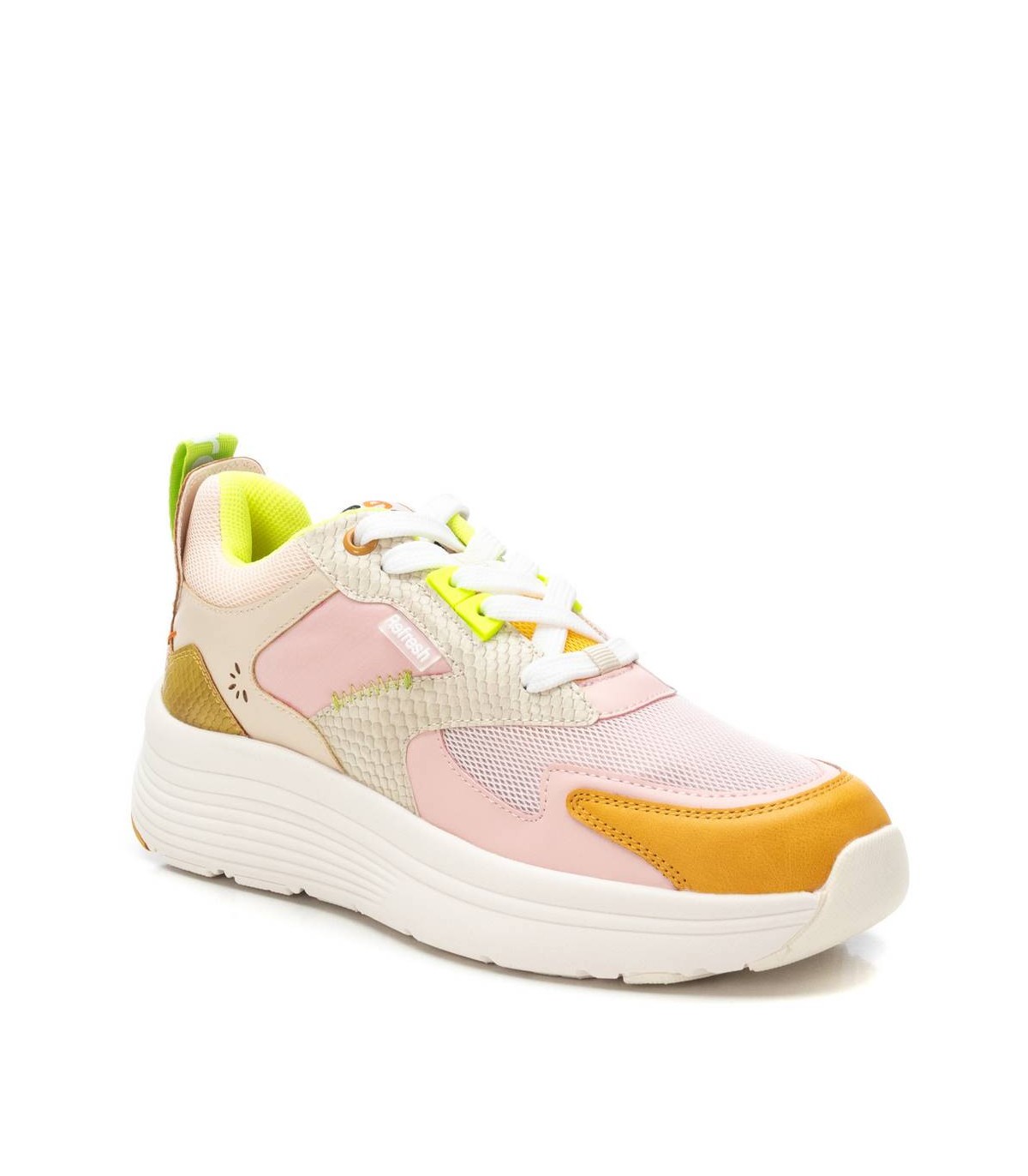 Zapatilla de mujer, de la marca Refresh. Fabricada en material que imita la piel combinado con textil. Cierre mediante cordones ajustables. Tirador trasero que facilita la puesta. Piso volumen con suela de goma antideslizante. Con plantilla extraíble. Este modelo ha obtenido el certificado vegano por la organización mundial PETA (Organización de los derechos de los animales).