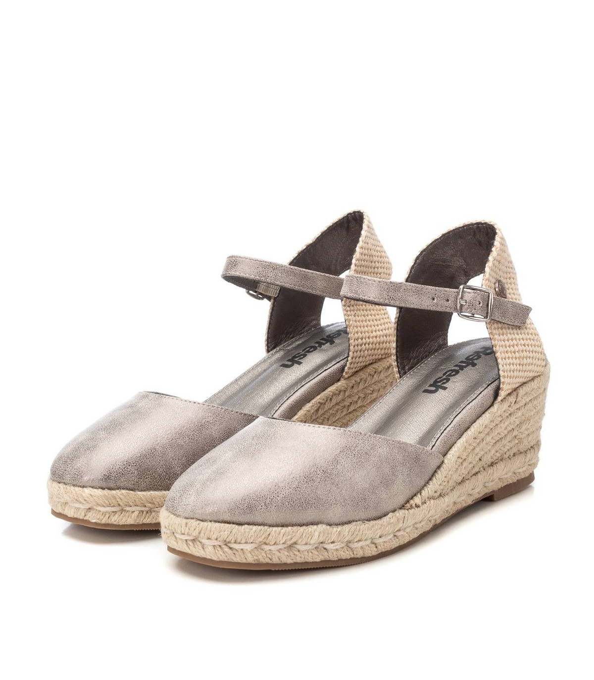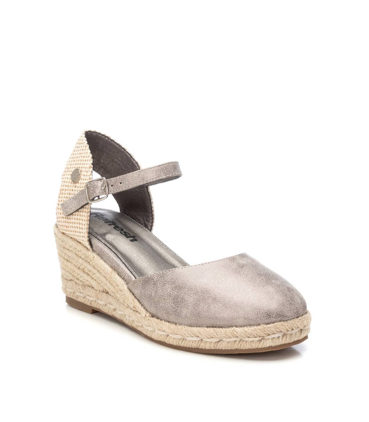 Alpargata tipo valenciana de mujer, de la marca Refresh. Fabricada en material que imita la piel con efecto metalizado. Pulsera al tobillo con hebilla. Cuña de 5cm de yute y suela de goma antideslizante. Este modelo ha obtenido el certificado vegano por la organización mundial PETA (Organización de los derechos de los animales).
