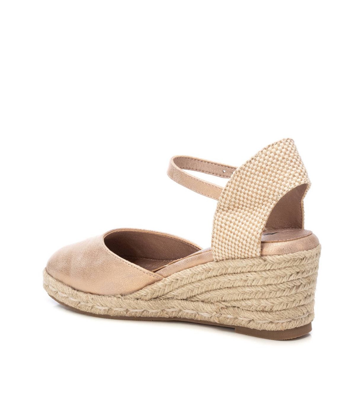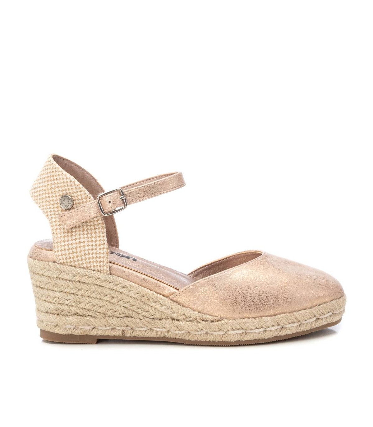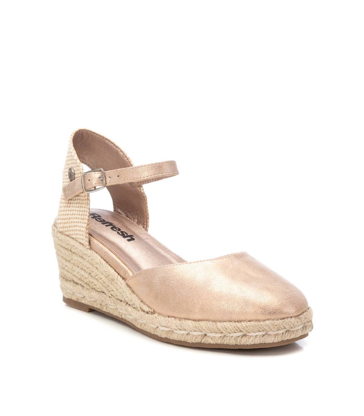 Alpargata tipo valenciana de mujer, de la marca Refresh. Fabricada en material que imita la piel con efecto metalizado. Pulsera al tobillo con hebilla. Cuña de 5cm de yute y suela de goma antideslizante. Este modelo ha obtenido el certificado vegano por la organización mundial PETA (Organización de los derechos de los animales).