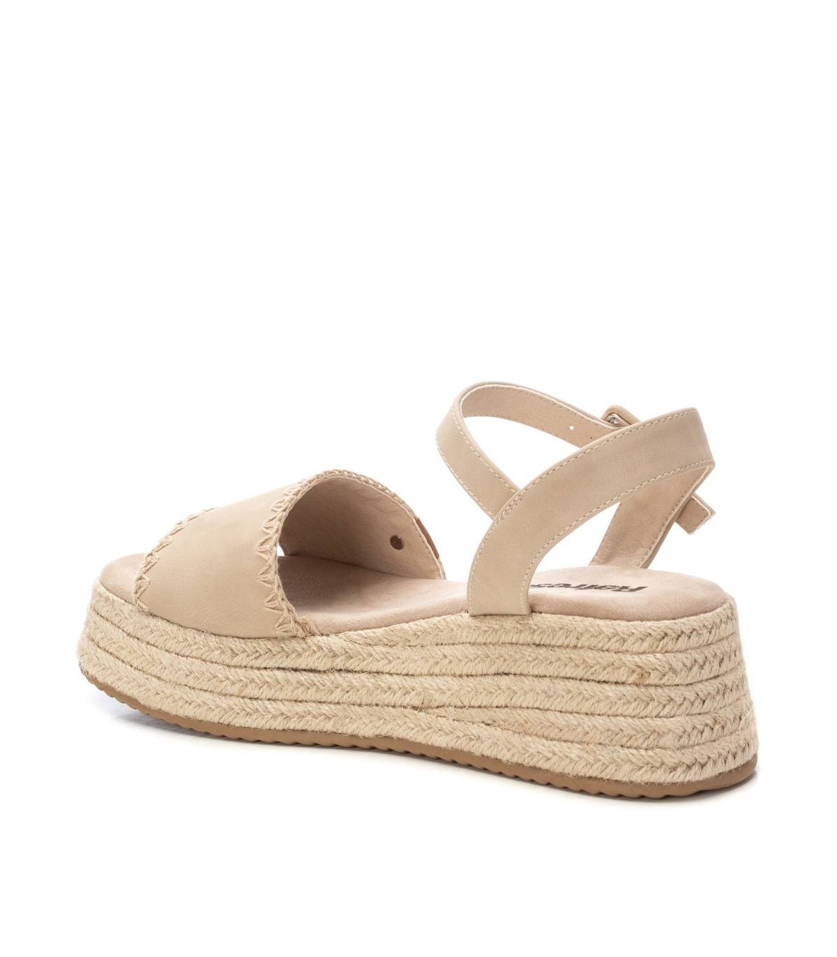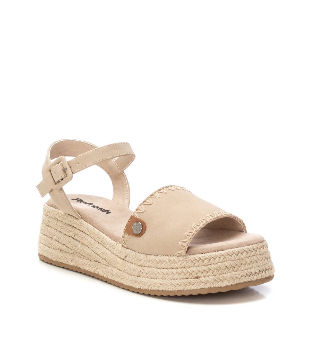 Sandalia de mujer, de la marca Refresh. Fabricada en material que imita a la piel. Diseño de pala ancha delantera y pulsera trasera con hebilla forrada del mismo material. Planta acolchada. Plataforma de 6 cm recubierto con tiras de yute. Con suela de goma. Este modelo ha obtenido el certificado vegano por la organización mundial PETA (Organización de los derechos de los animales).