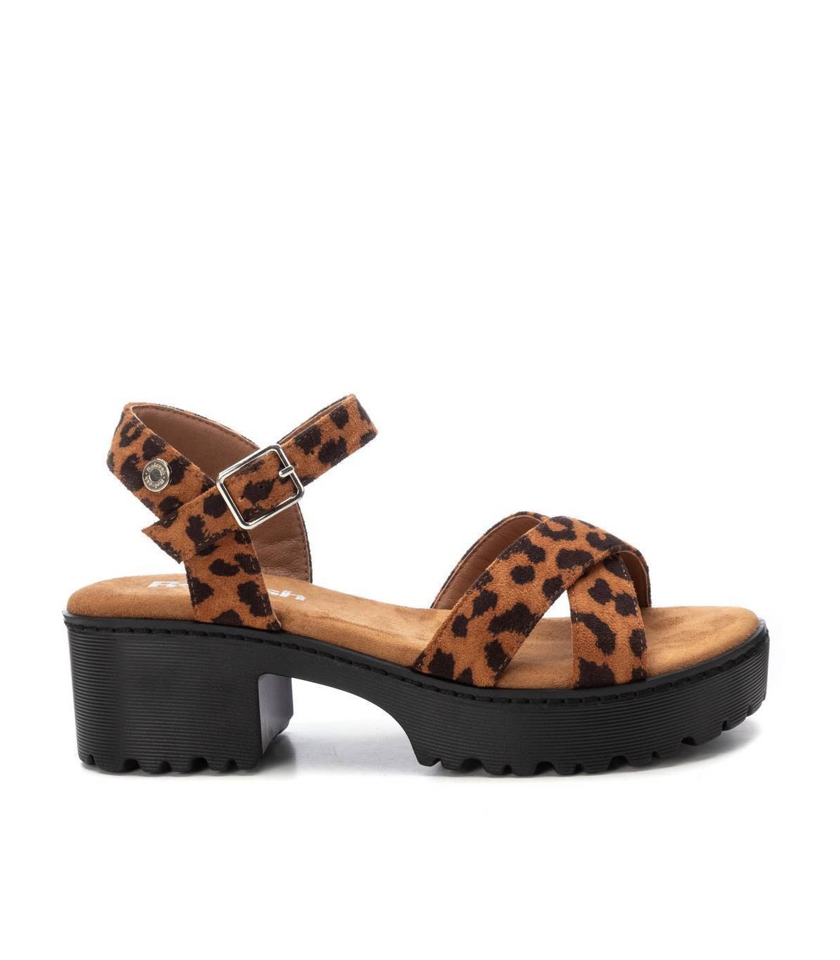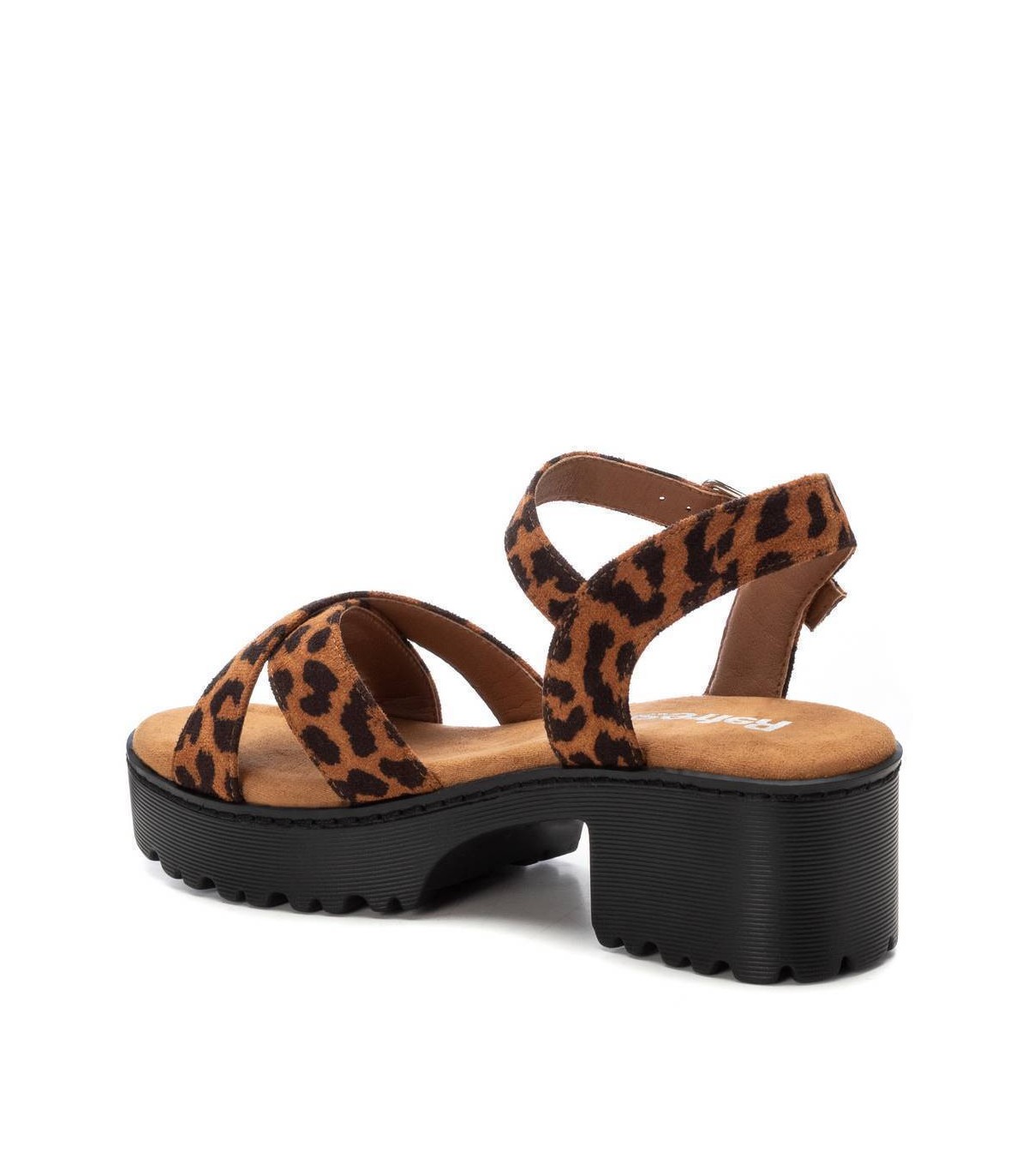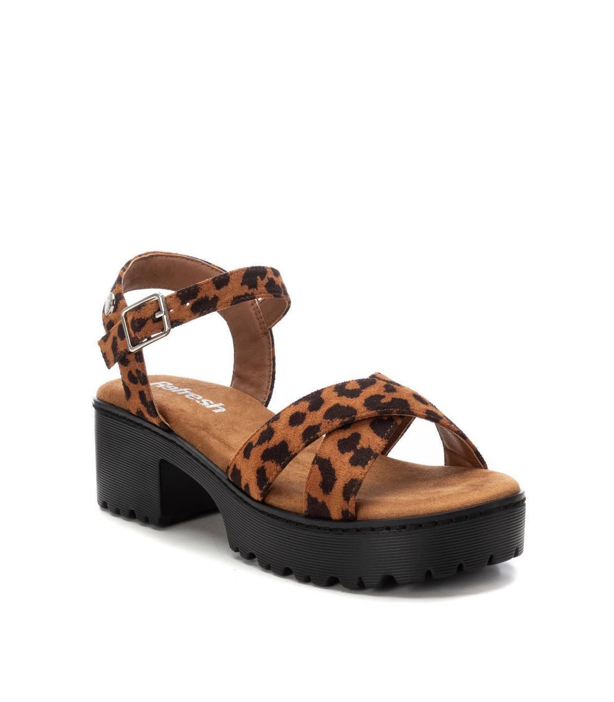 Sandalia de mujer con tacón de goma de 5 cm de alto, de la marca Refresh. Fabricada antelina con estampado leopardo. Pulsera con hebilla metalizada para ajustar al tobillo. Con un cómodo tacón con plataforma de goma para que sientas la comodidad allá donde vayas. Este modelo ha obtenido el certificado vegano por la organización mundial PETA (Organización de los derechos de los animales).