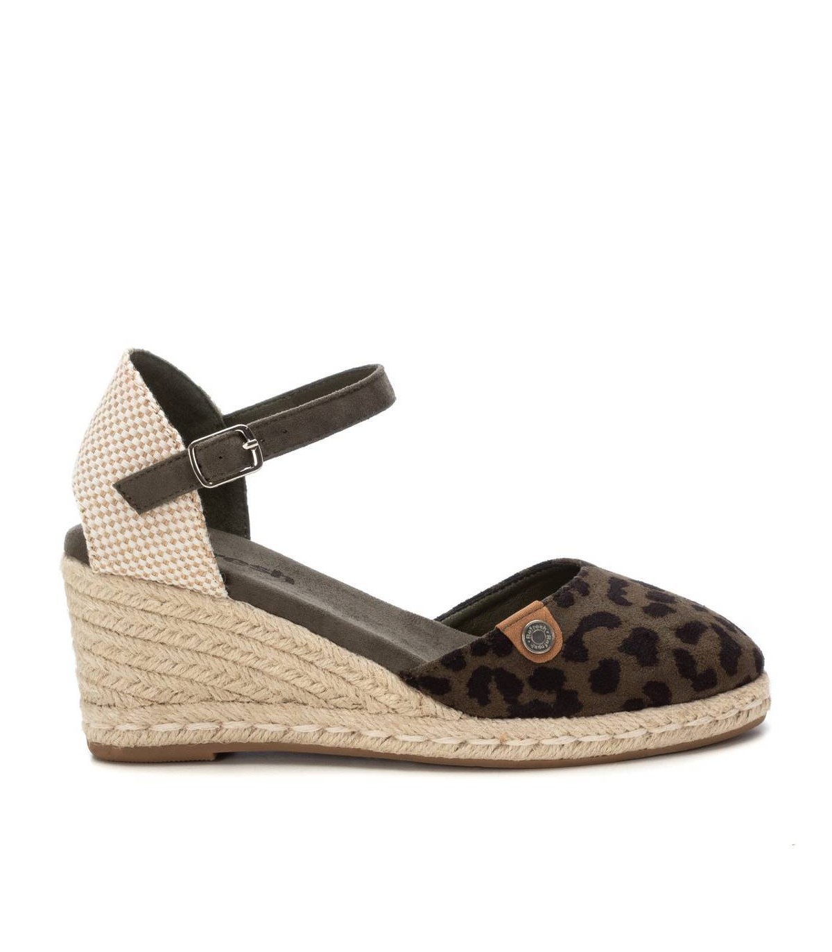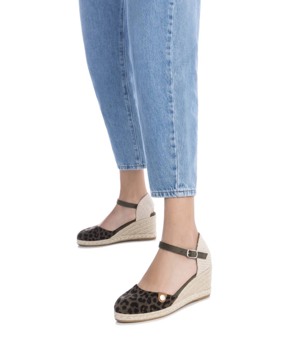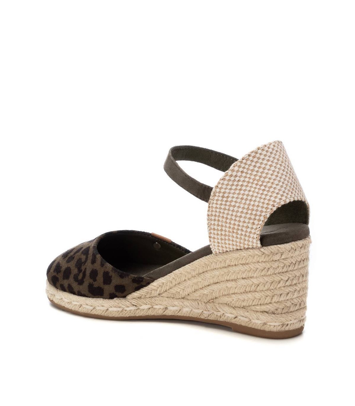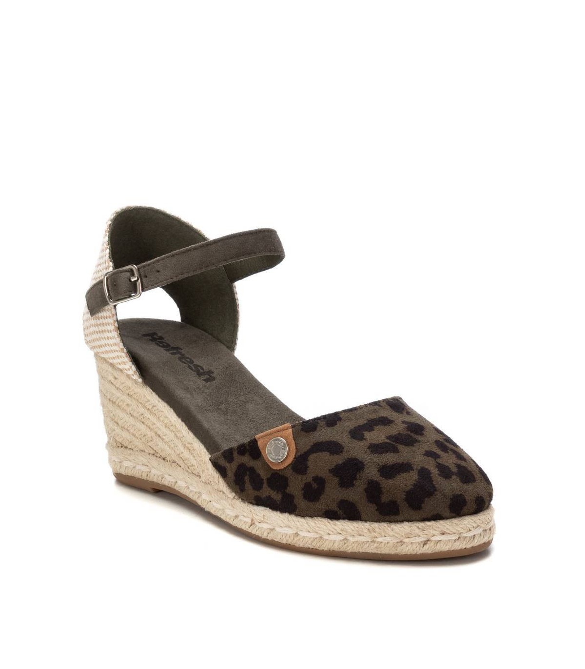 Valenciana de mujer, de la marca Refresh. Fabricada en antelina con estampado leopardo. Talón destalonado. Pulsera en antelina con hebilla para ajustar al tobillo. Cuña de 7 cm en yute y suela de goma antideslizante. Este modelo ha obtenido el certificado vegano por la organización mundial PETA (Organización de los derechos de los animales).