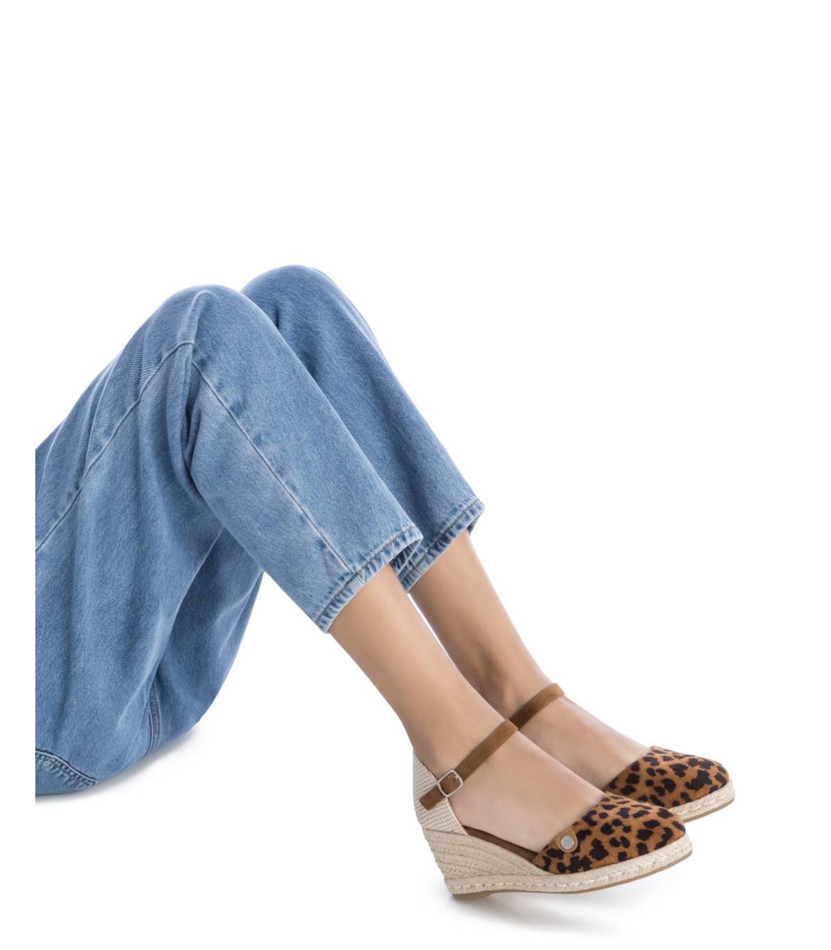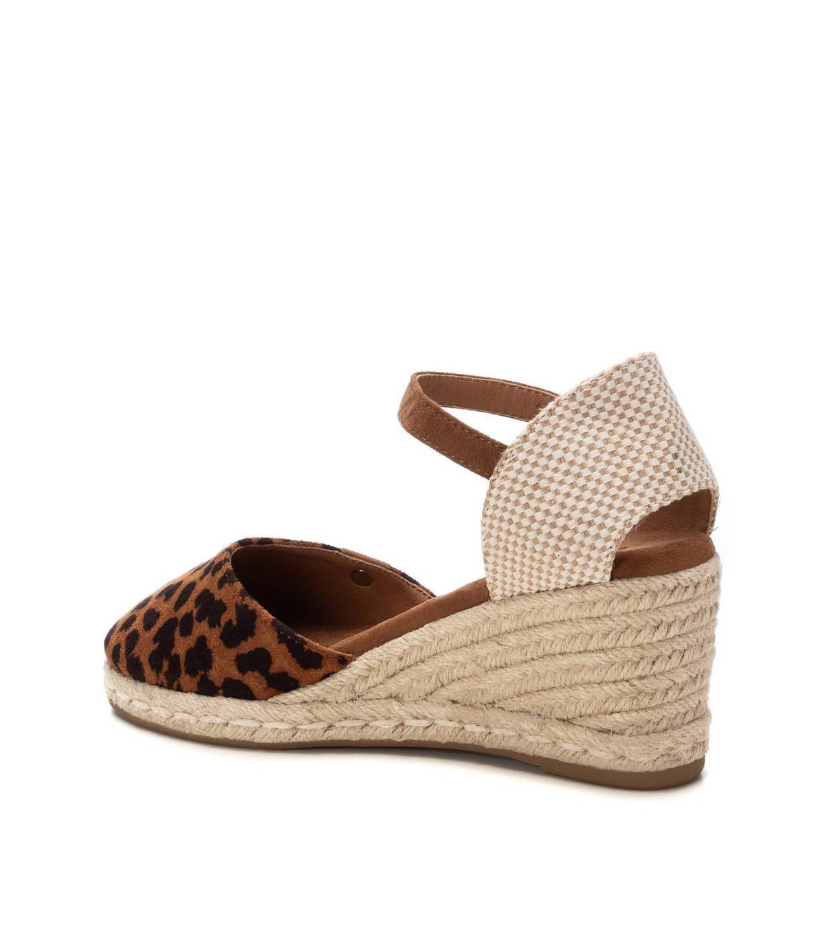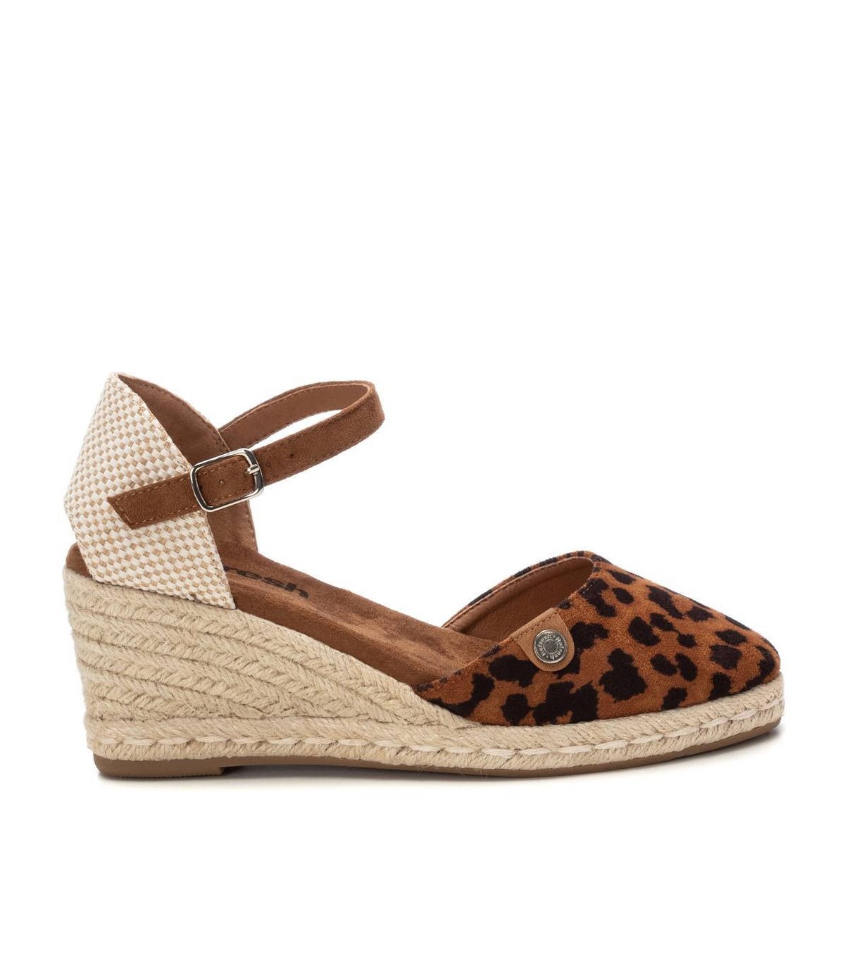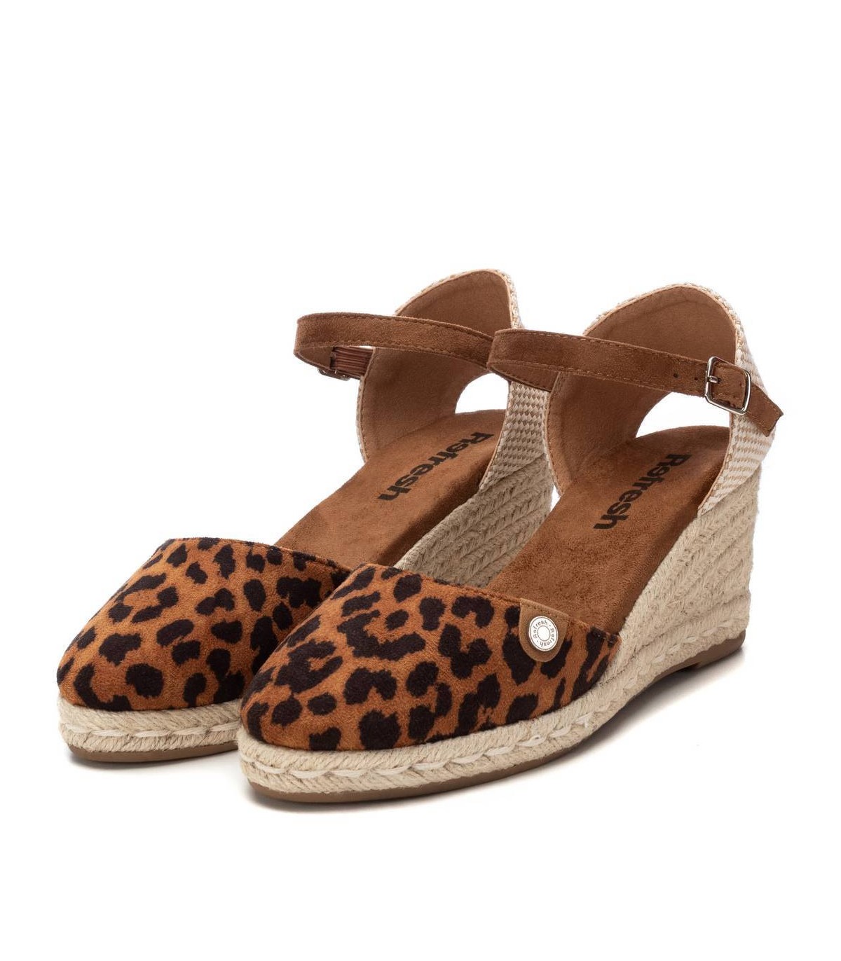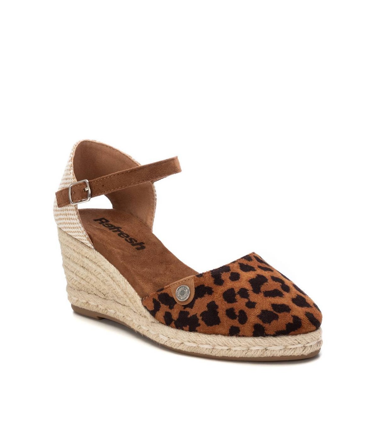 Valenciana de mujer, de la marca Refresh. Fabricada en antelina con estampado leopardo. Talón destalonado. Pulsera en antelina con hebilla para ajustar al tobillo. Cuña de 7 cm en yute y suela de goma antideslizante. Este modelo ha obtenido el certificado vegano por la organización mundial PETA (Organización de los derechos de los animales).