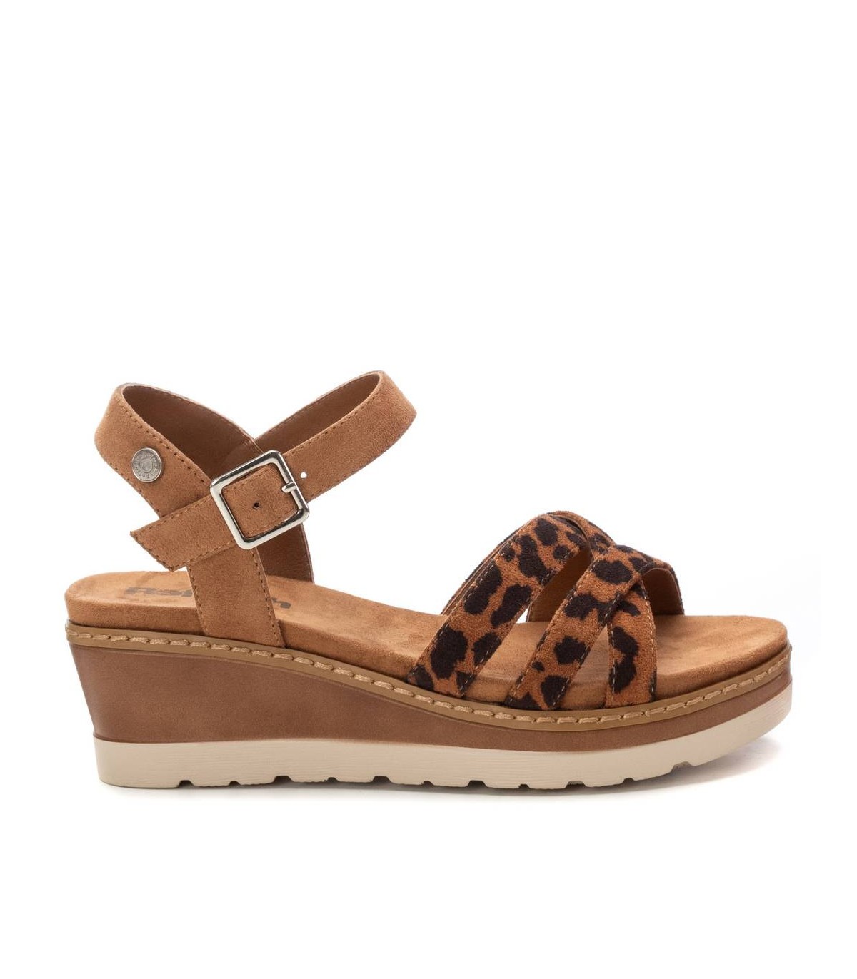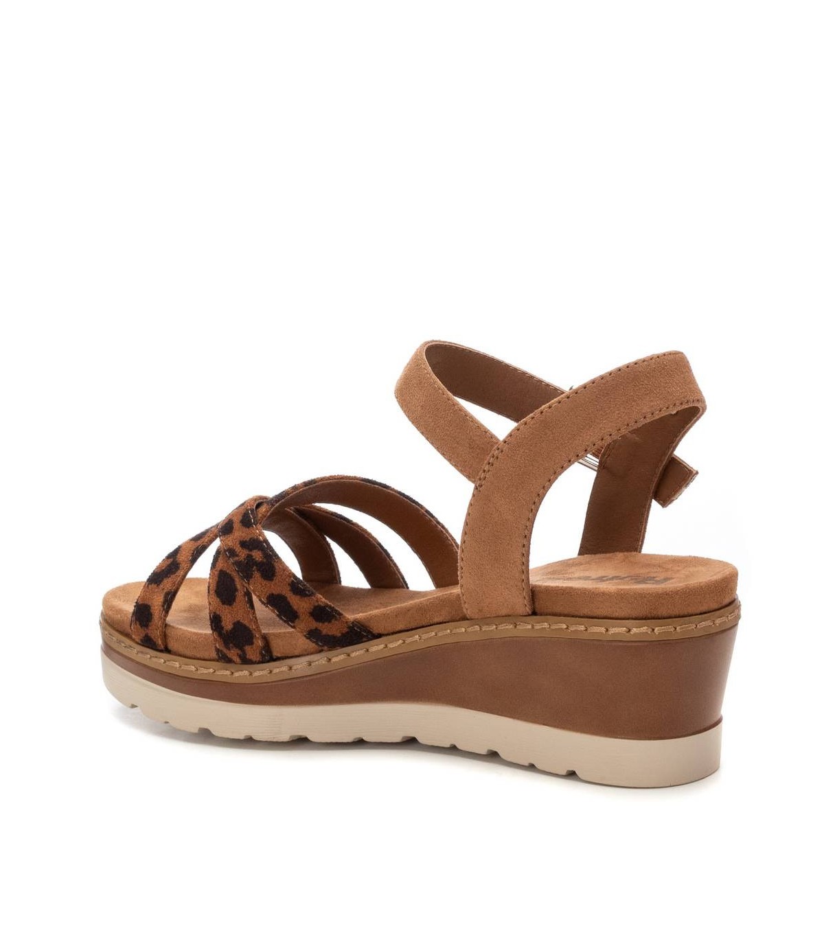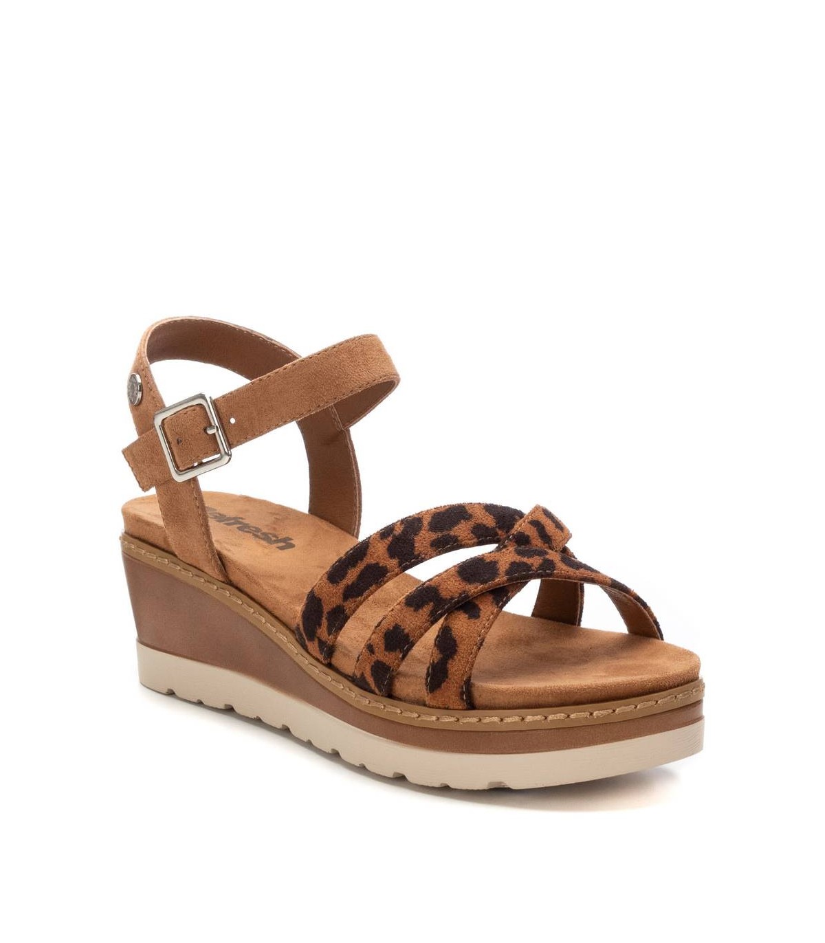 Sandalia de mujer, de la marca Refresh. Fabricada en antelina con estampado leopardo. Diseño de pala multitiras con pulsera que ajusta el tobillo. Cómoda planta acolchada. Cuña de 6 cm con suela de goma antideslizante. Este modelo ha obtenido el certificado vegano por la organización mundial PETA (Organización de los derechos de los animales).
